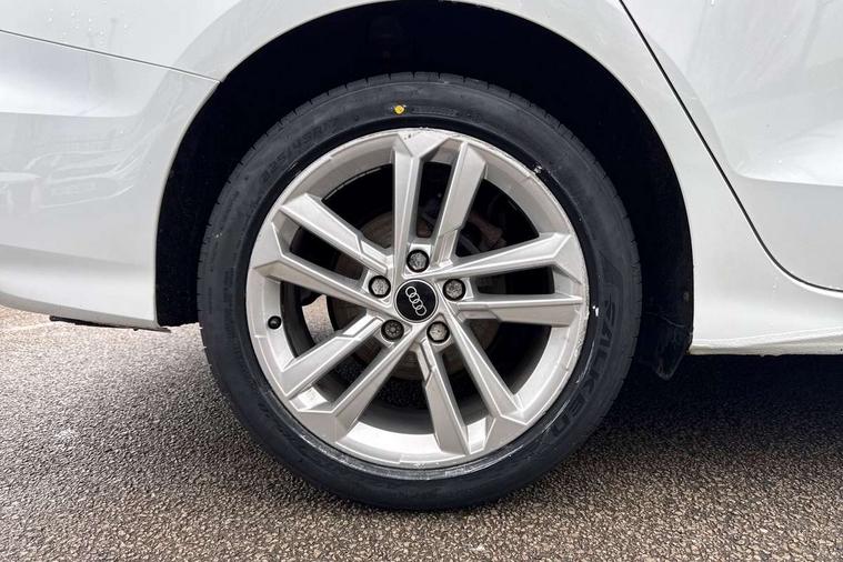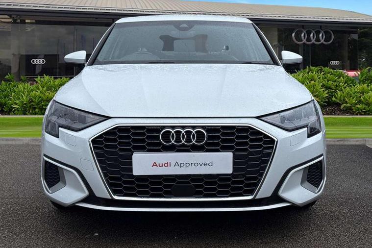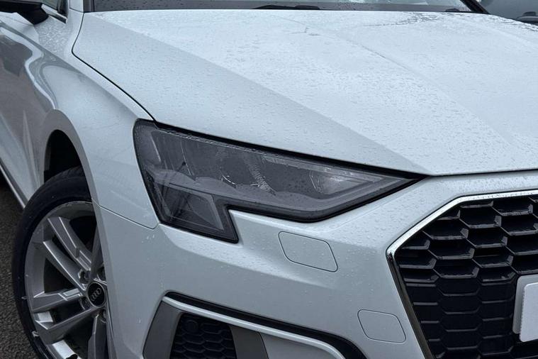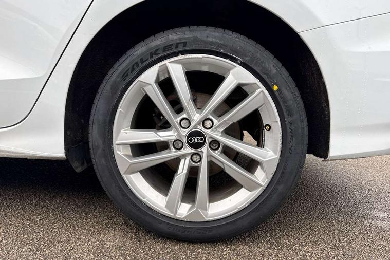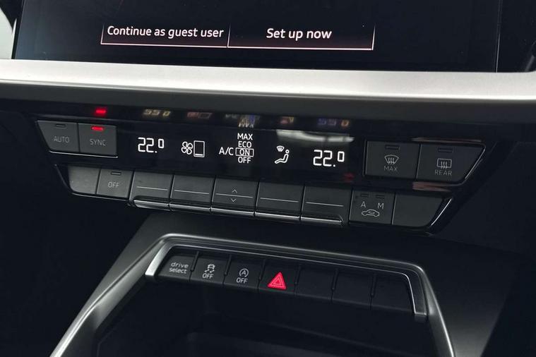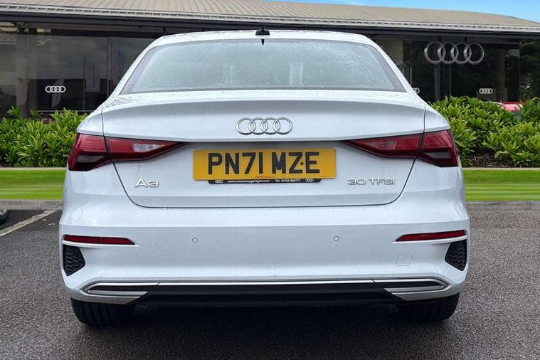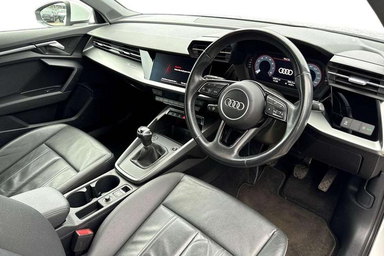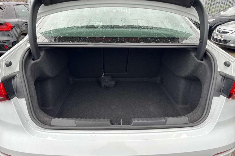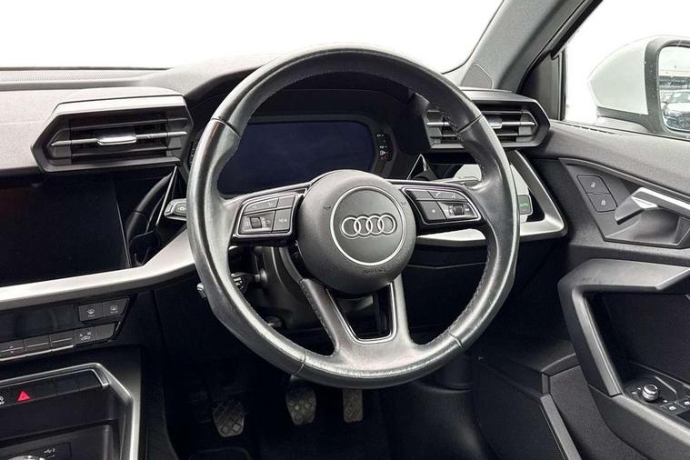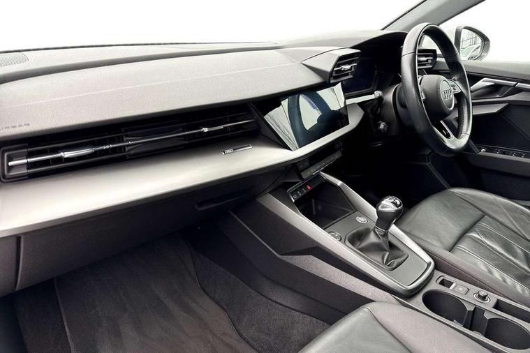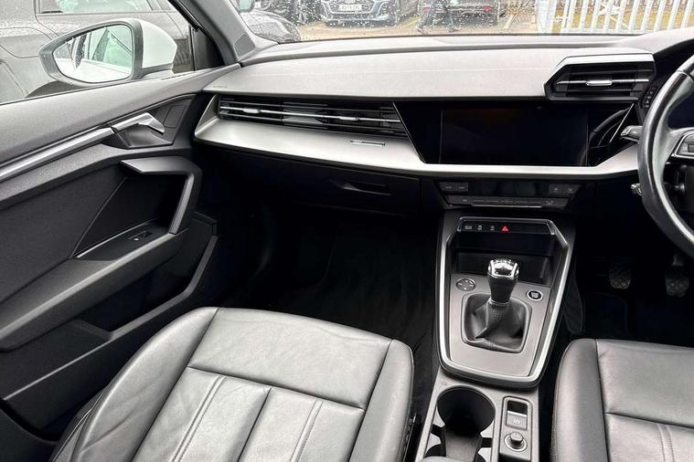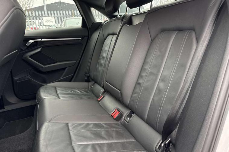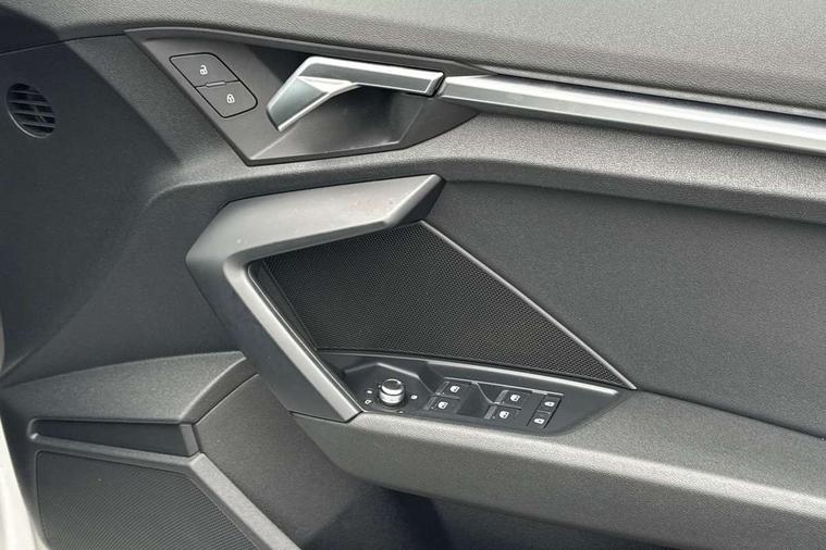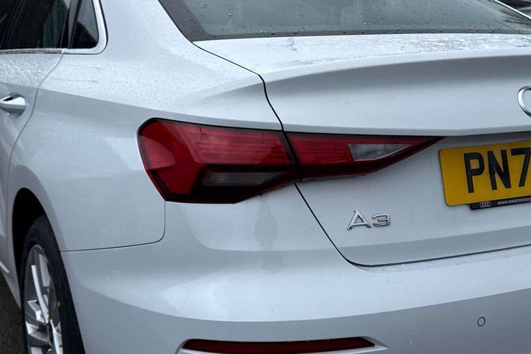 Aluminium air vent surrounds, Aluminium trim elements, Inlays with silk effect paint in platinum grey, Aluminium interior elements pack - A3 Saloon, Sport styling pack - A3 Saloon, Anti theft alarm, Anti-theft wheel bolts, Electronically operated child lock, Immobiliser, Remote control central locking, 6 passive loudspeakers, CD player, DAB Digital radio, 3x3 point rear seat belts, Driver and front passenger airbag with passenger airbag deactivation, Electronic Stabilisation Control (ESC) including ABS, ASR and EDL, First aid kit with warning triangle and 2 safety vests, Front side airbags with head airbags and interaction airbag, Hill hold assist, Pre-sense front with pedestrian and cyclist detection, Seatbelt monitoring, Tyre pressure loss indicator, 3rd brake light, Acoustic glass windscreen, Aluminium window trim, Auto dimming frameless rear view mirror, Body colour exterior mirrors, Body colour roof spoiler, Electrically adjustable/heated/folding/dimming door mirrors with kerb view includes integrated LED indications + kerb view function for passenger side, Front electric windows, LED daytime running lights, LED headlights and halogen rear lights, Light and rain sensors, Model and engine designation badges at rear, Rear electric windows, Rear window, rear door windows and rear side windows in clear glass, 12V socket and storage compartment in front centre console, 40/20/40 split folding rear seat bench with cupholder, Dual zone electronic climate control, Front and rear headrests, Front centre armrest, Front door sill trims with aluminium inlay, Front/rear floor mats, Height and reach adjustable steering wheel, Interior lighting - Front and rear roof module including reading lights, glove compartment light and right hand side, Luggage compartment floor covering, Manual boot compartment lid, Manually adjustable front seats, Seat side bolsters, Steel grey cloth headlining, Twin leather upholstery, 2x USB Type C ports (for charging and data transfer), Audi connect emergency call and service, Audi drive select (Auto, Comfort, Dynamic and Individual), Audi smartphone interface, Audi Virtual Cockpit - 10.25" digital and colour instrument cluster, Automatic start/stop system with recuperation, Bluetooth interface, Collision avoidance assistant, Cruise control + speed limiter, Electromechanical power speed sensitive steering, Lane departure warning system, MMI Navigation Plus with high resolution 10.1" colour touch screen display, Rear parking sensors, Service indicator, Voice control system with natural language interaction, Standard suspension,