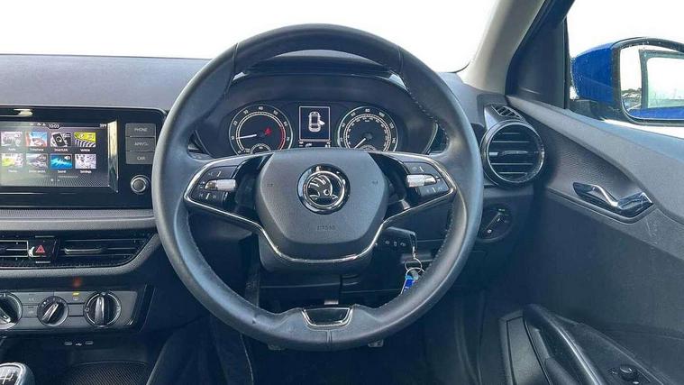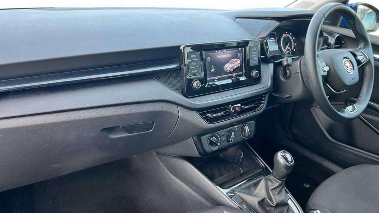 Bluetooth connection, Driver alert system - DAS, Electromechanical power steering, Exterior temperature gauge, Lane assist including road edge detection, Multifunction trip computer in black and white, Service interval indicator, Speed limiter, 2x USB-C in the front (for data transmission and charging), 4 speakers in front, Auxiliary socket for external MP3 player, DAB digital radio reception, Radio Swing with 6.5" colour display, Basic LED Headlights, Basic rear lights, Body colour door mirrors, Body coloured bumpers, Dimming rear view mirror with black frame, Door mirror integrated indicators, Electrically adjustable and heated door mirrors, Electrically adjustable front windows with function auto up/down, Front fog lights, Front window wiper intermittent control, Headlight range control - Automatic, Ice scraper in fuel cap, LED daytime running lights with coming and leaving home feature, Mechanical adjustable rear windows, Rain sensor, Rear LED fog light, Rear side wing doors, Rear window wiper with washing nozzles, Roof mounted spoiler, SKODA tailgate lettering in chrome, Third brake light, 2 reading lights in front and 2 reading lights in rear, 2 spoke leather multifunction steering wheel, 3 rear headrests, Backrest split and folding, Central console with fixed cup holder and storage box, Chrome handbrake release button, Fabric upholstery, Gearshift knob/handle in leather, Grain satin black interior door handles, Hand brake lever handle in leather, Height adjustable front headrests, Height adjustable front seats, Height adjustable steering wheel, ISOFIX and TopTether anchorage points to the outer rear seats, ISOFIX and TopTether on the front passenger seat, Luggage compartment lighting, Manual air conditioning, Manually adjustable lumbar support in front seats, Pollen filter, Rear seat bench unsplit, Single front passenger seat, Storm grey headlining, Sun visors with mirror and airbag label on passenger side, Ticket holder, 3-point height adjustable front seats belts with pretensioner and force limiter, Automatic warning lights in case of crash, Driver and passengers airbag with switch off function, e-Call+, ESC including ABS, MSR, ASR, EDS, HBA and XDS, Front and rear seat belt warning, FRONT ASSIST (AEB City and AEB Inter Urban), Front side airbags, Head airbags, One tone horn, Pedestrian protection, Three rear 3-points safety seat belts with pretensioner and force limiter including stop function for outer rear seat belts, Tyre pressure monitoring system, Anti-theft alarm system including immobiliser, interior monitoring, backup horn, and towing protection, Central locking with radio remote control, interior controls, SAFE function and 2 foldable keys, Black painted air vents, Glossy black decorative trim, Grain satin black central console cover, Grain satin black lower decorative trim, Satin black door and side trim panel in front, Anti-theft wheel bolts protection, Super-low rolling resistance tyres,