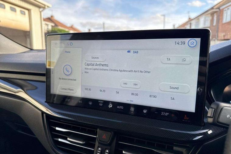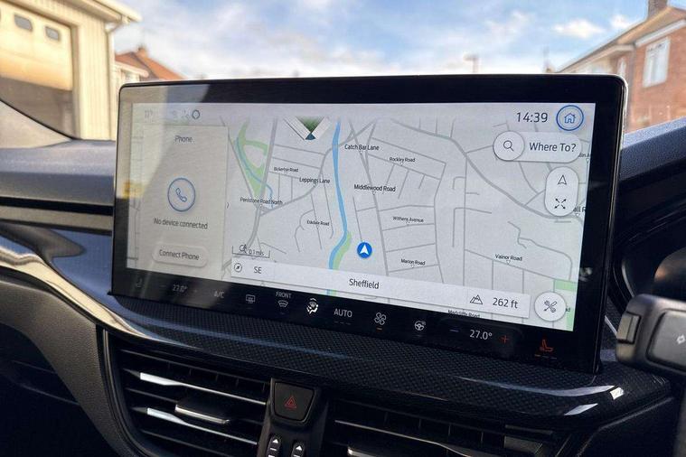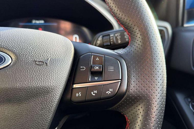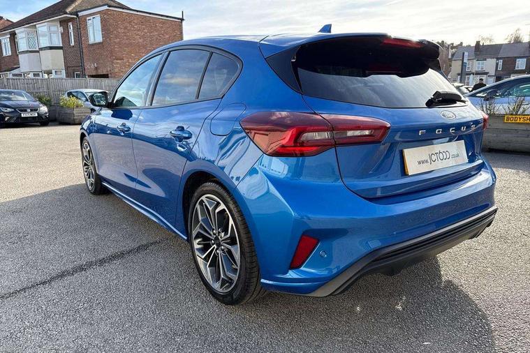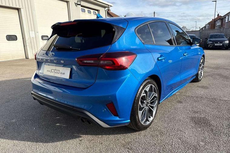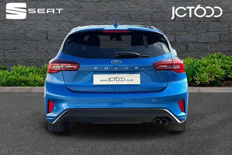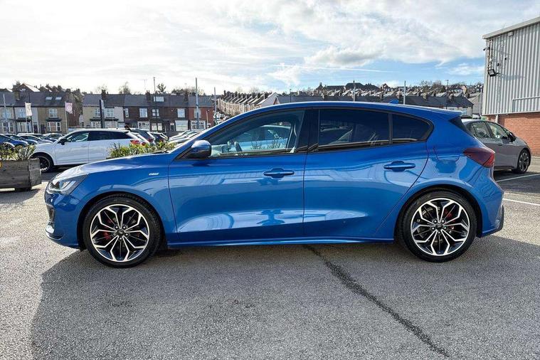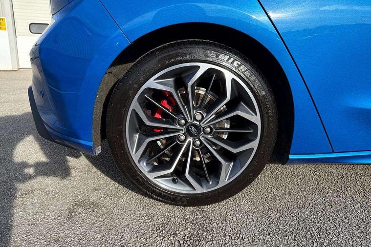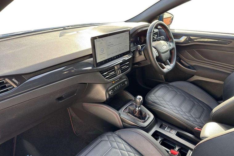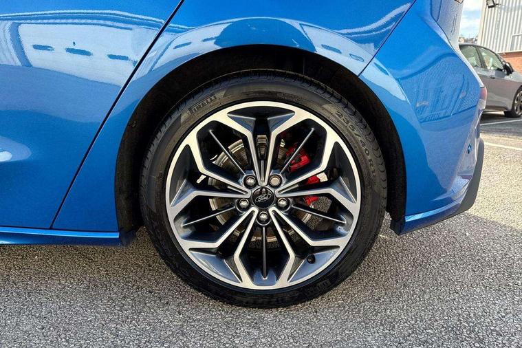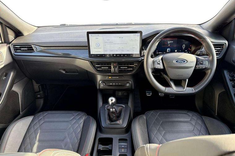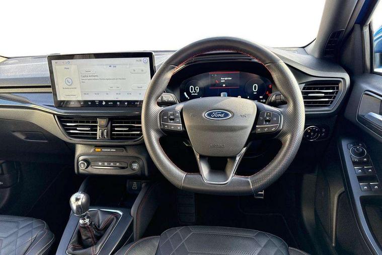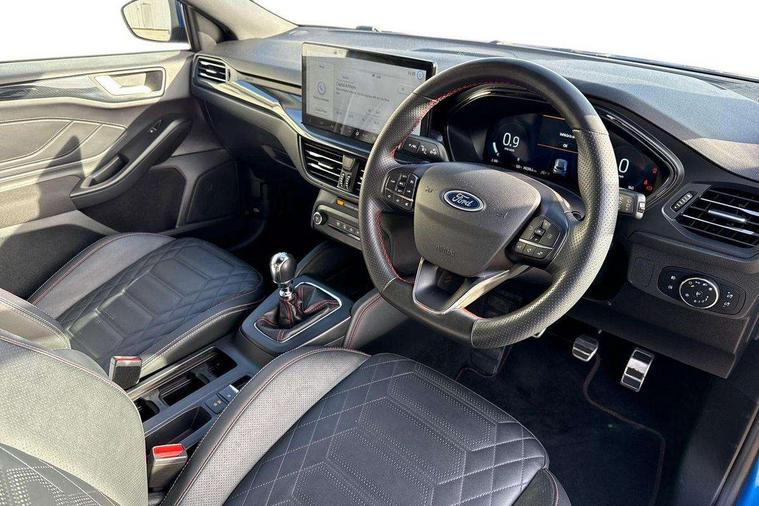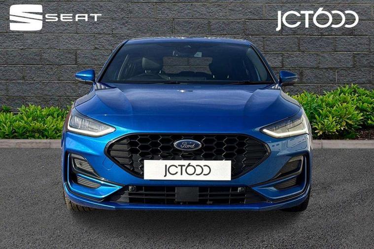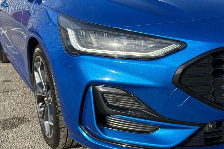 12.3" Digital instrument cluster, Bluetooth system, Digital clock, Easy fuel capless refuelling system, Eco mode, Ford SYNC4 Nav with 13.2'' touchscreen, DAB, Emergency Assistance, Apple Carplay & Android Auto, B&O Premium Audio with 10 speakers, FordPass Connect, Lane keeping system - lane keeping alert and lane keeping aid, PAS, Rev counter, Selectable drive mode, Service interval indicator, Trip computer, Wireless charging pad, Sports tuned suspension, 2 USB ports, Auto headlamps (on/off), Body coloured door handles, Electrically operated front and rear windows with one touch opening and closing, Electrically operated heated power fold door mirrors with puddle lamp with side indicators, Front variable intermittent wipers with electric wash, Heated rear window, LED daytime running lamp, LED rear lamps, LED third brake light, Polished twin tailpipe, Privacy glass, Quickclear heated windscreen, Rain sensor, Rear side wing doors, Tailgate wash/wipe, Unique ST-Line grille, full bodystyling kit, and large body coloured rear roof spoiler, 3 rear headrests, 3 seat bench in 2nd row, Dual zone electronic air temperature control, Full sensico premium upholstery, Height adjustable front headrests, Isofix child seat preparation, Load through ski hatch, Manual 2-way passenger seat adjust, Power 4-way driver seat adjust, with power lumbar adjust, Reach + rake adjustable steering column, Single front passenger seat, ST-Line Design pack - Focus, Winter pack - Focus, 3x3 point rear seatbelts, ABS+Electronic Brake force Distribution, Auto hold function, Driver airbag, EDL traction control, Electronic parking brake, Electronic stability control, Front and rear seatbelt reminder, Front inertia reel height adjustable seatbelts with pre-tensioners, Front passenger airbag, Front side airbags, Passenger airbag deactivate switch, Post collision braking, Pre collision assist with autonomous emergency braking and pedestrian/cyclist detection, Remote/power child rear door locks, Side curtain airbags, Three rear inertia reel lap/diagonal seatbelts, Tyre pressure monitoring system, Keyless entry and keyless start, MyKey system, Remote central locking & engine immobiliser, Thatcham alarm with power door dead locks, 18" 5x3 spoke pearl grey high gloss machined finish alloy wheels with mini spare wheel,