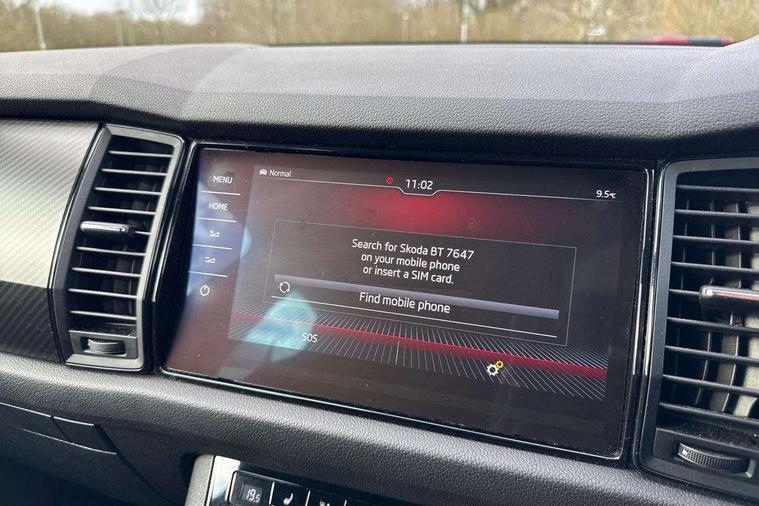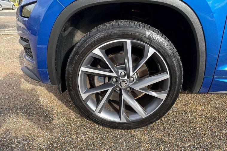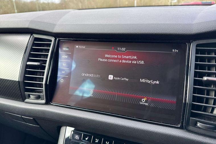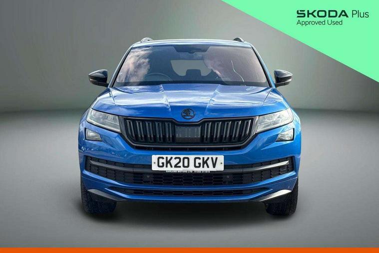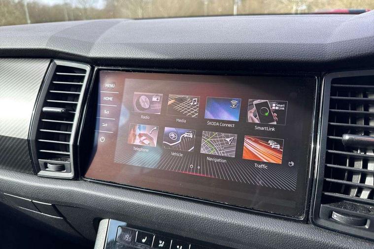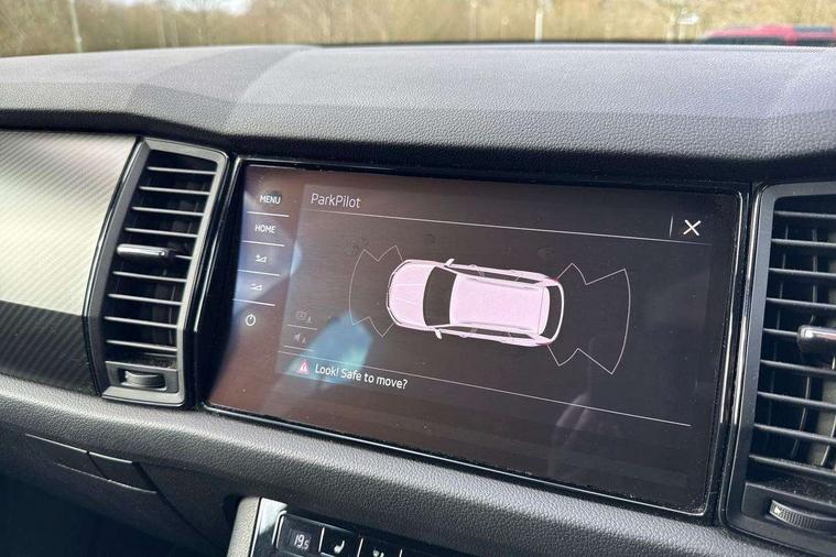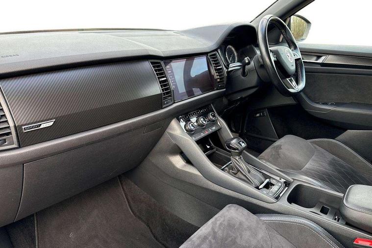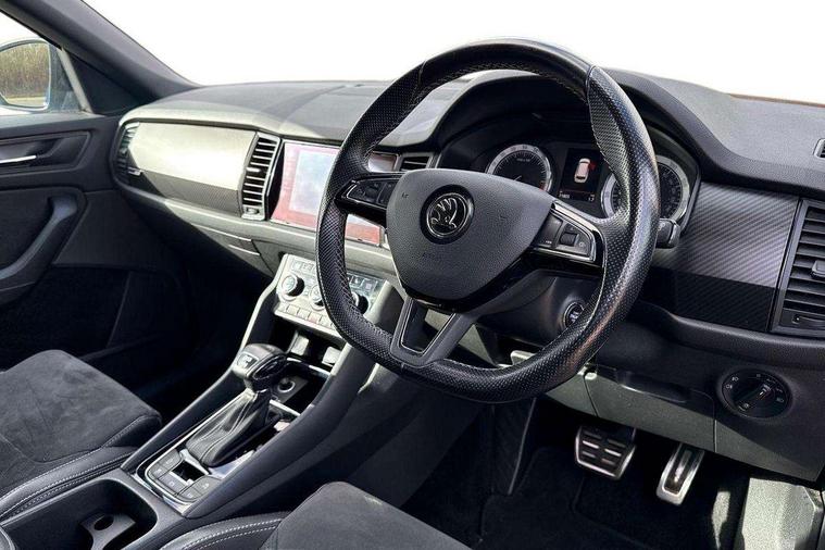 Bluetooth system, Colour multifunction trip computer, Columbus satellite navigation with 9.2" touch screen and integrated Wi-Fi + WLAN, Digital voice enhancement, ECO Stop/start function, Exterior temperature indicator, Map care, Progressive power assisted steering, SmartLink plus, Speed limiter, Sports dials, Bolero Radio, DAB Digital radio, DVD System, USB and SD card connectivity, Aero front windscreen wipers with intermittent function, Aero rear window wiper, Auto dimming rear view mirror, Automatic activation of hazard warning lights, Black electric window control buttons, Black roof rails and door mirrors with radiator grille and window surrounds, Black wheel arch surrounds, Body colour bumpers, Body colour door handles, Chrome exhaust tailpipe, Electric front and rear windows, Electrically adjustable/heated/foldable and auto dimming door mirrors with memory function, Front door steps with SportLine logo, Full LED Headlights with adaptive front light system and LED daytime running lights, Headlight washers, Heated rear window, LED front fog lights with static cornering light function, LED rear fog light, LED third brake light in rear spoiler, Light assistant (coming home/tunnel light), Rain and light sensors, Rear diffuser, Rear spoiler, Safety reflectors on front and rear doors, Sportline badge on front fender, Sports front and rear bumpers, Sunset privacy glass, Tailgate lettering in Black, Without engine designation, 12V socket in boot, 2 rails with 2 hooks including 4 hooks for net programme, 4 foldable roof handles with rear coat hooks, 4 lashing points on luggage floor, 60:40 foldable rear seat with sliding adjustment and backrest angle adjustment, Alcantara door panels, Alcantara upholstery with Sports seats with silver stitching, Aluminium pedals, Black roof headlining, Bottle holders in door panel in the 1.5 litre front and 1 litre rear, Cargo storage compartments, Centre console with open storage box, cup holder and 12V socket, Chrome headlight control button, Chrome interior door handles, Coat hooks on B pillar, Covered storage compartment on driver side, Front and rear door armrest with black adductor trim, Front centre armrest with storage compartment, Front courtesy lights, Gear shift lever with chrome frame and black gloss insert, Height adjustable front headrests, Height adjustable rear headrests, Illuminated and cooled glovebox, Illuminated luggage compartment, Isofix system on outer rear seats, Manually adjustable steering column, Net programme in boot (1x horizontal Net, 2x vertical Nets), Overhead glasses storage compartment, Pollen filter, Rear centre armrest with cupholders, Roll up luggage compartment cover with intermediate position, Small Bags on the inner sides of the front backrests, Small pockets on the inner side of the front backrests, Storage compartment in lower middle Instrument panel, illuminated with closing, Three rear height adjustable headrests, Ticket holder on A Pillar, Umbrella in door panel, LED Interior Light pack - Kodiaq Scout/Sport Line/VRS/Laurin + Klement, Auto door release and activation of warning lights, Driver and passenger airbags, Electronic parking brake with hill hold control, Emergency rear braking signal, ESC (incl. ABS+MSR+ASR+EDS+HBA+DSR+RBS+MKB), Front and rear three point safety belt on all seats, Front assist includes AEB city/urban, Front side airbags, Fuel cut off safety device, Head and knee airbags, Passenger airbag deactivate switch, Rear disc brakes, Safety vest holder in door, Seat belt reminder for all seats, Tailgate unlocking from outside, Two tone horn, Tyre pressure monitor, Warning lights in front doors, Alarm with interior monitoring and tilt sensor with safe function, Immobiliser, Keyless entry and start system (KESSY), Remote central locking, Carbon finish dashboard and door inserts, Chrome air vent surrounds, Sportline plaque on the dashboard, 20" Vega Anthracite alloy wheels with anti-theft wheel bolts,