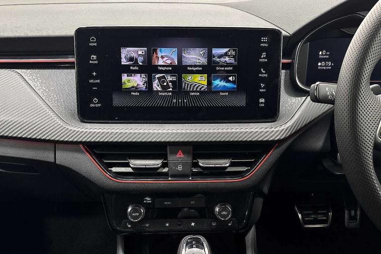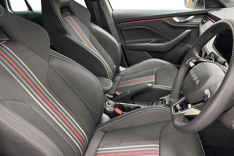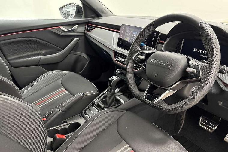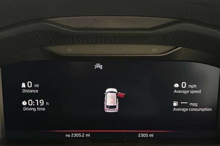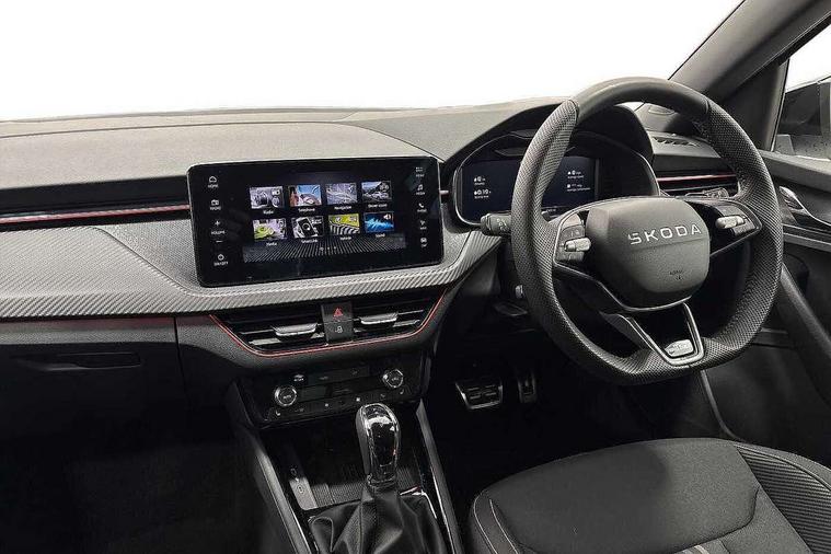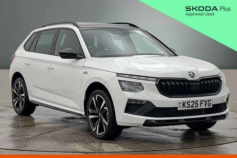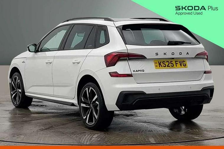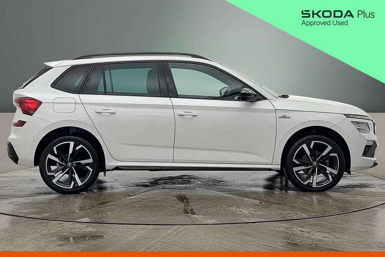 Advanced driver attention and drowsiness monitor, Bluetooth system, E-call, Front assist system, PAS, Rear parking sensors, Rear view camera, Service indicator, Speed limiter, Traffic sign recognition, Virtual cockpit with 10.25" display, Voice control system, Wireless smartlink, 4 USB C ports, 8 Speakers, 9.2" Skoda navigation display, DAB Digital radio, Auto dimming rear view mirror, Automatic headlight control with coming home and leaving home feature, Black door mirrors, Black radiator grille, Black rear diffuser, Black roof spoiler, Body colour bumpers, Body colour door handles, Boot lettering in black, Extended tailgate glass, Fixed panoramic sunroof with black roof rails, Front and rear electric windows, Heated rear window, LED daytime running lights, LED high beam, LED low beam, LED third brake light, Light sensors, Monte carlo plaque, Privacy glass, Rear side wing doors, Rear wiper, Ticket holder inside windscreen, 12V socket in luggage compartment, 3 seat bench in 2nd row, Aluminium pedals, Ambient lighting in white/red, Art leather carbon decor inserts, Art leather carbon door inserts, Black roof lining, Cargo elements, Chrome inner door handles, Driver and passenger sun visors with vanity mirror, Dual zone climate control, Front and rear roof lights, Front centre armrest, Front head restraints, Glove compartment with illumination, Height adjustable driver seat, Height adjustable front passenger seat, Ice scraper, Inner circulation control with pollen filter, ISOFIX on front passenger seat, Isofix preparation for back seats, Leather gearknob and handbrake lever, Manual lumbar support for front seats, Monte Carlo cloth upholstery, Net package and top tether hooks in boot space, Net under rear shelf, Pocket on the back of both front seats include mobile phone pockets, Rake/reach adjustable steering wheel, Reading lights, Rear centre armrests, Red hotstamping, Single front passenger seat, Sports seats, Textile floor mats, Third rear headrest, Top tether for front passenger seat, Umbrella in driver's door, Light and view plus package - Kamiq, 3x3 point rear seatbelts, Airbags - driver and front passenger, Disc brakes, ESP, Extended and predictive pedestrian/cyclist protection, Front passenger airbag deactivation switch, Front side airbags with curtain airbags, Hill hold control, Manual leather parking brake, Manual rear child locks, One tone horn, Seatbelt reminder for driver an co-driver, Traction control, Tyre pressure monitor, Anti-theft alarm system with interior monitoring, backup horn, towing protection and remote central locking with SAFE system, Anti-theft wheel bolts, Electronic engine immobilizer, 18" Ursa black diamond cut alloy wheels,