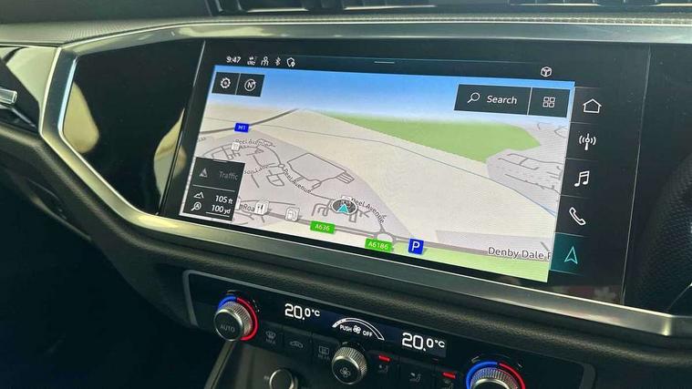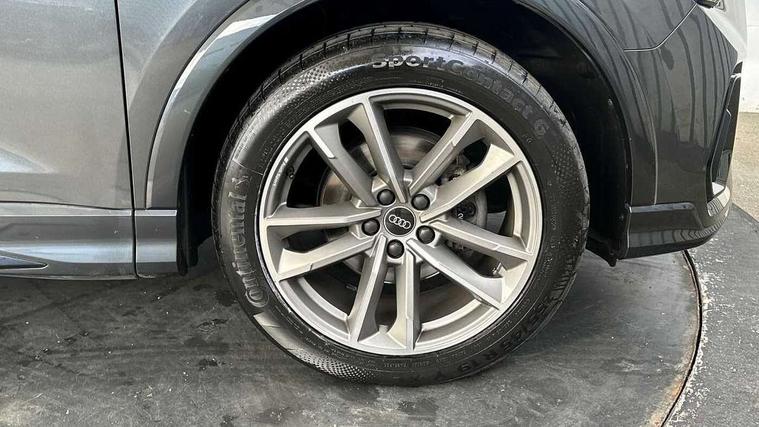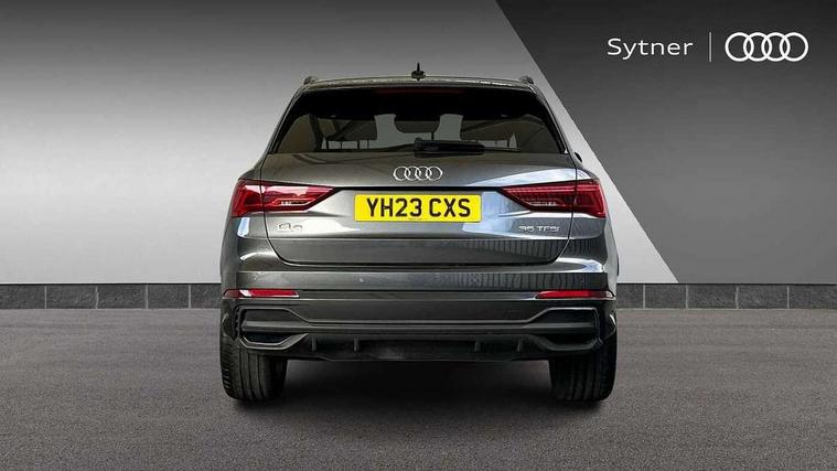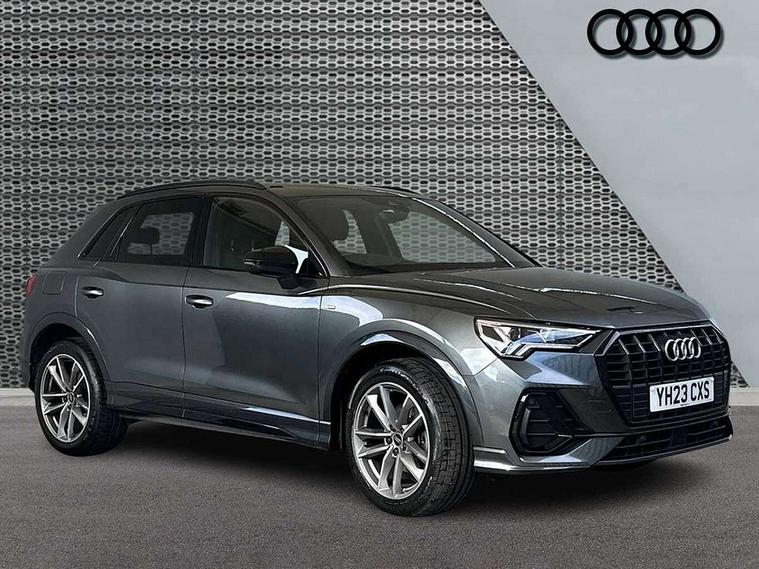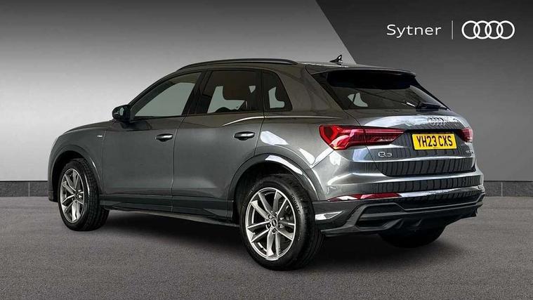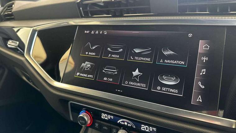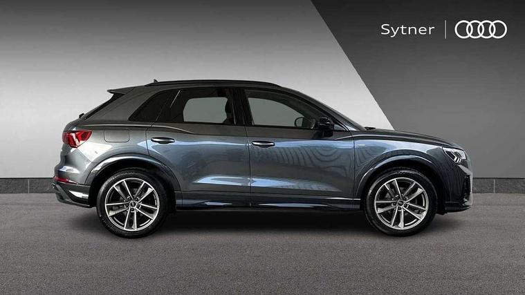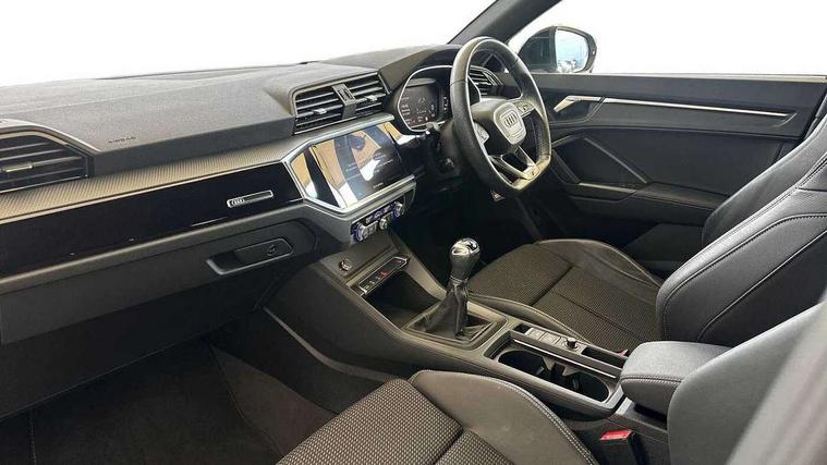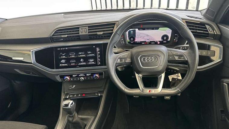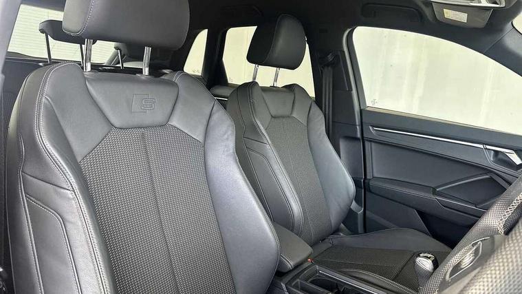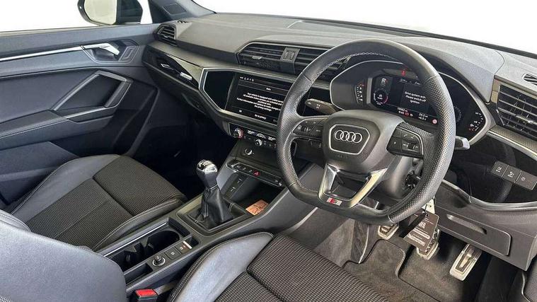 Amazon alexa Integration, Audi drive select, Audi lane departure warning, Audi Virtual Cockpit - 10.25" display, Bluetooth interface, Camera based traffic sign recognition, Cruise control + speed limiter, Legal emergency call, MMI Navigation Plus with high resolution 10.1 inch touchscreen colour display, Power operated tailgate, Progressive steering, Rear parking sensors, Service interval indicator, Smartphone interface includes wireless Apple carplay/Android Auto, Start stop system with recuperation, Voice control system with natural language interaction, Sports suspension, 2 USB-C ports with charge and data functions, 6 passive loudspeakers, DAB digital radio module, Acoustic windscreen, Auto dimming frameless rear view mirror, Black roof rails, Electrically folding, adjustable and heated door mirrors with integrated LED side indicators and kerb view function for passenger side, Front and rear electric windows, Front fog lights, Grille vertical bars in aluminium silver/Matt, High gloss black finish B and C pillars, LED Dynamic rear indicators, LED headlights with LED daytime running lights, LED rear lights, LED third brake light, Privacy glass dark tinted rear and rear-side windows (from B-pillar backwards), Rain and light sensors, Rear diffuser grille in grained matt black, Rear diffuser strip in matt anthracite black, Rear side wing doors, Rear wiper, S line bumpers in contrasting Manhattan grey, Variable front intermittent wipers, 12V socket in rear centre console, 3 seat bench in 2nd row, 3 spoke flat bottomed multi-function leather sport steering wheel, 40:20:40 folding with manual adjustment for 60:40 forwards/backwards position and backrest angle, Adjustable rear seat bench/backrest with centre armrest and cupholder, Black cloth headlining, Dual zone electronic climate control, Front and rear black floor mats with contrast stitching in rock grey, Front and rear headrests, Front and rear roof module including reading lights, Front centre armrest, Glove compartment lighting, Height and reach adjustable steering wheel, Illuminated door sill trims with S logo, ISOFIX child seat mounting for front passenger with airbag deactivation and outer rear seat including top tether attachment point for outer rear seats, Luggage compartment light, Manual front seats with height adjustment, Perforated leather gearknob, Single front passenger seat, Stainless steel luggage compartment sill finisher, Stainless steel pedals, Ambient lighting pack - Q3, Black styling pack - Q3, Non smoking pack - Q3, 3x3 point rear seatbelts, 6 airbags - Driver, front passenger, curtain and side windows, Audi pre-sense front with pedestrain and cyclist recognition, Electrically operated child locks on rear doors, Electromechanical parking brake, Electronic stabilisation control including ABS, ASR and EDL, Front seatbelt reminder, Hill descent control, Hill hold assist, Pre sense basic, Seatbelt monitoring, Tyre pressure warning, Warning triangle and first aid kit, Anti theft alarm, Anti theft wheel bolts, Immobiliser, Remote central locking, Aluminium look interior elements, Detail dashboard around MMI touch colour display in glass look, black with surround in aluminium look, Leatherette door armrest, Piano black inlay, 19" 5 twin arm design diamond cut audi sport alloy wheels in matt grey look,
