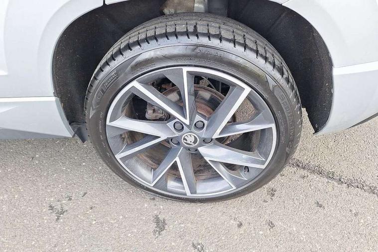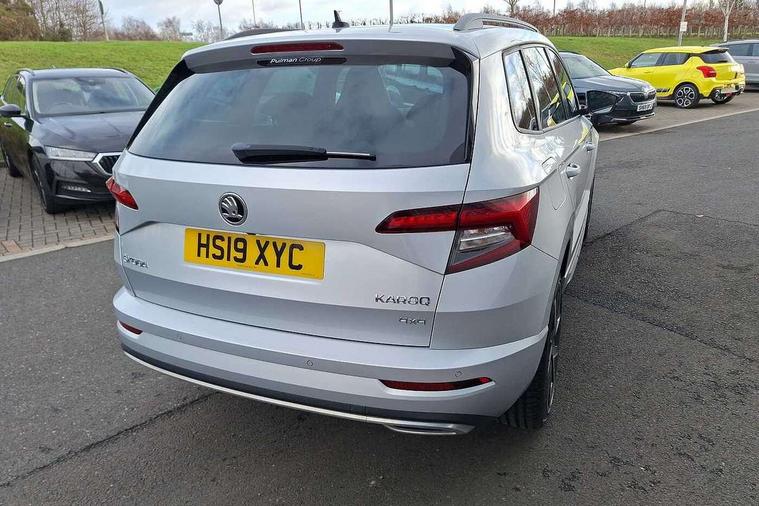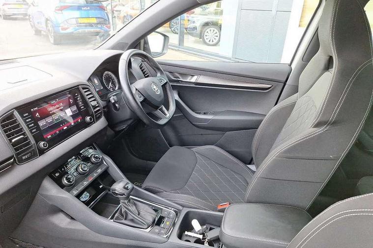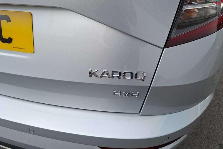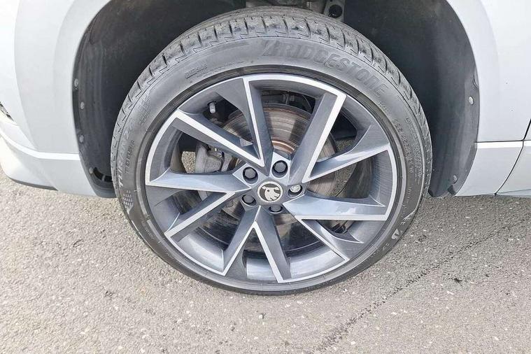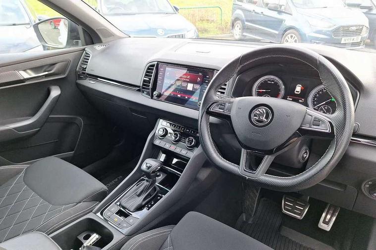 Driver alert system, Driver fatigue sensor, Driver profile selection, Electro-mechanical PAS, Front and rear parking sensors, Multifunction colour trip computer, Outside temperature gauge, Personalisation of drive mode selection with off road includes 3 keys, Rear view camera, Service interval indicator, Start/stop system with regenerative braking, Diesel particulate filter, DAB radio with Bluetooth, SD card slot, USB connection, Acoustic glass, Aero front windscreen wipers with intermittent function, Automatic headlight control system, Black roof rails and door mirrors with radiator grille, Body colour door handles, Chrome outside aluminium bar around the window, Electrically adjustable heated folding and auto dimming door mirrors with boarding spots, Front door steps with SportLine logo, Full LED headlights + adaptive front light system + LED daytime running lights and front cornering fog lights, Headlight washers, Heated rear windscreen, LED rear lights with high functionality, Light assistant (coming/leaving home/tunnel light), Panoramic sliding sunroof, Privacy glass, Protective door side sills in body colour, Rear diffuser, Safety reflectors on front doors, Sportline badge on front fender, Sportline decorative inserts with badging, Sports front and rear bumpers, Third brake light, 1.5 litre bottle holders in driver and front passenger door panels, 12V socket in boot, 12v socket in front centre armrest with storage compartment and rear air vents, 2 Folding hooks and nets in boot, 2 Front readings lights for driver and passenger, 3 rear height adjustable headrests, 3 spoke sports leather multi-function steering wheel with silver stitching, 4 foldable roof handles with rear coat hooks, 4 lashing points on luggage floor, Aluminium pedals, Backrest release, Black roof headlining, Cargo elements in boot, Chrome inner door handles, Driver and passenger seats height adjust, Dual zone climate control, Fabric sports seats with thermoflux and silver stitching, Front seat and rear pockets, Height adjustable front three point seats belts with tensioners, Height/reach adjust steering wheel, Ice scraper, Illuminated and cooled glovebox, Illuminated luggage compartment, Isofix child seat preparation outer rear, Manual lumbar support for front seats, Net programme in boot, Pen holder, Pollen filter, Rear boot cover, Rear reading lights, Rear seats fixed folding and divided 60:40, Removable LED torch in the boot, Retractable parcel shelf attachable to tailgate, Safety vest holder, Storage box in upper central dashboard closed, Storage compartment below the passenger seat, Storage net on centre console passenger side, Sunvisors with illuminated vanity mirrors, Textile floor mats, Umbrella under passenger seat, Welcome animation with sportline logo, LED Interior lighting pack with Skoda welcome logo - Karoq, Airbags - Front side, head, knee and curtain, Automatic door unlocking in case of crash, Automatic fuel cut off in case of crash, Driver airbag, Electronic parking brake with auto hold function, Emergency rear braking signal, ESC including ABS, MSR, ASR, EDS, HBA, DSR, RBS, MKB and traction control, Front assist radar scanning of the space in front of the car with automatic braking, Hill hold control, Passenger airbag with switch-off function, Pedestrian monitor, Seatbelt reminder signalisation and pretensioner for all seats, Three point seatbelts rear, Two tone horn, Tyre pressure display, Tyre pressure monitor, Alarm with interior monitoring, back up horn and tilt sensor with safe function, Electronic engine immobiliser, Keyless entry and keyless start with safe system, Remote central locking with 2 remote folding keys, Chrome framed air vents, 19" Vega anthracite alloy wheels, Anti-theft wheel bolts protection, Storage on wheel cover,