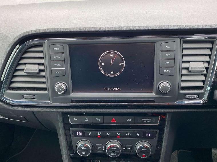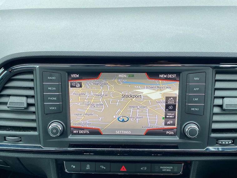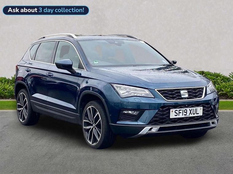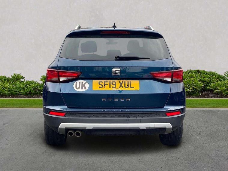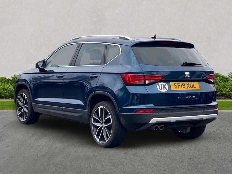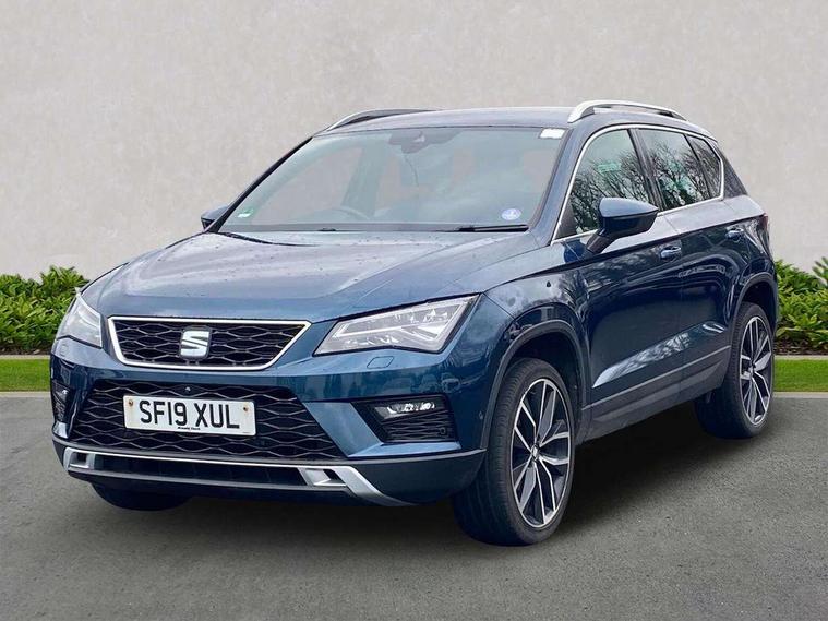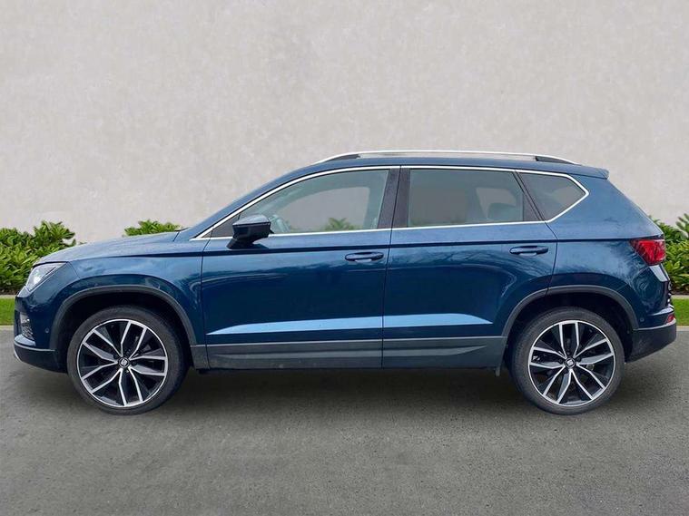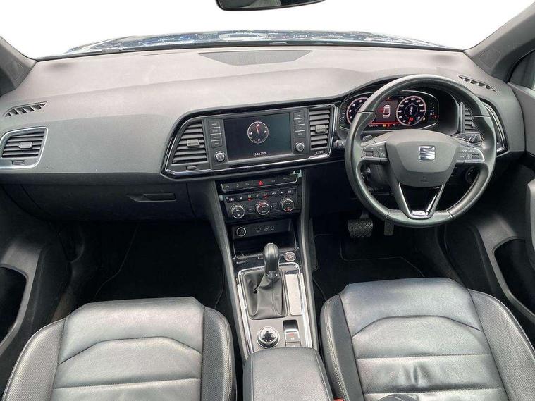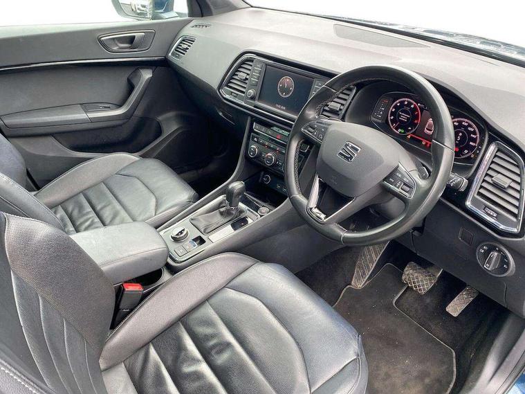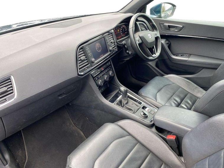 'Lights On' Reminder warning buzzer, 8.0" colour touchscreen with proximity sensor, Adaptive cruise control, Digital clock, Digital cockpit, Driver alert system, Electric tailgate with virtual pedal, Full Link Smartphone Integration with Mirror Link, Apple Car Play, Google Android Auto, Low fuel warning light, Multi function display, Outside temperature gauge, Park assist system with steering assist, Progressive power assisted steering, Rear view camera, Remote fuel flap release, RPM counter, Satellite navigation system, SEAT Drive profile, SEAT logo boot release, Self parking functionality (includes front and rear parking sensors), Top view camera, Trip computer, Wireless Smartphone charger, Comfort suspension, XDS electronic differential lock, SEAT USB media cable, Steering wheel mounted audio/phone controls, Aluminium front door sills, Auto dimming rear view mirror, Automatic headlights, Black wheel arch extensions, Body colour bumpers, Body colour door handles, Body colour door mirrors, Chrome roof rails, Chrome side window trim, Chromed centre radiator grille surround, Dark tinted rear windows, Door mirrors with welcome CUPRA light silhouette, Electric folding door mirrors, Electrically adjustable and heated door mirrors, Front and rear electric windows, Full LED headlights, Heated windscreen, Hidden exhaust pipe, High gloss black grille, LED daytime running lights, LED front fog lights with static cornering light function, LED Headlights, LED tail lights, Rear fog lights, Rear wash/wipe, Twin chromed exhaust pipes, Welcome lighting, 12V power point front, 3 height adjustable rear headrests, 4 Lashing eyes in boot, 60/40 split folding rear seat, Active head restraints, Adjustable front armrest with storage compartment, Advanced multicolour ambient light with LED interior light and LED illuminated glovebox, Black roof lining, Driver sunvisor with covered mirror + card holder, Driver/passenger lumbar adjustment, Driver/passenger sunvisors with illuminated vanity mirrors, Dual zone climate control, Footwell illumination, Front courtesy lights, Front cupholders, Front reading lights, Front seat back storage pockets, Gear shift indicator, Height adjustable driver's seat, Height adjustable front headrests, Height adjustable passenger seat, Illuminated boot, Illuminated door sills, Instrument lighting with brightness control, Isofix child seat preparation, Leather steering wheel and gear knob, Leather upholstery, Rear armrest, Rear central air outlet, Rear reading lights, Sports seats, Steering wheel gearshift paddles, Storage box under drivers seat, Advanced Driving Assistance Pack - Ateca Xcellence, Convenience pack - Ateca, Navigation system pack - Ateca, Winter Pack - Ateca, 3x3 point rear seatbelts, ABS, Auto hold function, Automatic post collision braking, Driver/Front Passenger airbags, Drivers knee airbag, Electronic parking brake, Electronic stability control, ESP+EBA, Front and rear seatbelt reminder, Front assist including city emergency braking, Front passenger airbag deactivation, Front side airbags, Hill hold control, Predictive pedestrian protection, Tiredness recognition system, Traction control, Twin curtain airbags, Tyre pressure monitoring system, 2 folding remote keys with window open/close function, Immobiliser, Keyless entry and start, Locking wheel bolts, Remote central locking, Volumetric alarm with back up horn, Chrome effect dashboard facia, 19" Exclusive machined bi-colour alloy wheels,