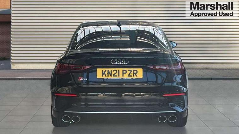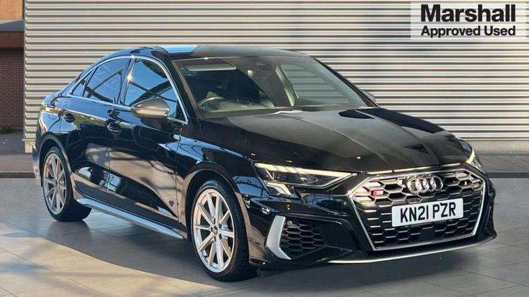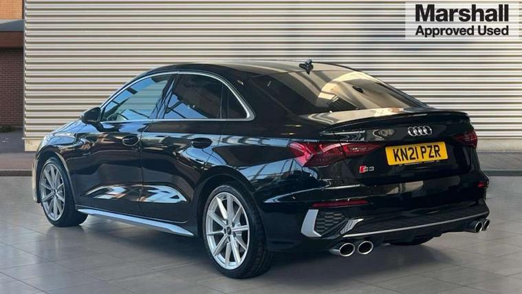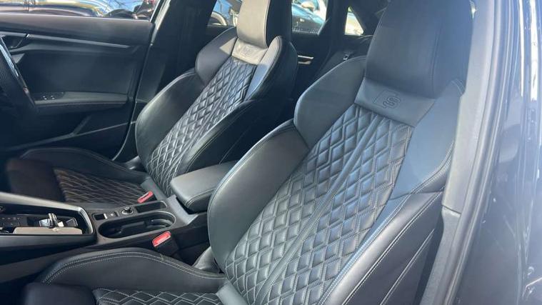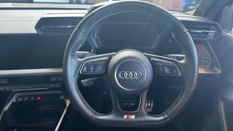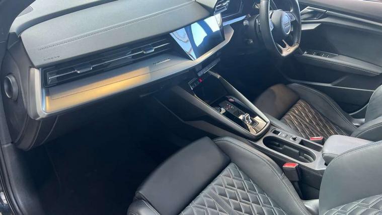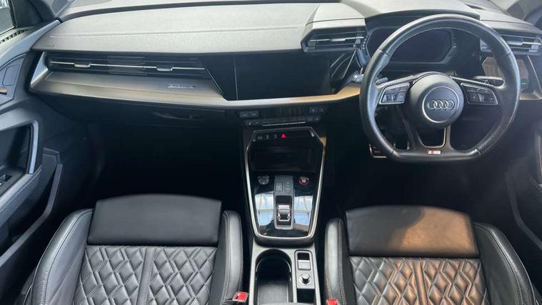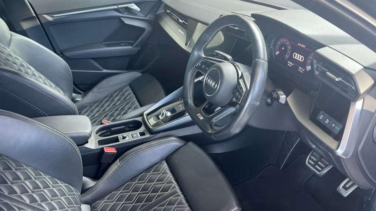 Audi connect emergency call and service, Audi drive select (Auto, Comfort, Dynamic, Efficiency and Individual), Audi smartphone interface, Audi Virtual Cockpit - 10.25" digital and colour instrument cluster, Automatic start/stop system with recuperation, Bluetooth interface, Collision avoidance assistant, Lane departure warning system, MMI Navigation Plus with high resolution 10.1" colour touch screen display, Progressive steering, Service indicator, Voice control system with natural language interaction, Quattro permanent all wheel drive, S sport suspension with spring damper adjustment and lowering by 15mm, 2x USB Type C ports (for charging and data transfer), 6 passive loudspeakers, CD player, DAB Digital radio, Acoustic glass windscreen, Audi Beam uses LEDs to project the Audi logo onto the ground as you exit your S3, Auto dimming frameless rear view mirror, Dual branch oval twin tailpipes in chrome plated finish, Electrically adjustable/heated/folding/auto dimming door mirrors with integrated LED indications + kerb view function for passenger side, Front electric windows, Illuminated door sills with aluminium inserts at the front with S logo, LED daytime running lights, Light and rain sensors, Model and engine designation badges at rear, Privacy glass - dark tinted rear window, rear door and side windows, Rear electric windows, 12V socket and storage compartment in front centre console, 40/20/40 split folding rear seat bench with cupholder, Black cloth headlining, Dual zone electronic climate control, Front and rear centre armrest in leather, Front and rear headrests, Front/rear floor mats, Heated front seats, Height and reach adjustable steering wheel, Interior lighting - glove compartment light and right hand side, Luggage compartment floor covering, Manual boot compartment lid, Seat side bolsters, Stainless steel pedals and front footrest, Body styling design pack - S3, Storage pack - A3/S3 Saloon, 3x3 point rear seat belts, Driver and front passenger airbag with passenger airbag deactivation, Electronic Stabilisation Control (ESC) including ABS, ASR and EDL, First aid kit with warning triangle and 2 safety vests, Front side airbags with head airbags and interaction airbag, Hill hold assist, Pre-sense front with pedestrian and cyclist detection, Seatbelt monitoring, Tyre pressure loss indicator, Anti theft alarm, Anti-theft wheel bolts, Electronically operated child lock, Immobiliser, Remote control central locking, Aluminium air vent surrounds, Aluminium trim elements, Dark spectrum aluminium inlays, accent surfaces in the dashboard and centre console in platinum grey silk effect paint finish,
