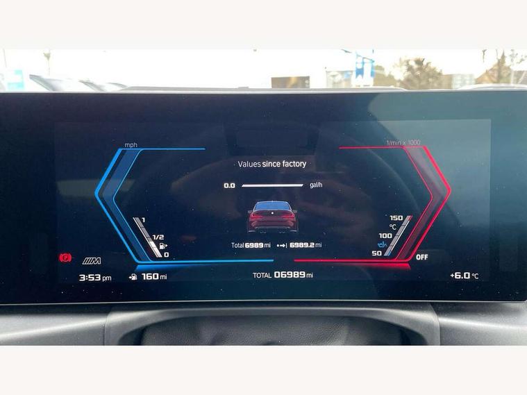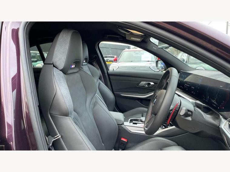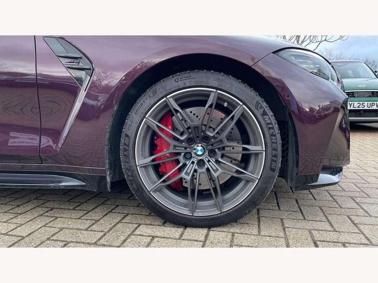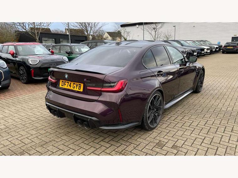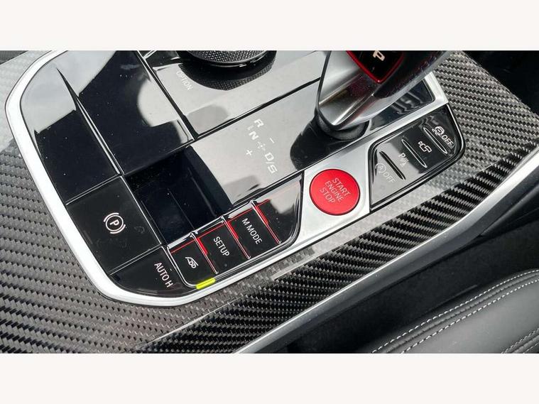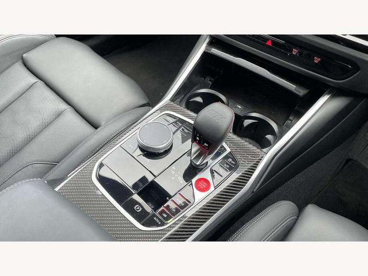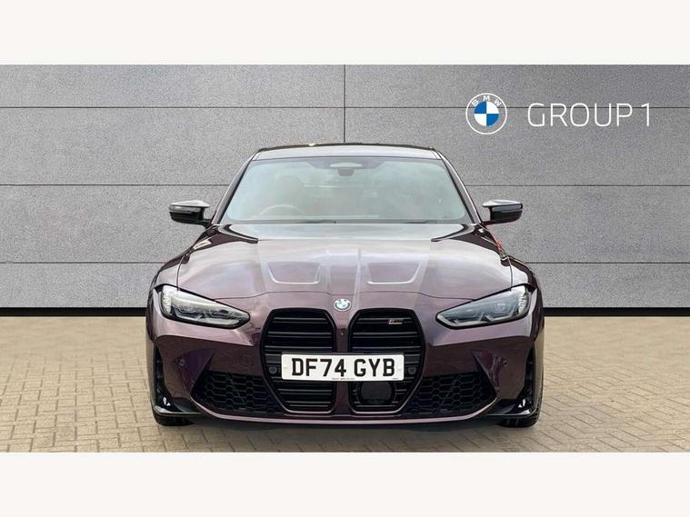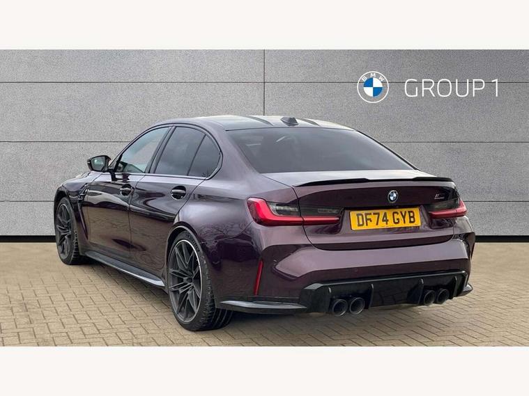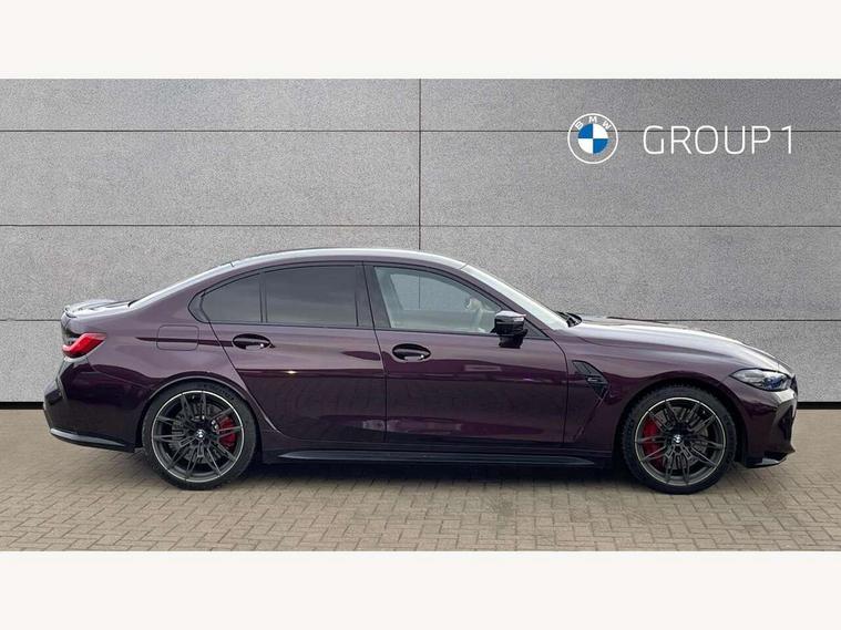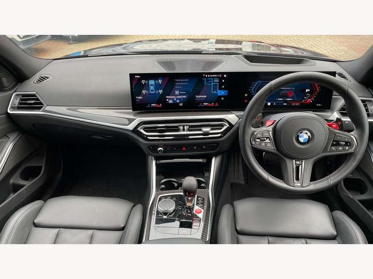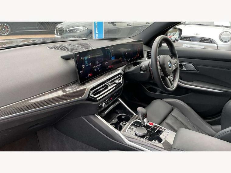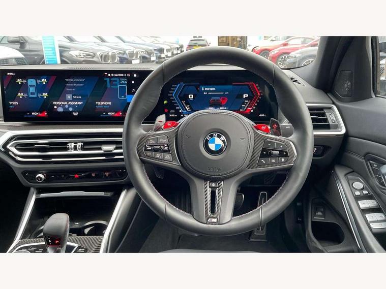 Active guard plus, Automatic start/stop system, Bluetooth functionality with Apple CarPlay/Android Auto, BMW ConnectedDrive online services, BMW iDrive controller on centre console, BMW legal emergency call, BMW Live Cockpit Professional sat nav system with 12.3" instrument display and high resolution control display, BMW Online services, BMW Teleservices, Brake pad wear indicator warning light, Condition based service, Door/boot open warning light, Driving experience switch, Head up Display, Illuminated control elements, Instrument cluster with extended contents, Lights on warning, M drive buttons, Oil sensor for level and grade, warning by check control system, Oil temperature gauge, On board computer, On board diagnostics, Optimum shift indicator, Outside temperature display, Pull away assistant, Run flat indicator, Service interval indicator, Shifting point display, Speed limiter, Variable sport steering, Widescreen display, Adaptive M Sport suspension, Double joint spring strut front axle, Electronic differential lock control (EDLC), M Drive Professional including track mode, laptimer, traction control & Drift analyser, M Sport differential, M steptronic sport transmission with drivelogic, Safety battery terminal clamp, 8 programmable favourite buttons, Auxiliary point for auxiliary devices, BMW professional radio/CD/MP3, DAB Digital radio, Harman/Kardon loudspeaker system, 3rd brake light, Acoustic glazing, Auto dimming driver's door mirror, Auto dimming rear view mirror, Automatic headlights + automatic windscreen wipers, Automatic parking function on front passenger's exterior mirror, Black chrome exhaust tailpipes, Black model designation badges, BMW emblem on engine compartment lid and tailgate, BMW high gloss shadow line with extended contents, BMW Individual shadowline lights, Body colour bumpers, Carbon fibre reinforced plastic (CFRP) roof with high gloss black roof aerial bulge and roof mouldings, Day time running light, Door mirror integrated indicators, Door sill finishers with aluminium inserts, Dynamic brake lights, Electric adjustable heated door mirrors, Electric folding door mirrors, Electric front and rear windows with one touch/convenient open/close function, Follow me home headlights, Front and rear apron plastic in body colour, Front and rear bumper system, Headlight beam throw control, Heat protection, sun protection glazing, Heated rear window with automatic switch off, Heated washer jets, High beam assistant, High gloss black frameless kidney grille with M badge, High gloss black lower bumper edges, side sills and diffuser edge binding, Illuminated bow type door handles in body colour drivers side with door lock, LED number plate light, LED tail lights with 3D L-shaped LED light design, M designation, M Sport entry door sill strips, Mirror glass aspheric on driver's side, convex on passenger side, Rear boot, Rear fog lights, Rear reflectors, Rear right M3 competition inscription, Rear side wing doors, Reversing light, Shark fin roof aerial, Strakes in front side panel, black matt/black high-gloss, with model badge, Visible VIN plate, Welcome lighting, 2 front cupholder in centre console with clamping elements and matt black inlay, 2 x 12 V Power sockets (luggage compartment and front centre console), 2 x USB Type C ports for charging and data transmission in front centre console, 3 folding rear headrests, 3 seat bench in 2nd row, Ambient inside door handle light, Ambient lighting for instrument panel, Ambient lighting for storage compartment, Ambient lighting front and rear, Ambient lighting in door panels, Anthracite headlining, Battery in luggage compartment, Carbon fibre centre console incl. cover for cupholders and storage compartment, Carbon fibre decorative steering wheel finishers, Carbon fibre shift paddles, Carbon fibre strip in instrument panel on front passenger side, Centre console armrest with storage compartment, Compartment in front of cupholder, Driver/passenger sunvisors with illuminated vanity mirrors + covers, Dynamic ambient interior lighting, Electric front seats + driver memory, English handbook, Floor mats in velour, Folding rear centre armrest with 2 cupholders, Footwell lighting, Front and rear door exit lights, Front door storage bins with bottle holder, Front interior light, Front isofix attachment + airbag deactivation, Front seat backrest width adjustment, Front seats lumbar support, Front/rear door armrests, Gearshift lever with embossed M badge, Heated front seats, Height adjustable front headrests, Interior mirror lighting, Isofix on 2nd row outer seats, Lockable/illuminated glovebox, Luggage compartment lighting, Manual 40:20:40 split folding rear seat with two tilt positions for backrest, Multifunction steering wheel, Rake/reach adjustable steering wheel, Single front passenger seat, Storage compartment in rear doors, Three zone automatic air conditioning, Through loading system, Toolkit located in luggage compartment, Wireless charging tray, Additional storage compartment pack - M3, Connected package professional - M3, High gloss shadowline exterior trim pack - M3, 3 point seatbelts on all seats, ABS/EBD, Automatic Stability Control (ASC), Brake energy regeneration, Brake fade compensation, Compound structure brake discs, Cornering brake control (CBC), Crash sensor, Driver/Front Passenger airbags, Dry braking, Dynamic brake control, Dynamic Stability Control with M Dynamic mode, Dynamic Traction Control - DTC, Electromechanical parking brake, Front and rear head airbags, Front seat side impact airbags, Front seatbelt pretensioners + load limiters, Hill start assist, M Sport seat belts, Rear child proof door locks, Seat occupancy detection for driver and passenger side, Seatbelt warning, Side impact protection, Two tone horn, Tyre pressure sensor, Warning triangle and first aid kit, Centre lock switch, Closing system with central locking, Digital key, Electronic immobiliser, Thatcham cat 1 remote alarm, Vehicle Key with 4 butt