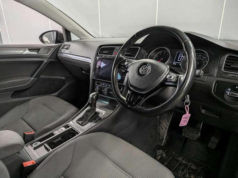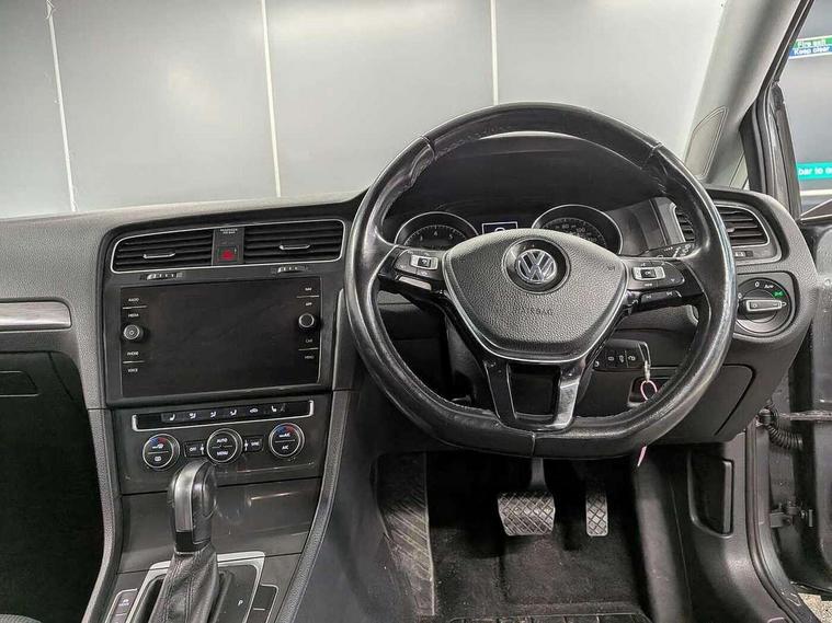 'Lights On' Reminder warning buzzer, ACC - Adaptive cruise control with front assist, forward collision warning, distance monitoring, city emergency brake and speed limiter, Bluetooth telephone and audio connection for compatible devices, Brake pad wear indicator warning light, Driver alert system, Driving Mode Selection with four preset modes - Eco, normal, sport or individual modes, Instrument cluster in white, Multifunction computer with visual gear change recommendation for fuel consumption, Power assisted speed sensitive electro-mechanical steering, Push tank flap, Speedo, rev counter, electronic odometer, trip, service interval display, exterior temperature and fuel gauge, Stop/start system, Think blue trainer driver tips and journey analysis, Warning buzzer and light for front seatbelts unfastened, We Connect Go Dongle, Battery regeneration during braking, XDS electronic differential lock, DAB Digital radio receiver, Driver Personalisation profile selection, MDI multi device interface, MP3/WMA compatability, Premium USB cable in choice of either Apple or Android smartphone compatibility, SD card slot, SMS Functionality, Title and cover art display, USB charging socket, Volkswagen media control, Automatic coming/leaving home lighting function, Black front air intake and radiator grille with chrome insert, Black rear diffuser, Black roof rails, Body colour bumpers, Body colour door handles, Body colour door mirrors with integrated indicators, Dusk sensor + automatic driving lights, Electrically adjustable and heated door mirrors, Front and rear electric windows, Fully galvanised body, Heated rear windscreen, Hidden exhaust pipe, High level 3rd brake light incorporating LED Technology, LED daytime running lights, LED front fog lights with static cornering light function, LED rear lights, LED rear number plate lights, Rain sensor and automatic dimming interior rear view mirror, Rear fog lamp, Rear tinted glass 65% light absorbing from B pillar backwards, Rear window aerial, Rear window wash/wipe with intermittent wipe, Reflectors in all doors, Tailgate with integrated rear roof spoiler, Windscreen wipers/ intermittent wipe + 4 position delay, 12V socket in luggage compartment, 3 rear headrests, 3 spoke steering wheel, 4 load lashing points in luggage compartment, 60/40 split folding rear seat backrest and flat folding into boot floor, Auto fold down lever in rear seat backrest, Bag hook in luggage compartment x 2, Black decorative sleeve on gear handles, Climate control - 2 zone electronic air conditioning with automatic air recirculation and allergy filter, Cooled glovebox, Cover for storage compartment in centre, Cupholder cover, Dust/pollen filter, Front and rear reading lights X 2, Front centre armrest with storage compartment and two rear air vents, Front seat back storage pockets, Grab handles front x 2, rear x 2 with integrated coat hooks, Height and reach adjustable steering wheel, Illuminated vanity mirrors, Instrument lighting white adjustable panel illumination, Interior light delay, Isofix preparation for 2 rear child seats, Load through provision with rear centre armrest and cupholders x2, Luggage compartment cover with stowable convenience opening, Luggage compartment lighting, Overhead storage box, Passenger underseat drawer, Pearl grey headlining, Storage box in luggage compartment, Storage compartment in roof console with cover, Storage compartments in front doors, Storage compartments in rear doors, Sun visors, Variable boot floor, height adjustable and removable, Convenience Pack - Golf, Mirror pack - Golf, Winter pack - Golf, 3 rear three point seatbelts, Airbags - Driver and rear passenger curtain, driver knee, front side impact, driver and passenger airbag with passenger deactivation switch, Anti-lock Braking System (ABS) with Hydraulic Brake Assist (HBA), Automatic post collision braking system, Child locks on rear doors, Driver/Passenger optimised head restraints, Electronic parking brake with auto hold, Electronic stability control (ESC) including Electronic differential lock (EDL) and ASR (Traction control) with deactivation via infotainment system, Front ventilated disc brakes and rear disc brakes, Pre crash preventive occupant protection, Predictive pedestrian protection, Three point height adjustable front seatbelts with tensioners, Tyre pressure loss indicator, Volkswagen roadside assistance, Alarm with interior protection and deactivation via infotainment system, Electronic engine immobiliser, Brushed dark silver decorative inserts in dash and door panels, Chrome plated air vent surround, Chrome-plated light switch surround, Polar night black decorative inserts in centre console, Full size wheel trims, Steel space saver spare wheel,