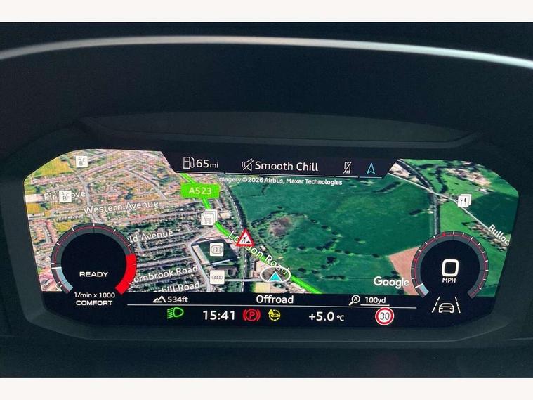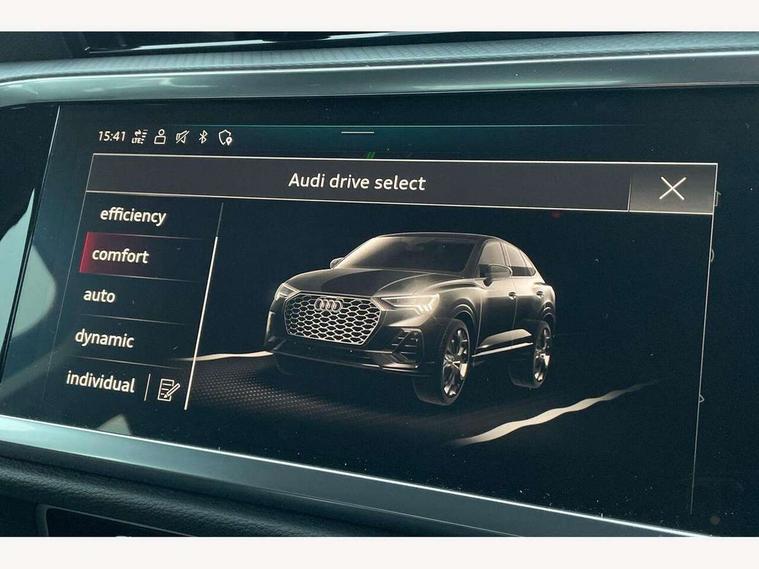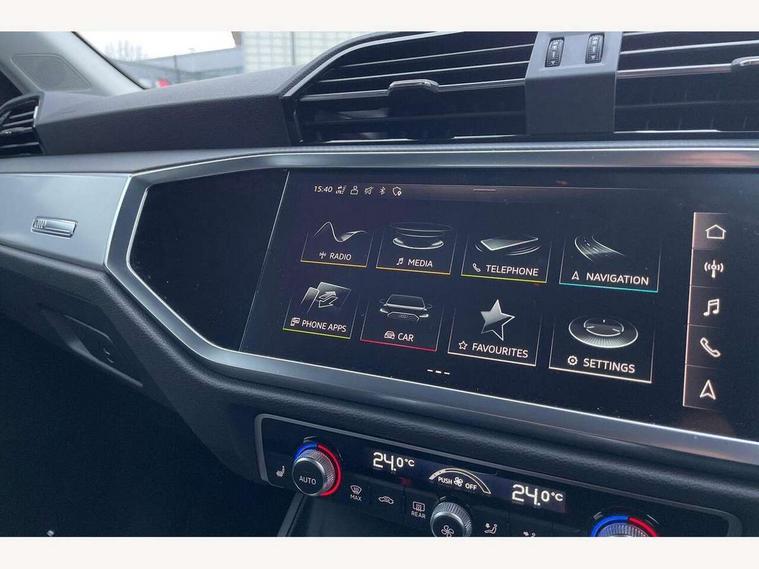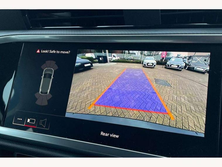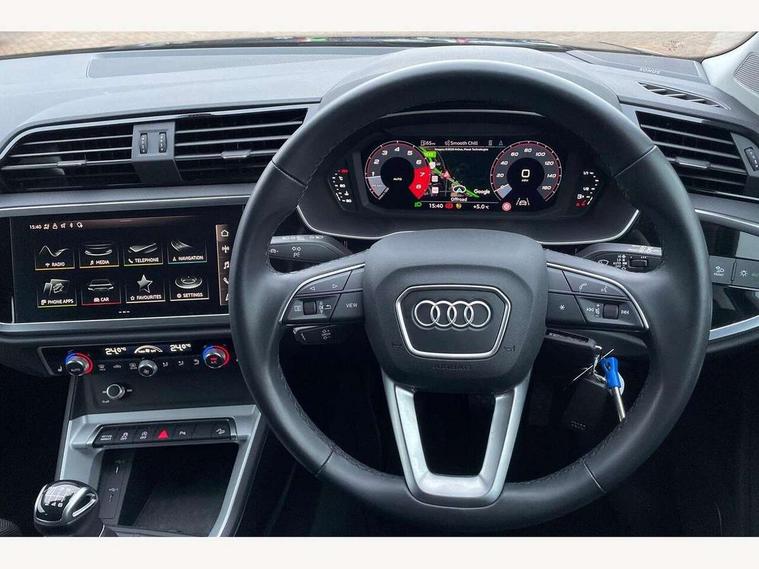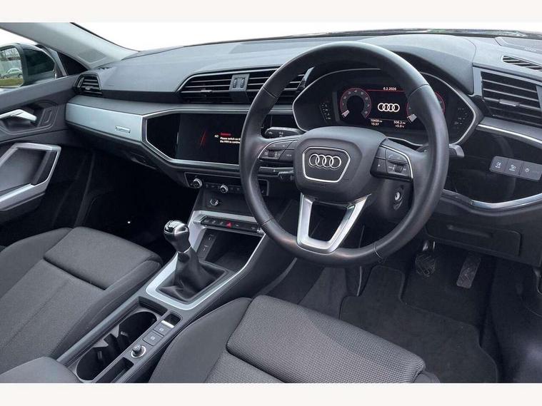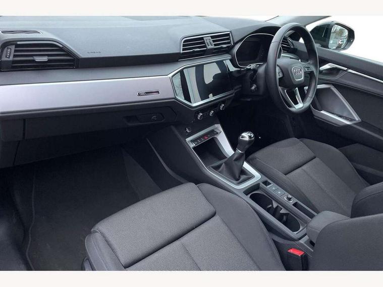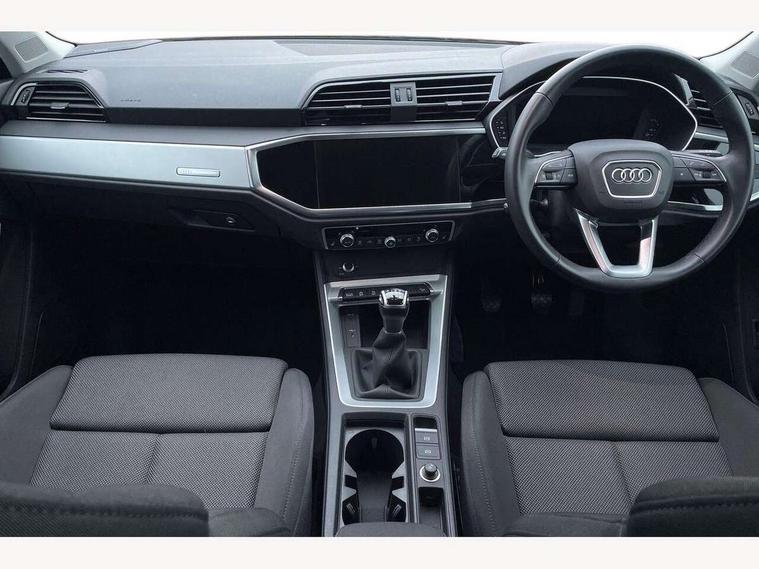 Audi drive select, Audi lane departure warning, Audi Virtual Cockpit - 10.25" display, Bluetooth interface, Camera based traffic sign recognition, Cruise control + speed limiter, Legal emergency call, MMI Navigation Plus with high resolution 10.1 inch touchscreen colour display, Power operated tailgate, Progressive steering, Rear parking sensors, Service interval indicator, Smartphone interface includes wireless Apple carplay/Android Auto, Start stop system with recuperation, Voice control system with natural language interaction, Sports suspension, 2 USB-C ports with charge and data functions, 6 passive loudspeakers, DAB digital radio module, Acoustic windscreen, Aluminium window trim, Auto dimming frameless rear view mirror, Bumpers and underbody protection in contrasting manhattan grey paint finish, Diffuser grille in grained matt black, Diffuser trim in manhattan grey metallic, Door sill trims with illuminated aluminium inlay, Electrically folding, adjustable and heated door mirrors with integrated LED side indicators and kerb view function for passenger side, Front and rear electric windows, Front fog lights, Front side air inlets in Manhattan grey metallic, Grille surround in aluminium silver matt, High gloss black finish B and C pillars, Honeycomb design radiator grille in matt anthracite black, LED Dynamic rear indicators, LED headlights with LED daytime running lights, LED rear lights, LED third brake light, Rain and light sensors, Rear side wing doors, Rear wiper, Variable front intermittent wipers, 12V socket in rear centre console, 3 seat bench in 2nd row, 3 spoke multi-function leather steering wheel, 40:20:40 folding with manual adjustment for 60:40 forwards/backwards position and backrest angle, Dual zone electronic climate control, Front and rear floor mats, Front and rear headrests, Front and rear roof module including reading lights, Front centre armrest, Glove compartment lighting, Height and reach adjustable steering wheel, ISOFIX child seat mounting for front passenger with airbag deactivation and outer rear seat including top tether attachment point for outer rear seats, Luggage compartment light right in white, Luggage compartment sill protection in stainless steel, Lunar silver cloth headlining, Manual front seats with height adjustment, Single front passenger seat, Non smoking pack - Q3, 3x3 point rear seatbelts, 6 airbags - Driver, front passenger, curtain and side windows, Audi pre-sense front with pedestrain and cyclist recognition, Electrically operated child locks on rear doors, Electromechanical parking brake, Electronic stabilisation control including ABS, ASR and EDL, Front seatbelt reminder, Hill descent control, Hill hold assist, Pre sense basic, Seatbelt monitoring, Tyre pressure warning, Warning triangle and first aid kit, Anti theft alarm, Anti theft wheel bolts, Immobiliser, Remote central locking, Aluminium look interior elements, Black dashboard, Detail dashboard around MMI touch colour display in glass look, black with surround in aluminium look, Micrometallic silver inlay,