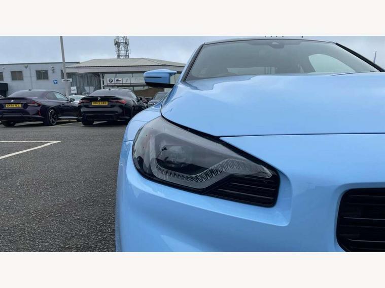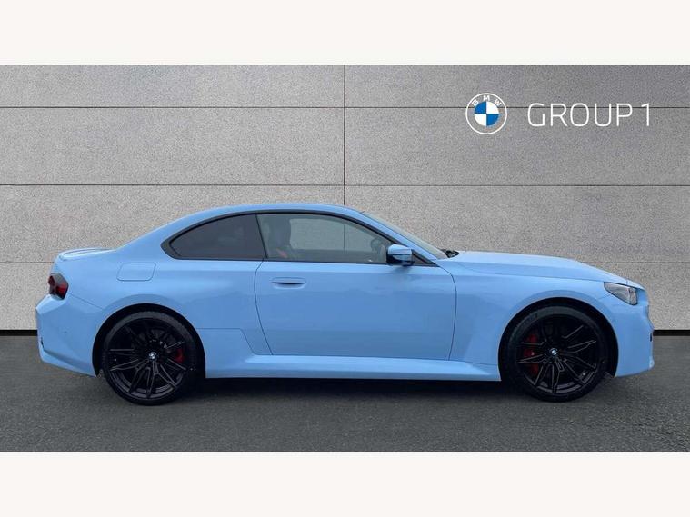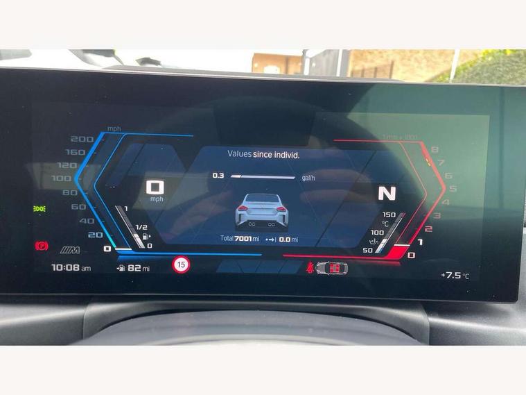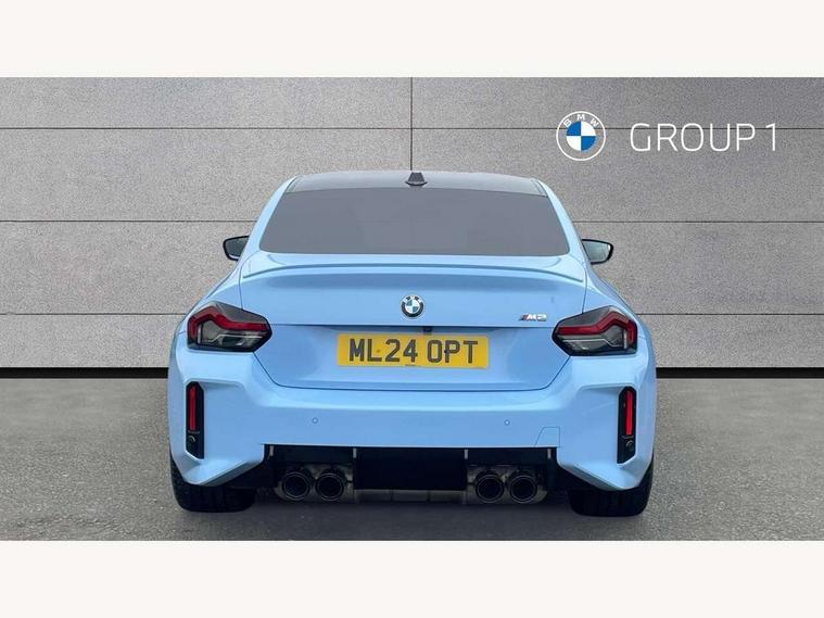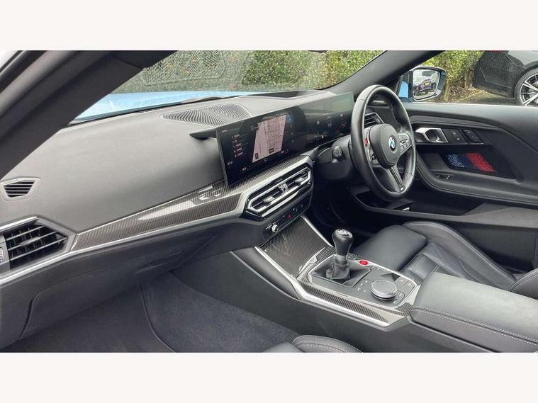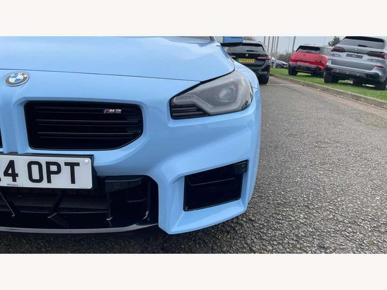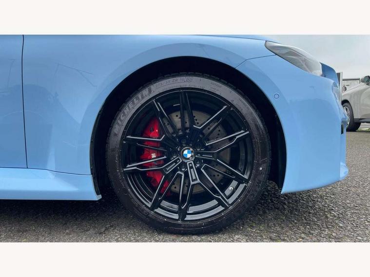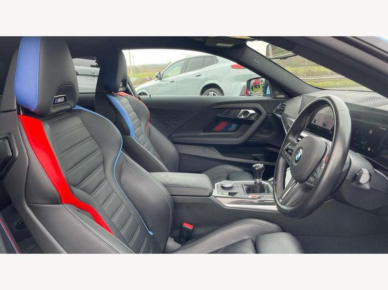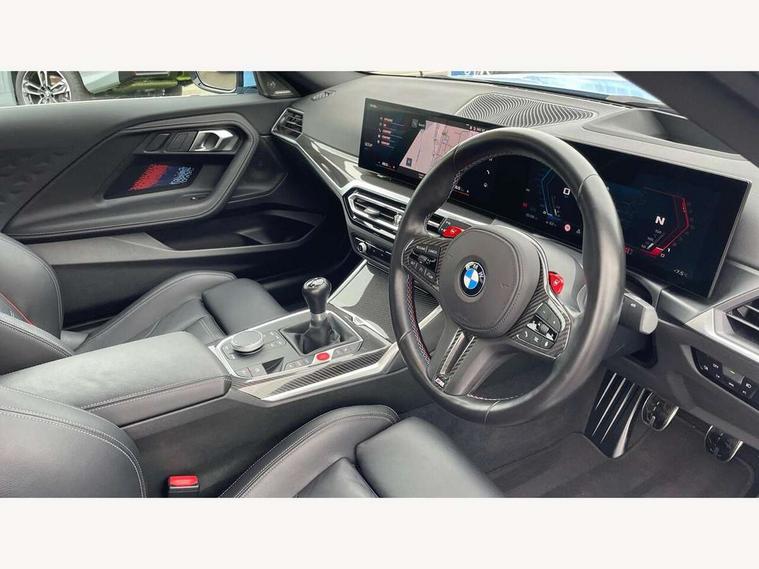 BMW ConnectedDrive online services, BMW legal emergency call, BMW Teleservices, Check control system, Configurable dashboard display, Cruise control with braking function, Digital owner's manual, Drive off assistant, Driver attention warning, Engine start button, Exterior temperature display, Live Cockpit Pro with head up display including 12.3" instrument cluster and 14.9" central display, M drive: DSC mode, engine characteristics, M Servotronic, M Drivelogic, adaptive M suspension, brake characteristics, M Sound Control, Oil sensor for level and grade, On board diagnostics, Parking assistant with reversing assistant, active PDC, lateral parking aid and rear view camera, PAS, Service interval indicator, Speed limiter, Start/stop system, Travel data recorder, Trip computer, Voice control for audio, climate, telephone, navigation, Widescreen display, M Adaptive suspension, M Drive Professional including track mode, laptimer, traction control & Drift analyser, M Sport differential, DAB tuner, Harman/Kardon surround sound system, USB port, Adaptive LED Headlights, Automatic headlamp activation, Automatic headlamp levelling, BMW Individual shadowline lights, Door mirror integrated indicators, Dynamic brake lights, Electric adjustable heated door mirrors, Extended High-gloss shadowline exterior trim: high-gloss black mirror caps and rear spoiler, tailpipe finishers in black chrome, Fading support, Follow me home headlights, Front and rear bumper system, Front electric windows, Headlight beam throw control, Heat protection, sun protection glazing, High beam assistant, Illuminated M highlighters, Interior rear view electrochromatic mirror with automatic anti dazzle function, LED 3rd brake light, LED daytime running lights, LED indicator lights, LED number plate light, LED rear lights, M carbon fibre roof, M high gloss shadowline exterior trim in mirror triangle cover, mirror cover panel, mirror bezel and window border, Mirror glass aspheric on driver's side, convex on passenger side, Rain sensor, Rear boot, Sun protection glass: darkened glass for rear screen and rear side windows, Variable front intermittent wipers, Welcome lighting, 12V power socket in front centre console with blanking plug, 2 cupholders, 2 rear head restraints, 2 rear seats, 3 spoke leather M multi-function steering wheel, Ambient lighting, Black velour front and rear floor mats, Carbon fibre interior trim including carbon applications on the steering wheel, Compartment in front of cupholder, Driver/passenger electric lumbar adjustment, Electrically adjustable front seats - driver seat with memory, Folding rear seat head rests, Front and rear door exit lights, Front and rear footwell lights, Front centre armrest, Front door pockets with bottle holders, Front door sill strips with aluminium inlays and M2 labelling, Front interior light, Front M Sport seats, Front reading lights, Glove compartment, Glovebox light, Heated front seats, Height adjustable front headrests, Illuminated armrest storage compartment, Illuminated M accents in front door, Isofix child seat for two outer rear seats, Luggage compartment lighting, M Anthracite headlining, Manually adjustable steering column, Rear armrest, Single front passenger seat, Steering column rake adjustment, Storage compartment in rear doors, Storage tray and compartment with cover in centre console, Through loading system with 40/20/40 split folding rear seat, Two zone automatic air conditioning, Vanity mirror lights, Connected package professional - M2, Extended storage pack - M2, Interior and exterior mirror pack - M2, 4 x 3 point seatbelts, ABS/EBD, Automatic Stability Control (ASC), Cornering brake control (CBC), Crash sensor, Curtain airbags, Driver/Front Passenger airbags, Dry braking, DSC - Dynamic Stability Control, Dynamic brake control, Electromechanical parking brake, Emergency door unlock, Front passenger airbag deactivation, Height adjustable front seatbelts, M seat belts, Seatbelt load limiter, Seatbelt pretensioners with load limiters, Seatbelt reminder, Tyre pressure sensor, Alarm system, Central locking, Drive away door locking, Immobiliser, Remote central locking, Tyre repair kit,