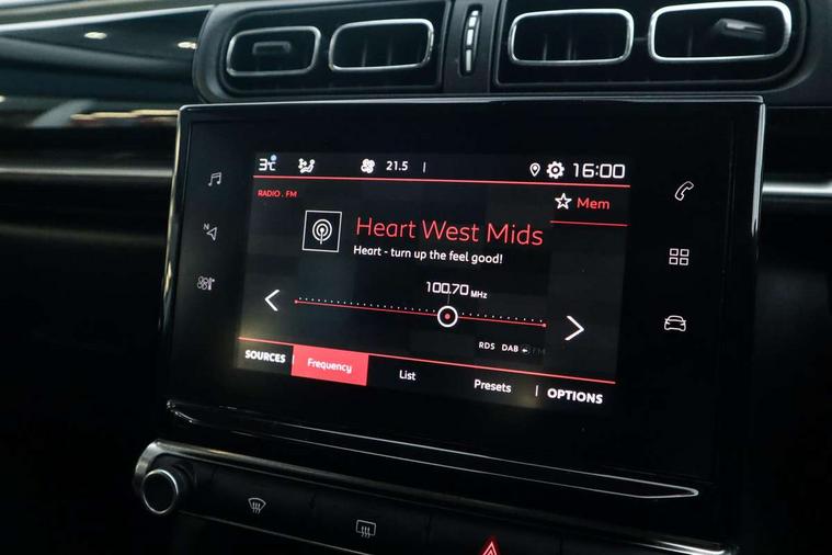Coffee Break Alert, Cruise control + speed limiter, Exterior temperature display, Instrument cluster with white LCD and analogue gauges, Multi function trip computer, Rear parking sensors, Variable assistance power steering, USB connection, 3D rear light signature, Automatic activation of hazard warning lights, Body colour bumpers, Body colour door handles, Chrome decoration on front face, under chevrons and around daytime running lights, Citroen illuminated signature in LED headlights and LED daytime running lights, Electric folding and heated door mirrors, Electric front windows with one touch/anti-pinch, Fog lights integrated into front bumper, Gloss black finish B pillar, LED Headlights, Manual rear windows, Rear windscreen wiper with intermittent mode linked to vehicle speed and automatic activation when reverse gear selected, Roof colour rear view mirror caps, Standard day night switchable interior rear view mirror, Tinted side windows, 1/3 to 2/3 split folding rear seat, 12V socket, Automatic air conditioning, Driver and passenger's sun visor with courtesy mirror, Driver's seat height adjustment, Fixing boot light, Front lighting panel with map reading lights, Front seats adjustable with forward back slide and adjustable backrest, Height adjustable front head restraints, Height/reach adjust steering wheel, ISOFIX mounting on outer rear seats with top tether and labels indicating fixing points, Parcel shelf, Seatbelt unfastened on the move audible and visual alert for front and rear seats, Soft touch gear lever with leather effect gaiter and overstitching, Storage space under touchscreen with rubber mat, Three rear seats with head restraints, Upholstered armrest in front and rear doors, Safety pack 1 - C3, Visibility pack with automatic lights - C3, ABS, REF, AFU, Driver and front passenger seatbelts with pyrotechnic pretensioners and force limiters, Driver's airbag, Electric child locks, ESP with anti skid system, Front passenger airbag deactivation, Front side airbags + front/rear curtain airbags, Hill start assist, Manual parking brake with chrome finish button, Mono-tone horn, Three rear three point seatbelts with outer seats have pretensioners and force limiters, Tyre pressure monitoring system, Anti theft alarm, Automatic door and boot locking with automatic unlocking in case of impact, Central locking with locked indicator and interior one touch lock button, Immobiliser, Remote control central locking with two plip keys, Gloss black dashboard finish with grey surround, 16" Hellix diamond black alloy wheels,