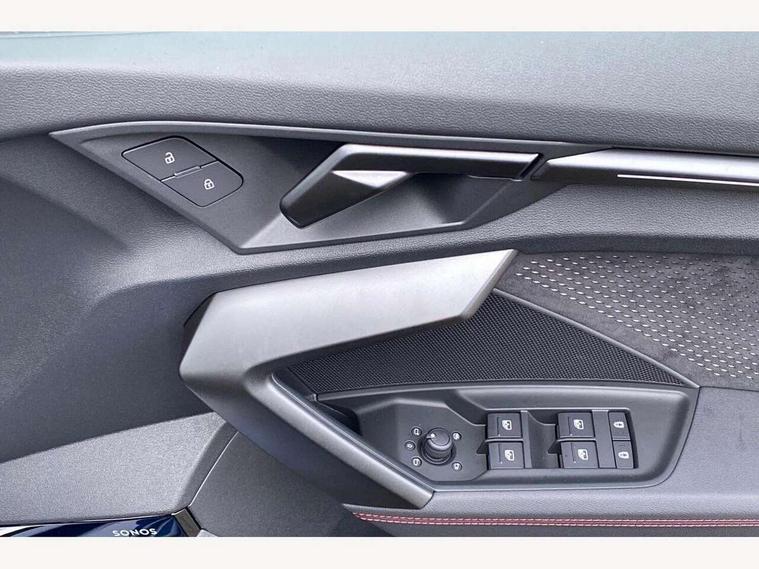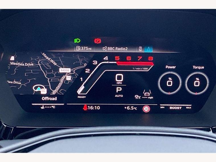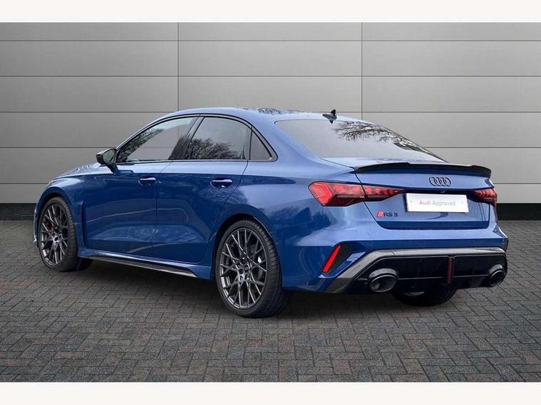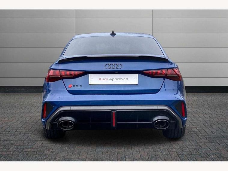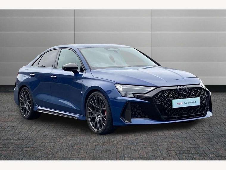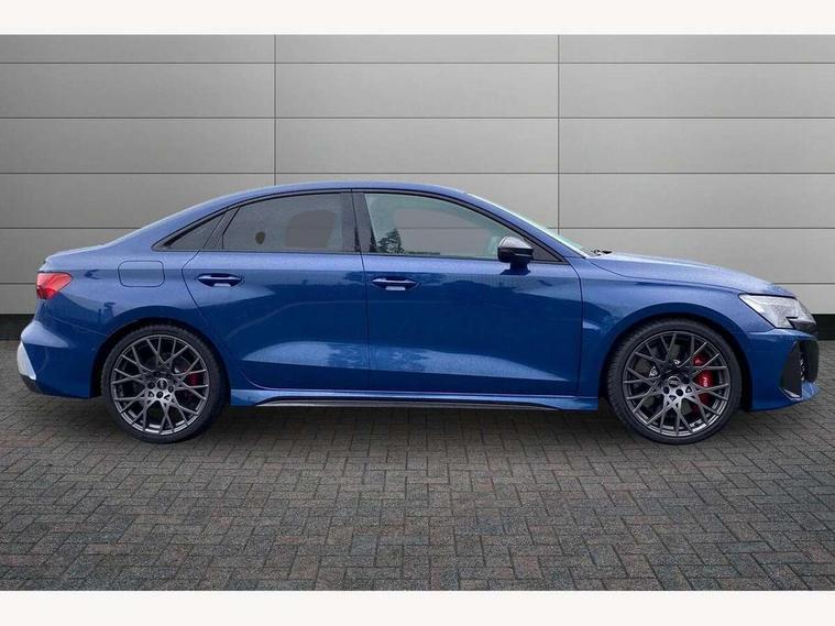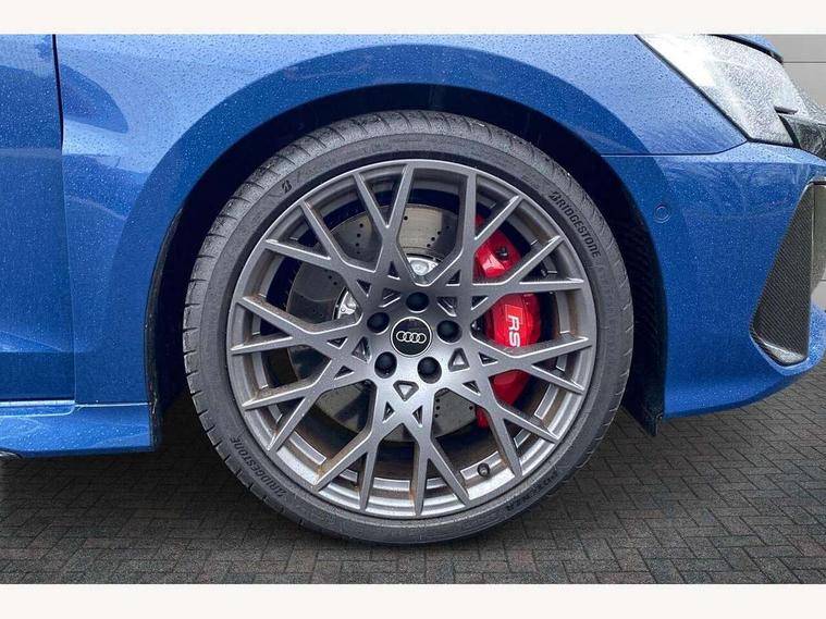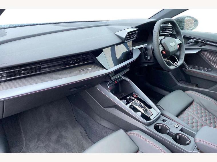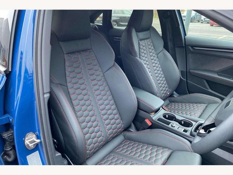 Adaptive cruise control (ACC), Adjustable speed limiter, Audi drive select comfort, auto, dynamic and efficiency, Audi virtual cockpit plus with RS specific design and 12.3" display with additional graphic display options, Automatic start/stop system with recuperation, Bluetooth interface, Camera based traffic sign recognition, Collision avoidance assistant, Driver attention and fatigue detection, e-Call (emergency call), Emergency assist, Intersection assist, Lane departure warning system, MMI Navigation Plus with high resolution 10.1" colour touch screen display, Park Assist with parking system Plus, Progressive steering, Reversing camera, RS specific driving modes - RS Individual, RS Performance and RS Torque rear, Service indicator, Smartphone interface with app store includes wireless Apple carplay, Android auto and Amazon alexa integration, Trip computer, Voice control system with natural language interaction, Quattro permanent four wheel drive, Audi Phonebox light with wireless charging, DAB Digital radio, USB ports with charging function in the rear, Audi beam LED projection of RS logo on ground as you exit, Auto dimming frameless rear view mirror, Carbon door mirror housings, Electrically adjustable/heated/folding/auto dimming door mirrors with integrated LED indications + kerb view function for passenger side, Engine compartment cover with carbon trim, Exterior model badging, Front electric windows, Heat insulating glass windscreen, LED 3rd brake light, Light and rain sensors, Privacy glass - dark tinted rear window, rear door and side windows, Rear boot, Rear electric windows, Rear side wing doors, RS sport exhaust system - dual branch with flap control and gloss black oval tailpipe trims, Tailgate spoiler in carbon, 12V socket and storage compartment in front centre console, 3 seat bench in 2nd row, 3 Spoke flat top and bottomed black leather multi function steering and gear shift paddles, 3-zone deluxe automatic air conditioning, 40/20/40 split folding rear seat bench, Black cloth headlining, Black front and rear floor mats, Front and rear headrests, Front centre armrest, Front door sill trims with RS 3 logo, Heated front seats, Height and reach adjustable steering wheel, Manual boot compartment lid, Manually adjustable front seats, Rear centre armrest with cupholder, Seat side bolsters, Single front passenger seat, Stainless steel pedals and front footrest in black, Vanadium look - Interior door handles, Door trim, power latching, Air vents, window controls, mirror adjust, rear door lock, Selector lever in centre console, Black Styling plus package - RS3, Extended ambient lighting package Pro with Multi-coloured contour lighting of instrument panel - RS3, RS exterior features pack in carbon and gloss black - RS3, RS sport suspension pack - RS3, Storage package - RS3 Saloon, Technology pack with Matrix LED headlights - RS3, 3x3 point rear seat belts, Driver and front passenger airbag with passenger airbag deactivation, Electronic Stabilisation Control (ESC) including ABS, ASR and EDL, First aid kit with warning triangle and 2 safety vests, Hill hold assist, Pre-sense front with pedestrian and cyclist detection, RS steel brakes, Seatbelt monitoring, Tyre pressure loss indicator, Anti theft alarm, Anti-theft wheel bolts, Electronically operated child locks, Immobiliser, Black dashboard, Inlays in carbon atlas structure, 19" 10 cross spoke silk matt grey alloy wheels, Tyre repair kit,
