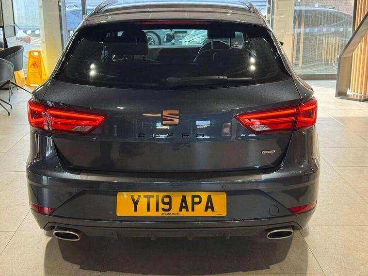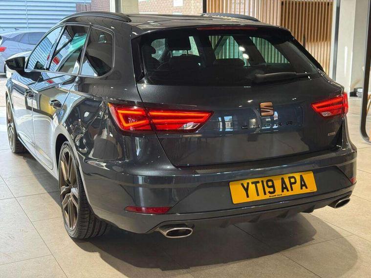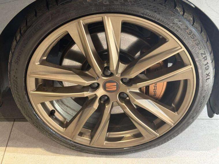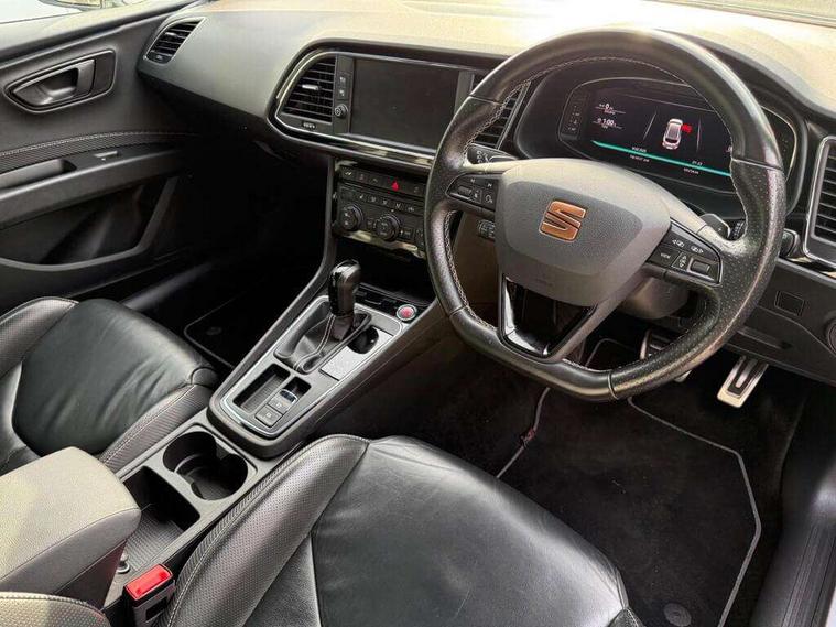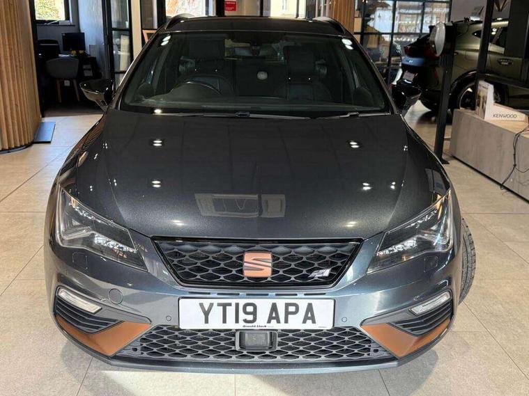 'Lights On' Reminder warning buzzer, 3D map display, 8" touch screen, Bluetooth Handsfree Phone Connection, CUPRA performance interface, Digital cockpit, Electro-mechanical progressive power assisted steering, Front and rear parking sensors, Front assist with pedestrian protection, Full Link Smartphone Integration with Mirror Link, Apple Car Play, Google Android Auto, Low fuel warning light, Navigation system (incl. media system plus), Outside temperature gauge, RPM counter, SEAT Drive profile CUPRA, SEAT logo boot release, Service interval indicator, Trip computer, Voice recognition, Wireless Smartphone charger, Dynamic chassis control, Lowered suspension, Mechanical limited slip differential, XDS electronic differential lock, 2x SD card slot, 4 USB, 8 speakers, Auxiliary input socket, Bluetooth audio streaming, CD player, DAB Digital radio, High resolution colour driver display, Media system plus (incl. media system colour), SEAT USB media cable, Steering wheel mounted audio/phone controls, Black radiator grille, Black roof rails, Body colour door handles, Body coloured bumpers, Dark tinted rear windows, Electric front/rear windows, Electrically adjustable door mirrors, Electrically foldable exterior mirrors with parking position and passenger-side mirror with lowering function, Exclusive Cupra front and rear bumpers, Gloss black exterior mirrors with integrated LED indicators, Heated door mirrors, High gloss black finish B and C pillars, High gloss black front grille surround, Illuminated aluminium front door sill with CUPRA logo, LED front fog lights, LED headlights with LED day time running lights + LED rear lights + LED number plate lights, LED rear fog light, Rear wash/wipe, Visible dual exhaust pipes, 12v power point in centre console, 60/40 split folding rear seat with armrest, Active front headrests and 3 rear headrests, Additional heating and ventilation outlet in rear of centre console, Black roof lining, Boot storage net, Cargo rings in boot, Double boot floor, Driver and passenger seat height adjust, Driver and passenger sun visor, covered and illuminated mirror, driver sun visor with card holder, Driver seat lumbar adjustment, Dual zone climate control, Dust/pollen filter, Electric adjust driver's seat, Flat bottomed perforated leather steering wheel with white stitching and CUPRA logo, Front adjustable head restraints, Front armrest with storage box, Front cupholders x 2, Front seatback storage pockets, Front sport seats in leather, Front/rear floor mats, Gear shift indicator, Height/reach adjust steering wheel, High centre console with integrated box & cup holder, rear air outlet, with armrest in front seats, Illuminated door sills, Instrument lighting with brightness control, Interior copper and black detailing, Luggage compartment cover, Luggage tie-down hooks, Multi-colour ambient interior lighting, Passenger seat lumbar adjust, Pedals with Aluminium Cover, Rear top tether child seat ISOFIX attachment, Steering wheel gearshift paddles, Winter pack - Leon, 3 point seatbelts on all rear seats, 7 airbags - 2 front, 2 front side, 2 curtain, 1 knee, ABS + TCS, Child proof door locks, Electric handbrake, Electronic parking brake with auto hold, ESC with switch off key, ESC with tyre pressure warning indicator, ESP+EBA, Front and rear black brake calipers with cupra logo, Front seatbelt pretensioners, Front seatbelt reminder, Hill hold control, Multi-Collision braking, Passenger airbag deactivation system, 2 folding remote keys with window open/close function and boot opening/door mirror folding function, Central locking fuel filler cap, Engine immobiliser, Keyless entry and go, Locking wheel bolts, Remote central locking + deadlocks, Volumetric alarm with back up horn, Gloss black interior detailing, 19" Cupra Machined alloy wheels 30/2,