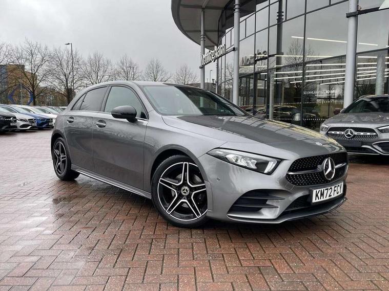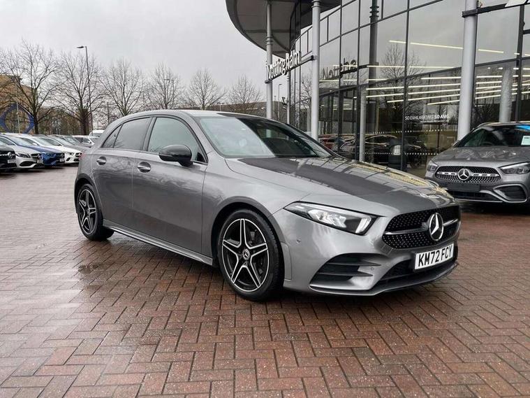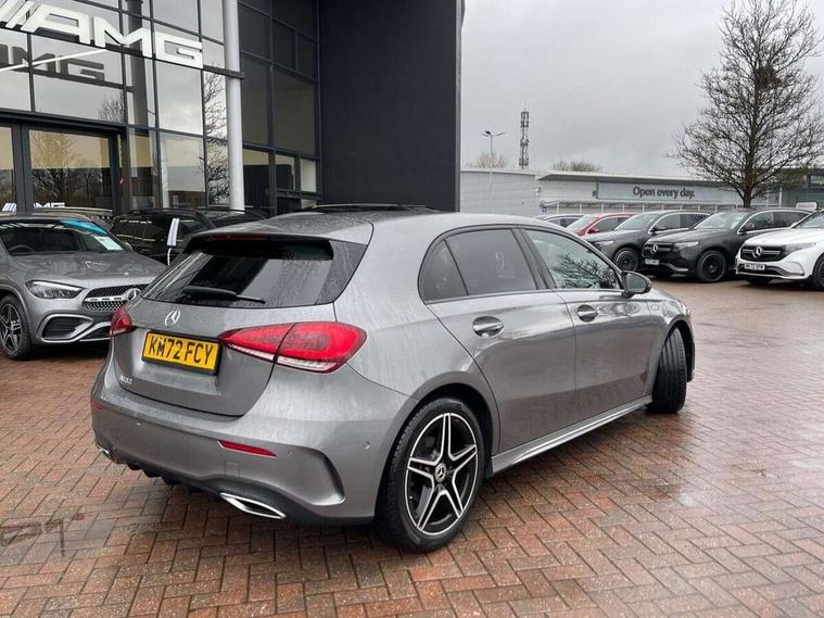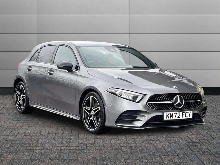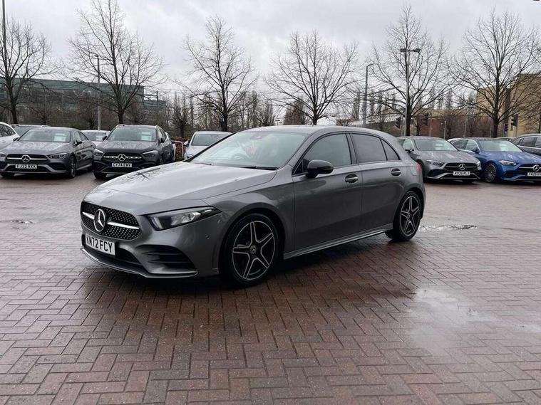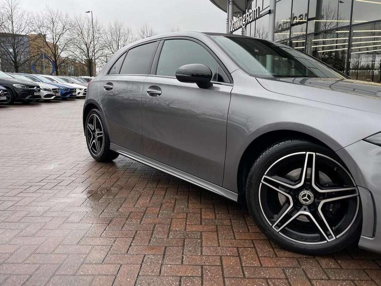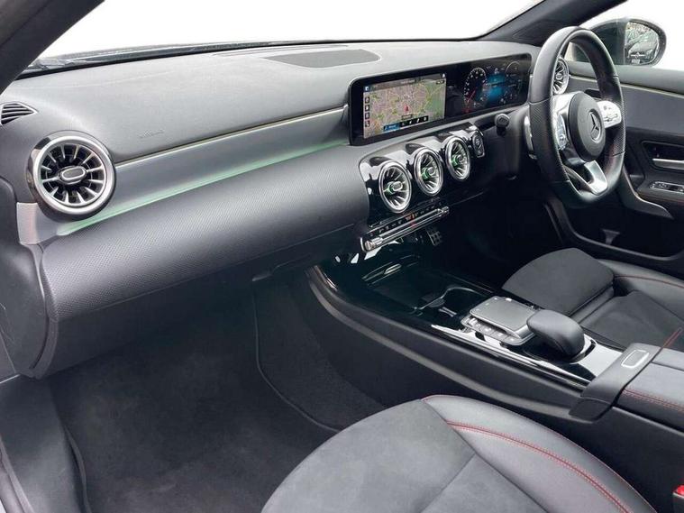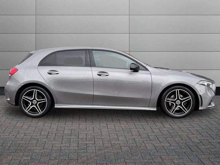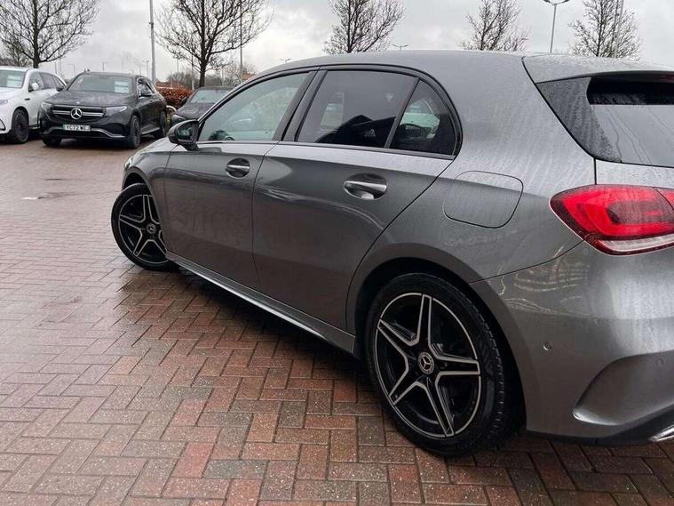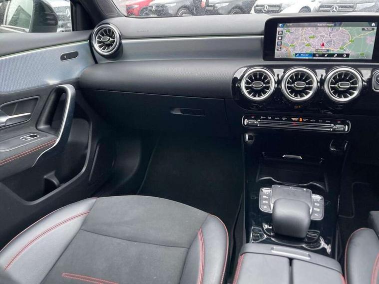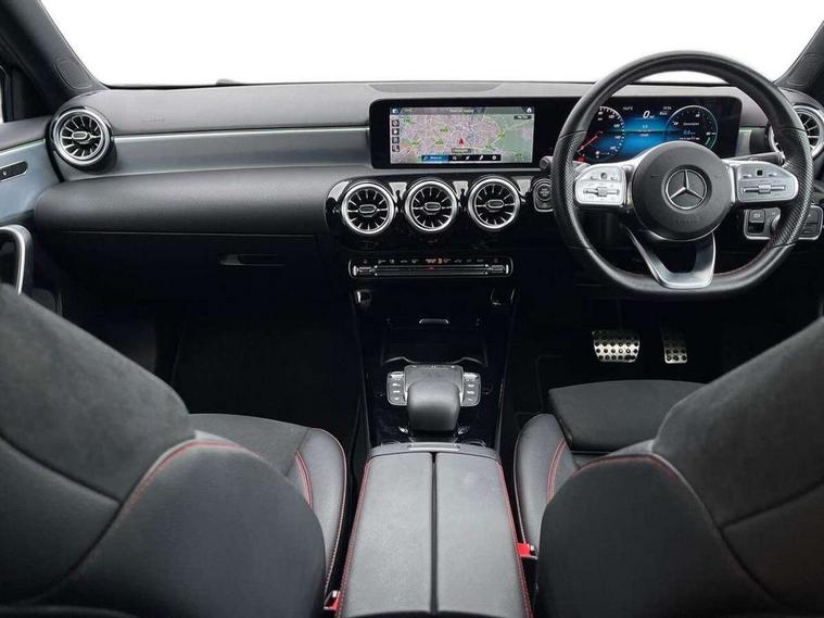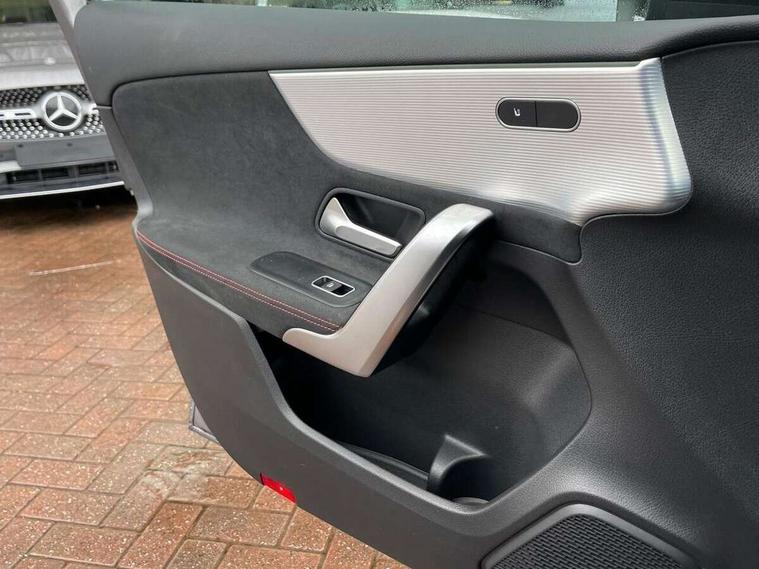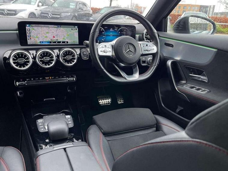 10.25" Digital instrument cluster display screen, 10.25" media display, 180 degree rear view camera with parking guidelines, Active parking assist with visual and audible warning of detected obstacles, Attention assist, Brake pad wear indicator warning light, Car wash mode, Cruise control + speed limiter, Direct steering, Dual bluetooth interfaces, DYNAMIC SELECT with a choice of driving modes (ECO, Comfort, Sport and Individual), ECO start/stop function, Fluid level warning indicator for fuel, oil, coolant and washer fluid, Hard-disk navigation, Hey Mercedes Voice activation, Lamp failure indicator, Lane keeping system, Mercedes me connect including emergency call system, accident recovery, breakdown and maintenance management, Mercedes me remote services, Outside temperature gauge, Owners manual in English, Pre-installation for private car sharing, Preinstallation for Mercedes Benz link, Service indicator (ASSYST), Smartphone integration with Apple CarPlay and Android auto, Speed limit assist, Speed sensitive power steering, Trip computer, Ultrasonic sensors positioned in the front and rear bumpers, Lowered comfort suspension, Rear axle torsion beam, 2 USB ports (type C) in rear stowage compartment and one in front of center console, 6 speakers, DAB Digital radio, MBUX multimedia system with DAB digital radio and touchpad including satellite navigation, Mercedes-Benz sound system - 100W, 4 Electric Front and Rear windows, Adaptive brake lights, AMG bodystyling - Front apron with splitter in chrome, rear apron with chrome trim and chrome visible trim elements in tailpipe, Automatic headlights, Black weather strip, Body colour bumpers, Body colour door handles with chrome inserts, Body colour side skirt, Electric adjustable and heated door mirrors with integrated LED side indicators, Exclusive diamond radiator grille, Exhaust system - Twin visible tailpipes in polished stainless steel, Headlamp assist automatic headlamp activation, Heated glass rear windscreen + timer control, LED High level third brake light, LED high performance headlamps with integrated LED daytime running lights, LED tail lamp, Privacy glass, Radio aerial, Rain sensing windscreen wipers with two sensitivity settings, Rear fog lights, Rear side wing doors, Rear wiper, 3 seat bench in 2nd row, 3 Spoke flat bottom leather multi function steering wheel with perforated leather in grip area, 40:20:40 split folding rear seats, Artico man-made leather/Microfibre Dinamica upholstery with red contrast stitching, Auto Mercedes-Benz child seat recognition sensor, Black air vents with surround in silver chrome, Black roof lining, Brushed stainless steel sports pedals with rubber studs, Controller on centre console with chrome surround, Floor mats with AMG lettering, Front centre armrest with storage compartment, Front seat backs luggage nets, Galvanished gear shift paddles on steering wheel, Heated front seats, Height/reach adjustable steering column, Illuminated Mercedes Benz lettering front door sills with changeable cover, Interior lighting - 64 colour Ambient lighting, Interior mirror with reading lamps in black and frameless, Manual height adjustable front seats, Rear head restraints, Seat occupancy sensor for front passenger seat, Single front passenger seat, Sports seats with integrated headrests, Stowage compartment in centre console with retractable cover, Sunvisors with illuminated vanity mirrors, Touchpad on center console, Twin front cupholders, Two zone thermotronic luxury automatic climate control, Light and sight pack - A Class, Mirror package - A Class, Night pack - A Class Saloon/Hatchback, Seat comfort pack - A Class, 3 rear 3 point seatbelts, ABS with Brake Assist, Active bonnet, Active brake assist includes forward collision warning system with autonomous braking, Adaptive brake assist with hold function and hill start assist, Black seatbelts, Childproof locks manually operated for rear doors and electrically operated for rear power windows, Crash responsive emergency lighting, Driver and passenger head and side airbags, Drivers knee airbag, Dual stage driver/passenger airbags, Electronic parking brake, ESP curve dynamic assist, ESP with ASR, Front and rear seatbelt reminder, Front brake callipers with Mercedes Benz lettering, ISOFIX and top tether child seat fixing points in two outer rear seats, Tyre pressure monitoring system, Warning triangle and first aid kit, Window airbags, Alarm system/interior protection/immobiliser, Keyless Go, Remote central locking and crash sensor with emergency opening function, Urban guard vehicle protection system with immobiliser and interior protection, Matrix look light longitudinal grain aluminium trim element, 18" AMG 5 twin spoke light alloy wheels aerodynamically optimised painted in black with highsheen finish, Summer tyres, Tirefit sealant kit,