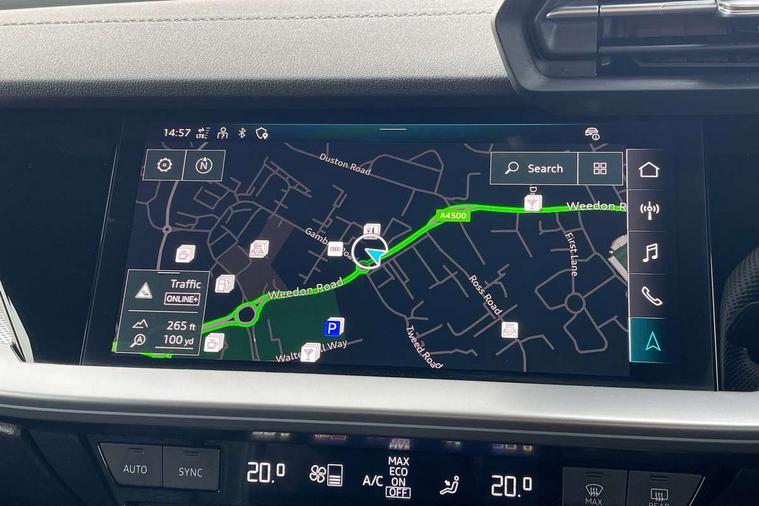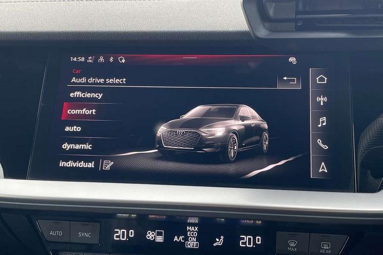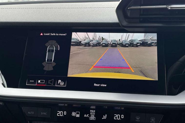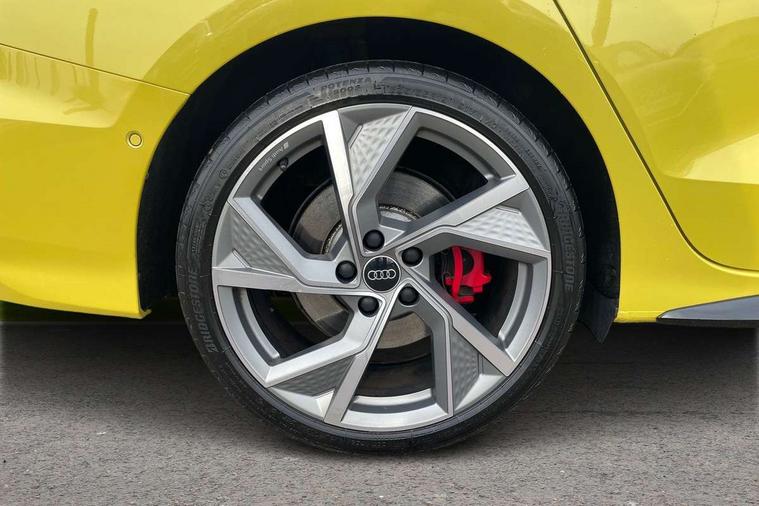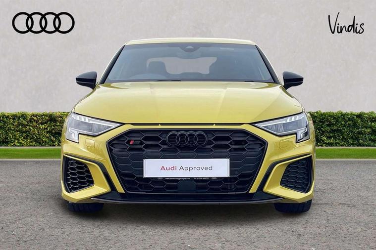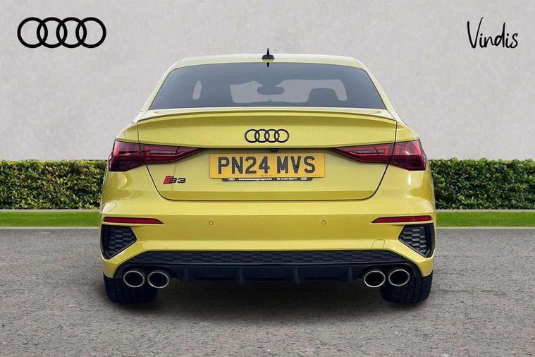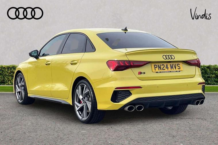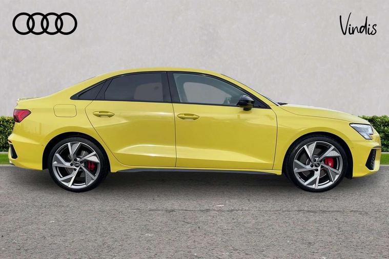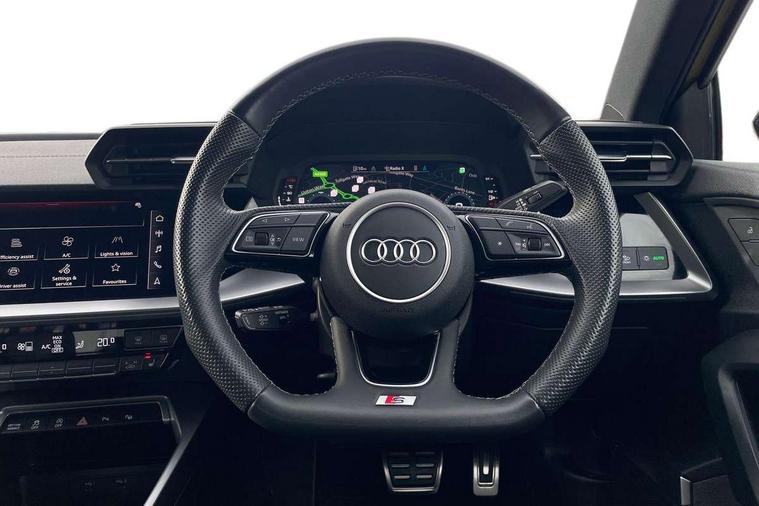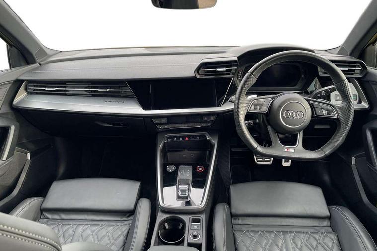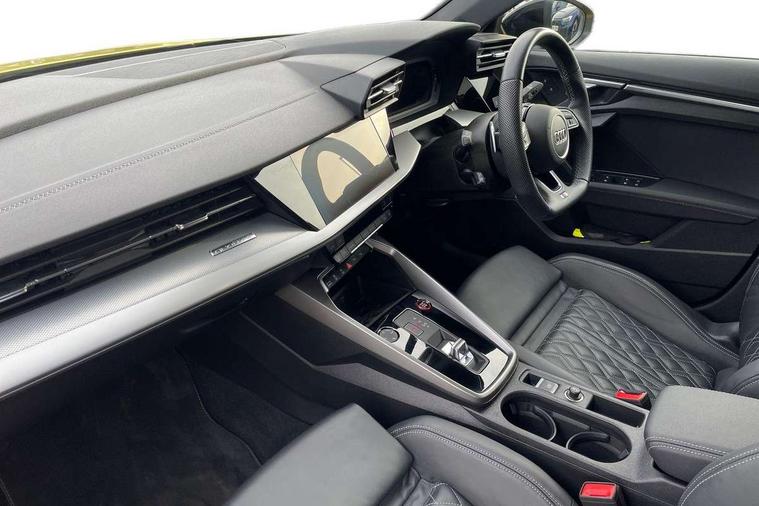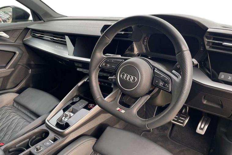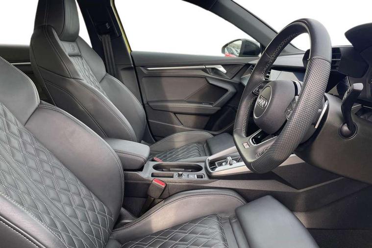 Audi drive select (Auto, Comfort, Dynamic, Efficiency and Individual), Audi smartphone interface, Audi Virtual Cockpit - 10.25" digital and colour instrument cluster, Automatic start/stop system with recuperation, Bluetooth interface, Camera based traffic sign recognition, Collision avoidance assistant, e-Call (emergency call), Lane departure warning system, MMI Navigation Plus with high resolution 10.1" colour touch screen display, Progressive steering, Service indicator, Trip computer, Voice control system with natural language interaction, Quattro permanent all wheel drive, S sport suspension with spring damper adjustment and lowering by 15mm, 2xUSB-C connection with data and charging functions, CD player, DAB Digital radio, 3rd brake light, Acoustic glass windscreen, Audi Beam uses LEDs to project the Audi logo onto the ground as you exit your S3, Auto dimming frameless rear view mirror, Dual branch oval twin tailpipes in chrome plated finish, Electrically adjustable/heated/folding/auto dimming door mirrors with integrated LED indications + kerb view function for passenger side, Front electric windows, Headlight washers, Illuminated door sills with aluminium inserts at the front with S logo, LED daytime running lights, LED headlights with LED rear lights and dynamic rear indicators, Light and rain sensors, Model and engine designation badges at rear, Privacy glass - dark tinted rear window, rear door and side windows, Rear boot, Rear electric windows, Rear side wing doors, 12V socket and storage compartment in front centre console, 3 seat bench in 2nd row, 3 spoke flat bottomed leather multifunction sport steering wheel with gear shift paddles, 4 way electrically adjustable lumbar support for driver and front passenger, 60/40 split folding rear seat bench, Black cloth headlining, Dual zone electronic climate control, Fine Nappa leather upholstery with front sports seats S embossed logo, Front and rear centre armrest in artificial leather, Front and rear headrests, Front/rear floor mats, Height and reach adjustable steering wheel, Interior lighting - glove compartment light and right hand side, Luggage compartment floor covering, Manual boot compartment lid, Manually adjustable front seats, Single front passenger seat, Stainless steel pedals and front footrest in black, Aluminium interior elements pack - A3, Black styling pack - A3 Saloon/S3, Body styling design pack - S3, Extended ambient lighting pack - A3/S3 Saloon, Storage pack - A3/S3 Saloon, Technology pack with parking assist - A3 Saloon, 3x3 point rear seat belts, Driver and front passenger airbag with passenger airbag deactivation, Electronic Stabilisation Control (ESC) including ABS, ASR and EDL, First aid kit with warning triangle and 2 safety vests, Front side airbags with head airbags and interaction airbag, Pre-sense front with pedestrian and cyclist detection, Seatbelt monitoring, Tyre pressure loss indicator, Anti theft alarm, Anti-theft wheel bolts, Electronically operated child locks, Immobiliser, Remote control central locking, Aluminium air vent surrounds, Dark spectrum aluminium inlays, accent surfaces in the dashboard and centre console in platinum grey silk effect paint finish,