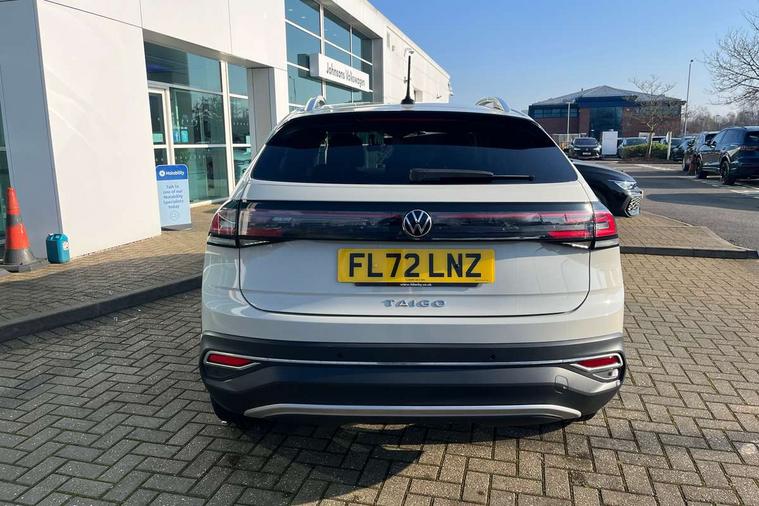 App-Connect including App-Connect Wireless, Digital cockpit pro - 10.25" high resolution TFT dash display screen with customizable menus and information, Driver alert system, e-Call (emergency call), Power Steering, Travel assist including emergency assist, Washer fluid level indicator, Wireless Charging including Bluetooth, Rear shock absorption, Start-stop system with battery regeneration (recuperation - energy recovery during braking), Digital radio reception (DAB+), Diversity antenna for FM reception, WeConnect plus, Advanced high beam control dynamic light assist for LED matrix headlamps, Ambient lighting with logo projection, Aspherical driver's exterior mirror, Body coloured bumpers and radiator grille with chrome trim and front fog lamps with chrome bezel, Body coloured exterior mirror housings and door handles, Dual chrome twin tailpipes on left and right, Dynamic headlight range control, Electric windows, Exterior ambient lighting in illuminated front grille, External USB type C socket and charging sockets, Front fog lamps with cornering function, LED matrix headlamps, LED rear combination lamp, LED third brake light, Left convex exterior mirror, Power folding adjustable/heated exterior mirrors and front passenger exterior mirror lowering function, Rear fog light on one side, reversing light on both sides, Rear side wing doors, Rear wash/wipe with intermittent wipe setting, 12V socket in centre console, 2 front reading lights, 3 rear head restraints, 3 seat bench in 2nd row, Air care climatronic air conditoning system with active combination filter and 2-zone temperature control, Black carpets, Child seat anchor for child seat system i-Size, 2x top tether and child seat anchor in front on front passenger side, Chrome bezel for instrument cluster, vents, door handles + gear shift, Driver and front passenger seat height adjustment, Front + rear carpet mats, Front centre armrest, Front footwell illumination, Front sports comfort seats, Height and reach adjustable steering wheel, Interior ambient lighting and surround lighting, Leather trimmed gear knob, Leather wrapped multifunction steering wheel, Luggage compartment floor, Luggage compartment light, Lumbar support for driver's and front passengers seat, Single front passenger seat, Split folding backrest with centre armrest and unsplit rear seat bench, Storage compartment under front seats, Sun visors with illuminated vanity mirrors, Chrome Package - Taigo, Drivers assistance pack - Taigo, Light and sight pack - Taigo, 2 x 3-point seatbelts/outer rear seats with ECE label, 3-point seat belts in front with pretensioner and height adjustment, 3-point seatbelt for centre rear seat, Driver and front passenger airbags with front passenger airbag de-activation, front side and curtain airbags, Driver and front passenger safety-optimised head restraints, Electronic stability control, Extended and predictive pedestrian/ cyclist protection, Front and rear disc brakes, Front curtain and side airbags with center airbag, Hill start assist, Manual rear child locks, Single tone horn, Tyre pressure loss indicator, Anti-theft alarm system with interior monitoring, backup horn, and towing protection, Anti-theft wheel bolts, Low rolling resistance tyres,