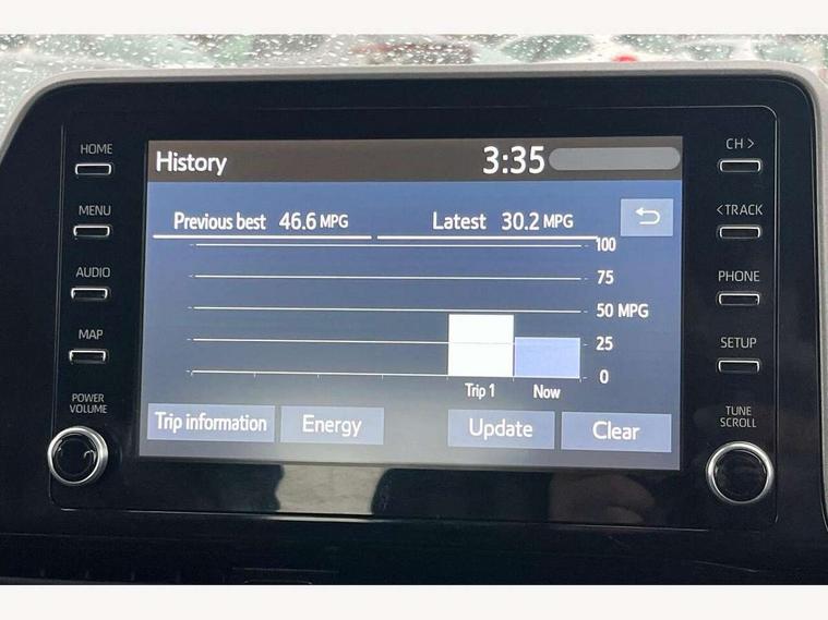 4.2" coloured TFT screen for multi-information display, Adaptive cruise control, Bluetooth connectivity, E-call, Electric power steering, Hybrid system indicator, Lane departure alert with steering control, Remote boot door release in cabin, Remote boot door release in key, Reversing camera, Road sign assist - RSA, Trip computer, Voice recognition, Vehicle Stability Control (VSC), 6 speakers, AM/FM radio, DAB Radio (Digital Audio Broadcasting), Toyota touch 2 multimedia system with 8" display, USB connector, Wi-fi connectivity, Anti-jam protection on power windows, Auto high beam, Auto up and down function on all power windows, Automatic headlights, Automatic headlights cut-off, Black and body coloured rear bumper, Black upper front grille, Body colour door handles, Body colour door mirrors, Body colour front spoiler lip, Body coloured front bumper, Boot door release with push button, Electric heated door mirrors, Follow me home headlights, Front and rear power windows, Front fog lights, Honeycomb lower front grille, LED daytime running lights, LED front light guide, LED High mounted stop light, LED rear brake lights, LED rear combination lights, Manual headlight levelling, Manually retractable door mirrors, Noise reduction layer on front windows and windscreen, Power adjustable door mirrors, Rain sensor, Rear side wing doors, Rear spoiler, Rear tailgate, Rear window defogger, Rear window wiper, Reflective LED headlights, Shark fin antenna, UV-filter on driver and passenger windows, UV-filter on rear windows, 12v power outlet - front, 3 rear headrests, 3 seat bench in 2nd row, 3 spoke leather steering wheel, 60/40 split folding rear seat, Adjustable rear headrests, Adjustable speed limiter switch on steering wheel, Assist grips front and centre pillar, Audio and telephone switches on steering wheel, Black front door assist grips, Boot light, Chrome interior door handles, Cloth upholstery, Driver and front passenger personal light, Driver and front passenger Whiplash Injury Lessening seats, Dual zone automatic air conditioning, Floor mats, Front cupholders, Front head restraints, Front sports seats, Glovebox with internal light, Hard tonneau cover, Hooks for luggage holding net, Humidifying Nanoe air purifier, Illuminated entry system, Isofix attachments on rear seats, Leather gearshift, Light on driver sun visor, Light on passenger sun visor, Manual telescopic steering wheel, Manual tilt steering wheel, Manually adjustable lumbar support on driver seat, Manually height adjustable driver seat, Manually height adjustable front passenger seat, Manually reclining driver seat, Manually reclining front passenger seat, Manually sliding driver seat, Manually sliding front passenger seat, Microphone on front personal light, Mirror on driver sun visor, Mirror on passenger sun visor, Multimedia switches on steering wheel, Pollen filter, Shopping bag hooks, Single front passenger seat, Slow opening on lower glovebox, Voice recognition switch on steering wheel, 16 Disk front wheel brake, 3x3 point rear seatbelts, ABS+EBD+Brake assist, Electronic parking brake, Front and rear seatbelt reminder, Front passenger airbag on/off switch, Hill start assist control (HAC), Pre collision system with pedestrian detection, Pre-tensioners and force limiters, Rear door child safety locks, SRS Airbags - Driver + Front passenger, front side, front and rear curtain and driver's knee airbags, Toyota safety sense, Tyre pressure monitoring system, Acoustic vehicle alert system (AVAS), Glass-breaking alarm sensors, Immobiliser, Intrusion alarm, Intrusion sensor, Motion sensor alarm, Power door locks, Power passenger window lock, Remote central locking, Black lower dashboard, Black upper dashboard, Grey deco line on upper dashboard, Matte black centre console, Tyre repair kit,
