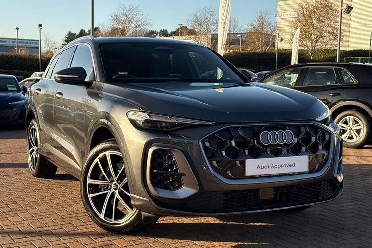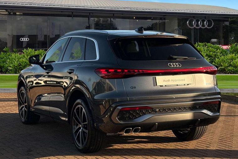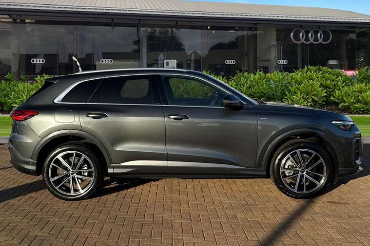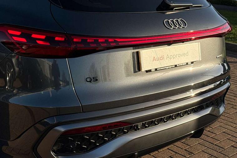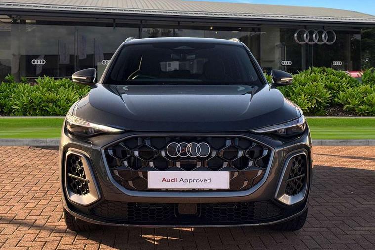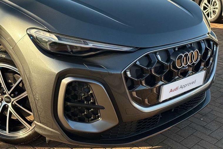 Adaptive cruise control, Advanced driver attention alert, Audi application store, Audi connect emergency call and service, Audi drive select, Audi smartphone interface, Audi virtual cockpit plus with 11.9" OLED colour display, Camera based traffic sign recognition, Fatigue monitor, Front cross traffic intersection assist, Lane departure warning system, MMI navigation plus with high resolution 14.5" OLED touchscreen colour display, Park assist plus, Parking system plus with 360 display, PAS, Reversing camera, Traffic sign based speed limiter, 2 USB-C ports in both the front and rear, Audi sound system impressive sound with 8 loudspeakers including centre speaker and subwoofer, 6-channel amplifier with a total output of 180 watts, DAB Digital radio, Smartphone compartment with wireless charging, Aluminium roof rails, Auto dimming rear view mirror, Body coloured door mirrors, Coming/leaving home lighting function, Electrically adjustable heated and folding + automatically dimming exterior mirrors, Front and rear electric windows, Front door sill trims with aluminium inlays, illuminated with 'S' logo, Grill frame, inlay and front air inlets in matt anthracite chrome, Headlight cleaning system, Heated rear window, High beam assist, High gloss window surrounds, LED headlights plus incl. digital DRL, dynamic coming and leaving home function with turning/all weather/motorway/manouevring and intersection lights, LED rear lights pro incl. dynamic rear indicators and illuminated light strip with animated coming and leaving home function, Logo projection light in exterior mirrors, Privacy glass, Projection third brake light for rear window in LED, Radiator grille in phantom black, Rear and side windows with heat insulating glass, Rear honeycombe grille in matt black with inlay in matt anthracite chrome, Rear side wing doors, Rear wash/wipe, S Line badge on the front wings, S line bumpers in contrasting Volcano grey metallic paint finish, Towbar preparation, Windscreen with acoustic glazing, 3 rear head restraints, 3 seat bench in 2nd row, 3 spoke leather steering wheel with multi-function buttons with touch control, flattened on top and bottom, with S badging and contrast stitching, Comfort centre armrest front, Deluxe 3 zone electronic climate control, Front and rear floor mats, Front sport seats with integrated head restraints, Headlining in black cloth, Heated front seats, i-Size child seat mounting on the front passenger side and outer rear seats, i-Size and top tether on the outer rear seats, Interior trim in aluminium look, Luggage compartment lid, electrically opening and closing, Manual steering column adjustment, S embossed logo on front sport seats, Single front passenger seat, Softwrap in leatherette, Stainless steel pedals and footrest, Steering wheel grips in perforated leather and shift paddles, Ambient lighting package plus - Q5, 3x3 point rear seatbelts, ABS, Acoustic vehicle alerting system, Convenience key with safelock, Driver and front passenger airbag with passenger airbag deactivation, Electric child safety locks, First aid kit with warning triangle and high visibility vests, Front emergency brake assist, Front side airbags with head airbag system and front interaction airbag, Hill hold assist, Rear seat occupant reminder, Tyre pressure loss indicator, Anti theft alarm, Anti-theft wheel bolts, Accent surfaces and control buttons in gloss black, Anthracite matt brushed aluminium inlays with linear embossing, Black dashboard with contrast stitching, Upper and lower interior elements in artificial leather, Tyre repair kit,