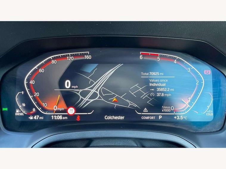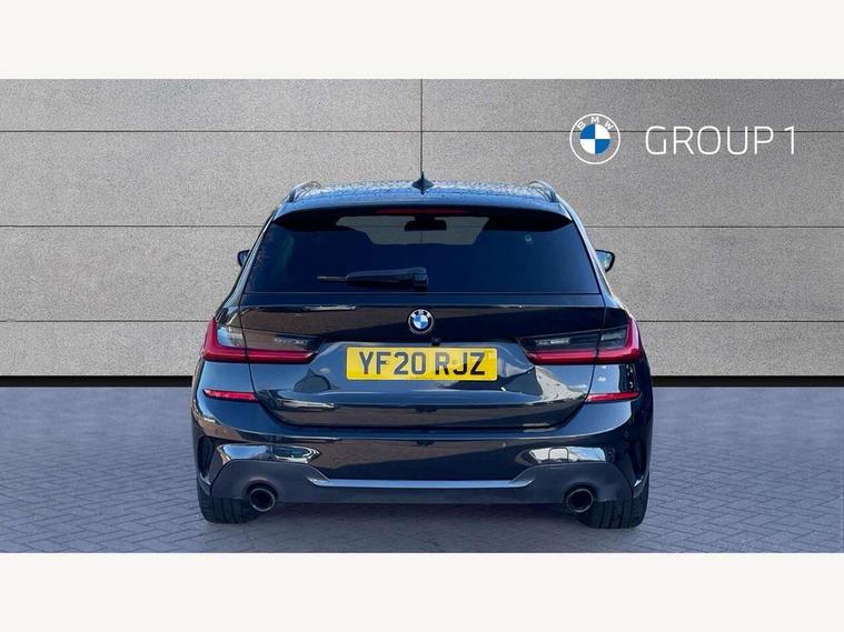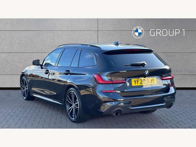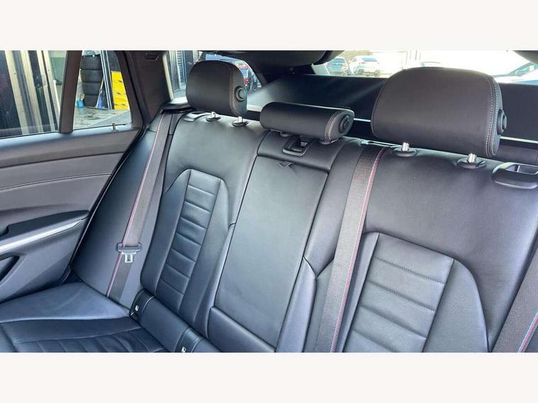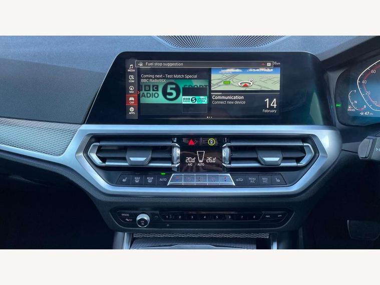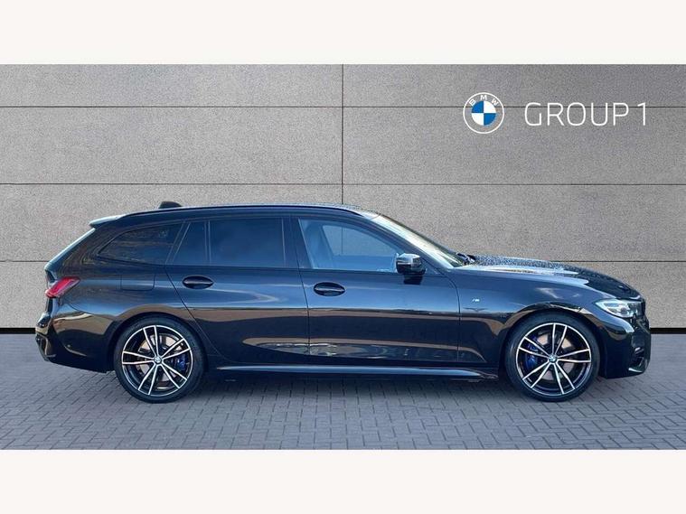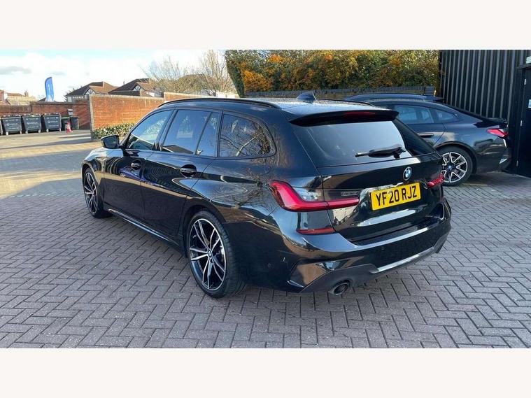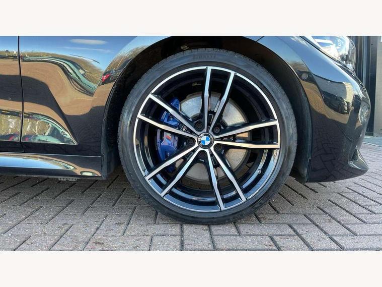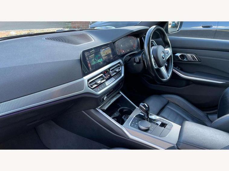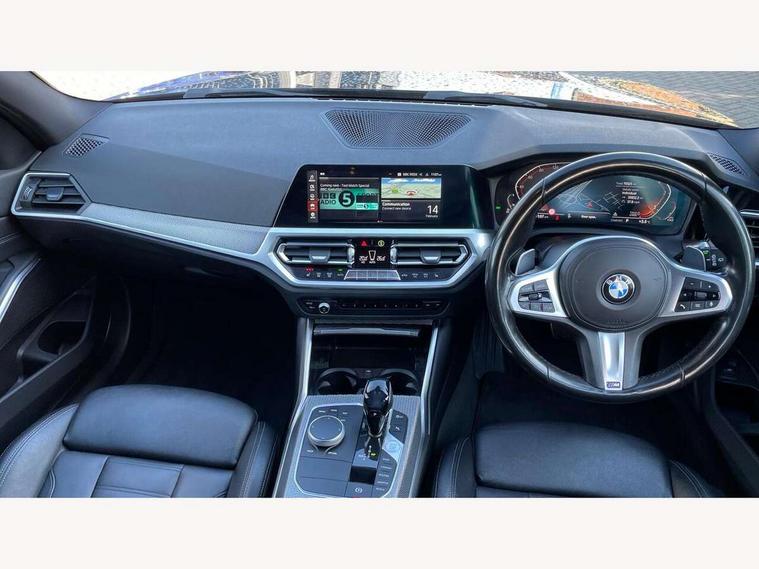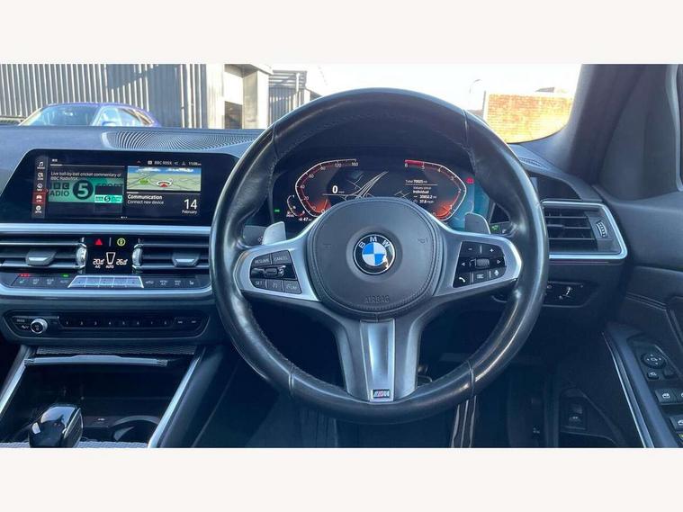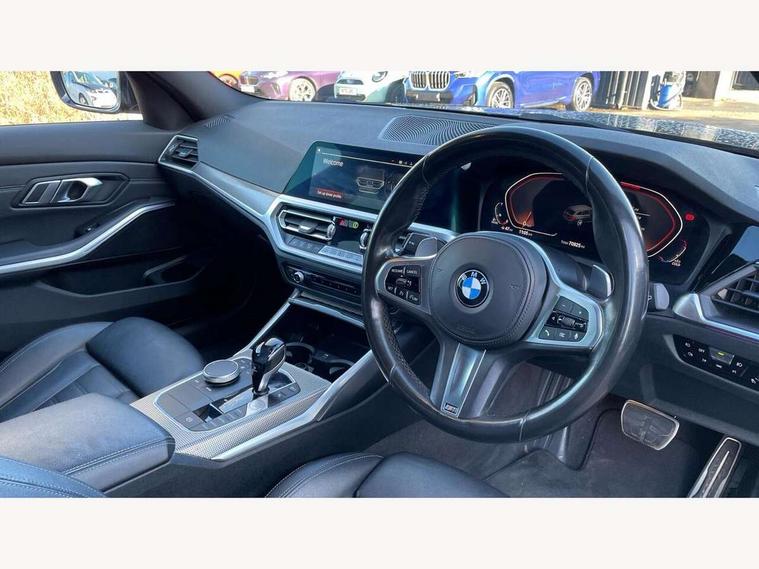 Active guard plus, Attentiveness assist, BMW iDrive controller on centre console, BMW Live Cockpit Professional Nav with 12.3" instrument display + 10.25" display, Intelligent Voice Assist, BMW OS 7, HDD, 2USB, 4G LTE connect, BMW service history, BMW Teleservices, Brake pad wear indicator in front and rear, Check Control warning system for monitoring of lights and door/luggage compartment open warning, Condition based service, Electric power steering with Servotronic steering optimised at all speed ranges, Instrument cluster with speedometer with mph readout, tachometer, fuel gauge and oil temperature gauge, Integrated owners handbook, Oil sensor for level and grade, warning by check control system, On board computer - average speed+fuel consumption, service interval, clock/date, odometer/trip meter, outside temperature display and ice warning, Optimum shift indicator, Personal Profile - automatic lock when driving away selectable, Recovery braking system, Variable sport steering, Balanced 50/50 weight distribution, Battery cut-out switch, Diesel particulate filter, Drive performance control - ECO PRO, comfort and sport modes, Electronic differential lock control (EDLC), Incorrect fuelling protection, Larger capacity fuel tank, M sport suspension, Sport automatic transmission with steering-wheel mounted gearshift paddles and launch control, Stroke dependent dampers, DAB tuner, Electronic service booklet, Acoustic glazing, Automatic headlight beam throw control with load dependent regulating reaction, dynamic compensation of braking dive and acceleration squat, Black roof mouldings, Body colour door handles, Body colour fuel filler flap, Body colour mirror caps, Dynamic brake lights, Electric windows - front and rear, with open/close fingertip control, anti-trap facility and comfort closing, Exhaust tailpipe - split left and right, Exterior mirrors - electrically folding with anti-dazzle, Fading support, Front and rear bumper system with replaceable deformation elements, Front black door sill finishers with BMW designation, Green tinted heat protection glazing, Interior rear view electrochromatic mirror with automatic anti dazzle function, LED daytime running lights, LED front fog lights, Lightweight engineering, M designation on front side panels, left and right, Matt black exterior B pillar, Model designation on right side of tailgate, Rain sensor with automatic headlight activation, Rear wiper, Shark fin antenna, Two part LED tailights in L-shape with components in smoked glass, brake light, LED turn indicator and rear fog light, Visible VIN plate, Welcome lights in interior and door handle area, Windscreen wipers with integrated washing jets, 12V power socket in front storage compartment, 2 front cupholder in centre console with clamping elements and matt black inlay, 3 rear seats with non folding headrests with 3 point seat belts, 3 zone automatic air conditioning, 4 pieces lashing eyelets in luggage compartment, 40:20:40 split folding rear seat with loading system, Ambient lighting with welcome carpet light, Anthracite headlining, Armrest integrated in front and rear door trim + front centre console armrest, Centred top Luggage compartment lights, Four grab handles integrated in roof lining, Front and rear door exit lighting (left / right), Front and rear door pockets, Front and rear reading lights, Front and rear velour floor mats, Front head restraints, Front sport seats, Heated driver and front passenger seats, Height adjustable mechanically and infinitely variable steering column, Illuminated armrest storage compartment, Illuminated glove compartment with separate small compartment, Interior lighting - front centre over interior mirror with soft light, rear centre and front and rear footwell lighting, M Sport multifunction leather steering wheel, Make-up mirror lights, Rear centre armrest with 2 cupholders, Rear centre console with storage compartment and ventilation grille, Sunvisors with vanity mirrors and ticket pocket, Toolkit located in luggage compartment, Connected pack professional - 3 Series Saloon/Touring, M Aerodynamics pack - 3 Series Saloon/Touring, 2 tone horn, BMW emergency call, Brake energy regeneration, Braking pre-tensioning, Child proof locking system in rear door, Child seat ISOFIX attachment rear outer seats, Coasting in idle in ECO PRO mode, Crash sensor activating of airbags, Unlocking doors, hazard warning lights, interior light, safety battery terminal, Driver and front passenger side airbags, integrated in the door side seat backrest bolsters for all seat variants, Driver/Front Passenger airbags, Dry braking, Dynamic brake control, Dynamic stability control + (DSC+) - Anti-lock Braking System (ABS) with brake assist and cornering brake control + Automatic Stability Control (ASC), Dynamic Traction Control - DTC, Electric parking brake including automatic hold function and automatic release of the parking brake when driving off, Front passenger manual airbag deactivation, Head airbags for all 4 outer seats, Hill start assist, Seat belt security check for driver and front passenger, Side impact protection, Three 3 point seat belts on all seats including front belt stopper, pyrotechnic belt tensioners and belt force limiters, Tyre pressure monitoring with three level warning strategy, Ventilated front and rear disc brakes, Warning triangle and first aid kit, Alarm system (Thatcham 1) with remote control and electronic engine immobiliser, Central locking switch for all doors, fuel filler cap and luggage compartment, Remote control with integrated key one button open/close vehicle and windows, sole opening of the luggage compartment lid and panic mode, Start/stop button with Comfort Go keyless engine start and auto Start/stop deactivation button, Vehicle key with M specific designation, Reduced rolling resistance tyres,