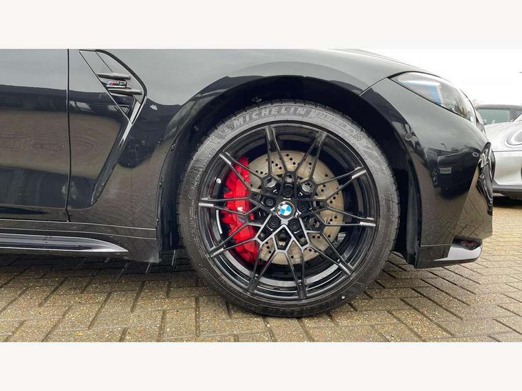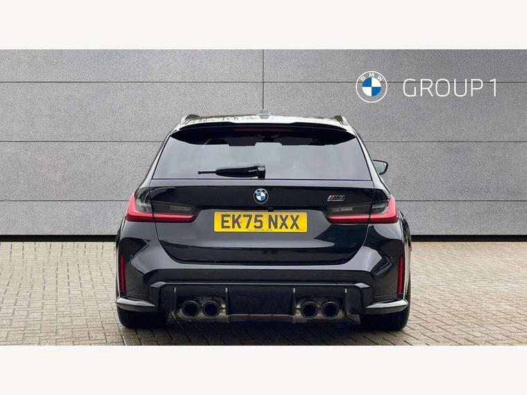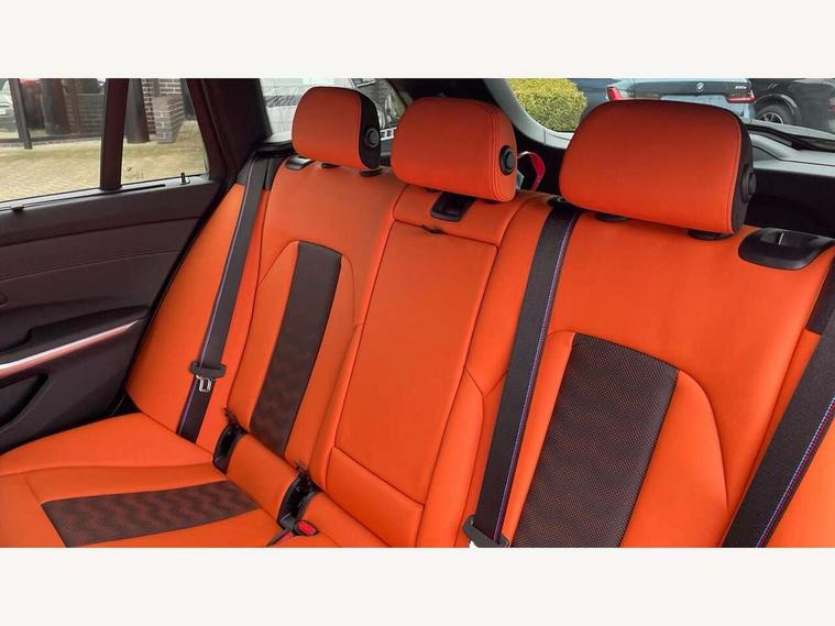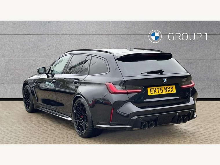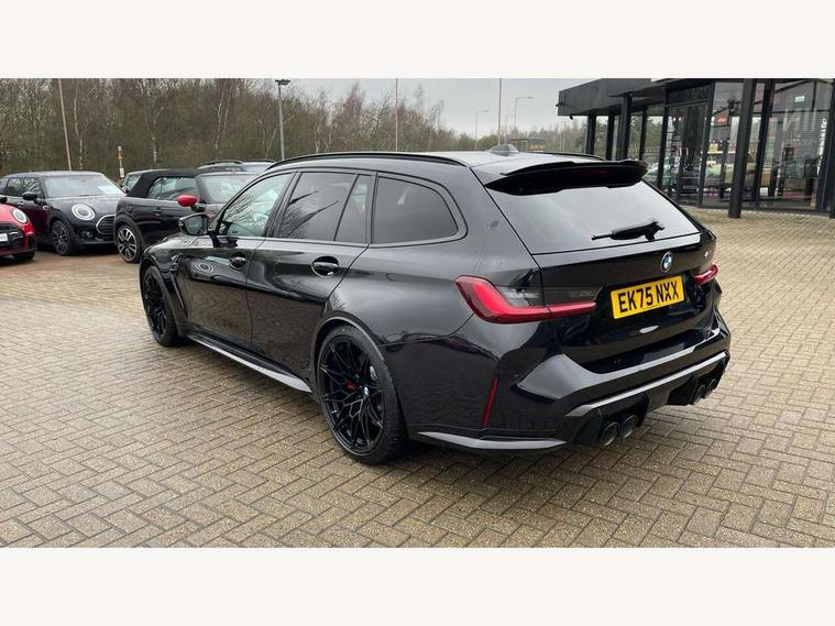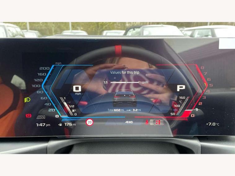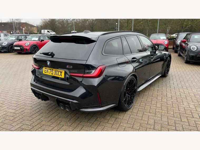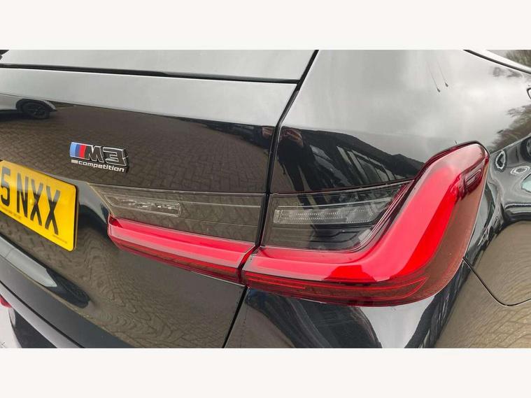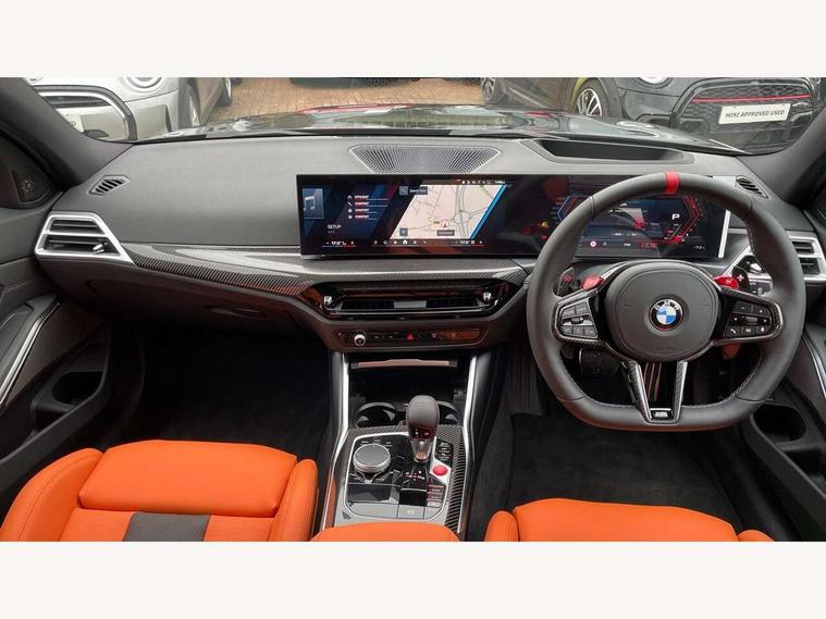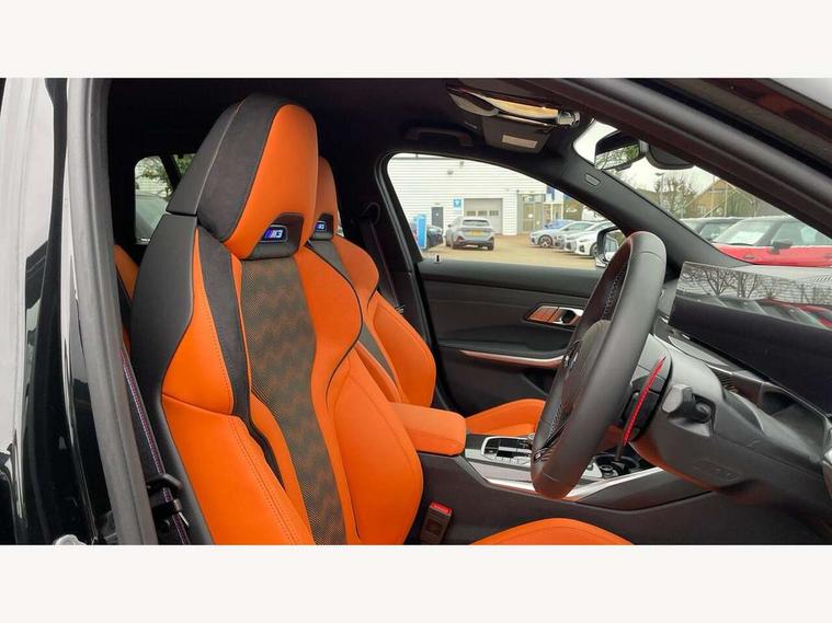 Active Guard, Automatic start/stop system, BMW ConnectedDrive online services, BMW legal emergency call, BMW Live Cockpit Pro with Head up display including 12.3" instrument display and 14.9" high resolution control display with navigation function, BMW Teleservices, Brake pad wear indicator warning light, Condition based service, Cruise control with braking function, Door/boot open warning light, Electric boot lid, Electric Power Steering (EPS) with Servotronic, Language version English, Lights on warning, M drive buttons, Oil sensor for level and grade, warning by check control system, Oil temperature gauge, On board computer, On board diagnostics, Optimum shift indicator, Outside temperature display, Park distance control, Pull away assistant, Run flat indicator, Service interval indicator, Shifting point display, Smartphone integration, Speed limiter, Start/stop button in red, Variable sport steering, Double joint spring strut front axle, Electronic differential lock control (EDLC), M Adaptive suspension, M Drive Professional including track mode, laptimer, traction control & Drift analyser, M Sport differential, Safety battery terminal clamp, Sport automatic transmission with gearshift paddles, Auxiliary point for auxiliary devices, DAB radio with bluetooth music capability, Harman kardon surround sound audio system, Personal eSim, Auto dimming driver's door mirror, Automatic headlights + automatic windscreen wipers, Automatic parking function on front passenger's exterior mirror, Black model designation badges, BMW high gloss shadow line with extended contents, BMW radiator grille, frameless, with horizontal double blind slats, black high-gloss, with model badge, Body colour bumpers, Bonnet and tailgate badge, Carbon fibre reinforced plastic (CFRP) roof, Day time running light, Door mirror integrated indicators, Door sill finishers with aluminium inserts, Dynamic brake lights, Electric adjustable heated door mirrors, Electric folding door mirrors, Electrochromic exterior driver side mirror, Electrochromic interior rear view mirror with automatic anti-dazzle function, Entry sills with aluminium inserts and model badge, Follow me home headlights, Front and rear bumper system, Front and rear plastic apron in vehicle colour, Front door sill strips in aluminium inlays with M3 inscription, Front electric windows with open and close fingertip control, anti trap facility and comfort closing, Headlight beam throw control, Heat protection, sun protection glazing, Heated washer jets, High gloss black lower bumper edges, side sills and diffuser edge binding, High gloss black M roof rails, LED 3rd brake light, LED tail lights with 3D L-shaped LED light design, M designation, Mirror glass aspheric on driver's side, convex on passenger side, Rain sensor, Rear fog lights, Rear reflectors, Rear side wing doors, Rear wiper, Reversing light, Roof fin and roof trim strips in Black high-gloss, Shark fin roof aerial, Strakes in front side panel, black matt/high-gloss black, with model badge, Visible VIN plate, Welcome lighting, 2 cupholders in front centre console, 2 cupholders in rear armrest, 2 rear head restraints, 2 x 12 V Power sockets (luggage compartment and front centre console), 2 x USB Type C ports for charging and data transmission in front centre console, 3 seat bench in 2nd row, 40:20:40 split folding rear seat with loading system, Ambient inside door handle light, Ambient lighting for storage compartment, Ambient lighting front and rear, Anthracite headlining, Battery in luggage compartment, Centre console armrest with storage compartment, Contour lighting for door trim, Driver/passenger sunvisors with ticket holders + illuminated vanity mirrors, Driving experience mode switch, Dual zone automatic air conditioning, Dynamic ambient interior lighting, Electric front seats + driver memory, English handbook, Floor mats in velour, Front and rear door exit lights, Front door storage bins with bottle holder, Front footwell ambient lighting, Front interior light, Front isofix attachment + airbag deactivation, Front reading light, Front seat backrest width adjustment, Front/rear door armrests, Heated front seats, Height adjustable front headrests, Illuminated bow-type door handles in vehicle colour, driver's side with door lock, Interior mirror lighting, Isofix on 2nd row outer seats, Lockable/illuminated glovebox, Luggage compartment lighting, M Sport seats with with illuminated model designation, Multifunction steering wheel, Rake/reach adjustable steering wheel, Single front passenger seat, Storage compartment in rear doors, Storage tray and compartment with cover in centre console, Through loading system, Toolkit located in luggage compartment, Waterfall lighting for central air vent, Wireless charging tray, Connected package professional - M3, Extended storage pack - M3/M4, High gloss shadowline exterior trim pack - M3, 3 point seatbelts on all seats, ABS/EBD, Automatic Stability Control (ASC), Brake energy regeneration, Brake fade compensation, Compound structure brake discs, Cornering brake control (CBC), Crash sensor, Curtain airbags, Driver/Front Passenger airbags, Dry braking, Dynamic brake control, Dynamic stability control + (DSC+), Dynamic Traction Control - DTC, Electromechanical parking brake, Front and rear head airbags, Front seat side impact airbags, Front seatbelt pretensioners + load limiters, Hill start assist, M Sport seat belts, Rear child proof door locks, Seat occupancy detection for driver and passenger side, Seatbelt warning, Side impact protection, Two tone horn, Tyre pressure sensor, Warning triangle and first aid kit, Centre lock switch, Closing system with central locking, Electronic immobiliser, Locking wheel bolts, Remote central locking, Thatcham cat 1 remote alarm, Vehicle Key with 4 buttons including the integrated key, Galvanic embellisher for controls, Tyre repair kit,