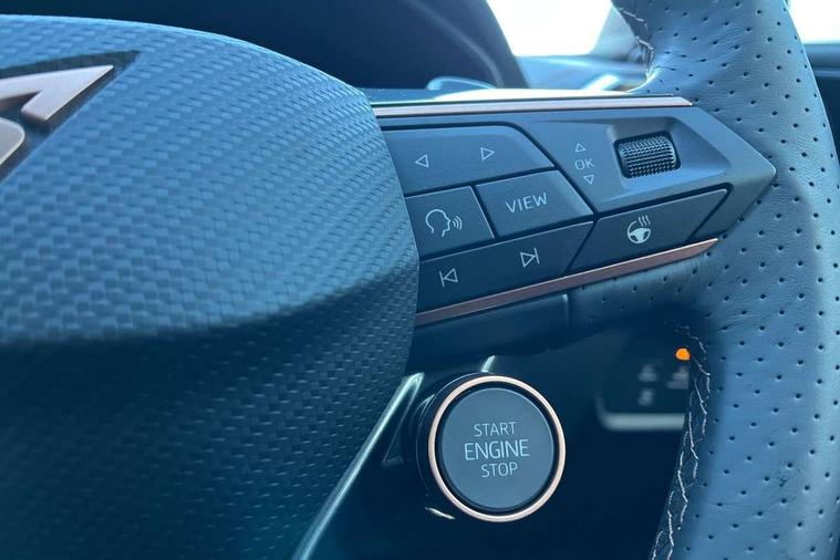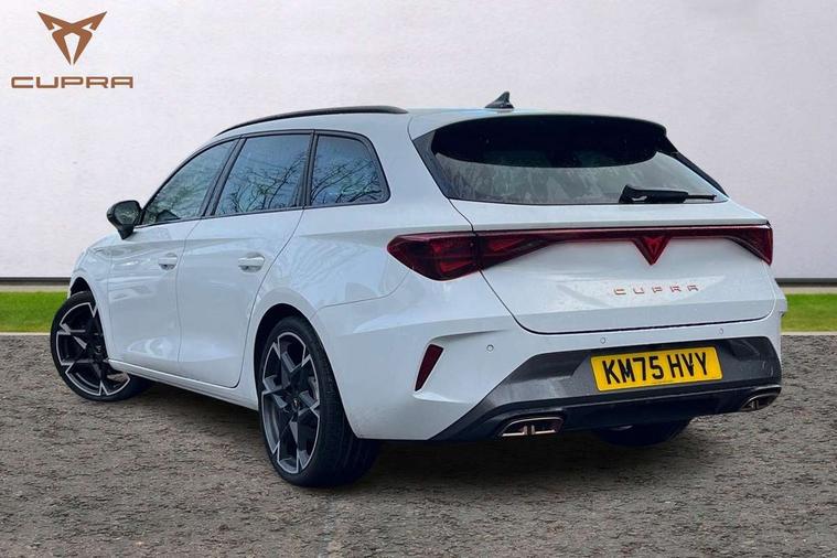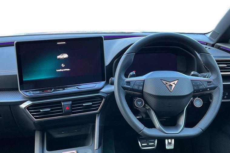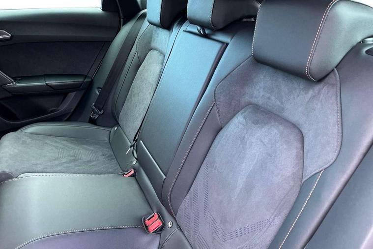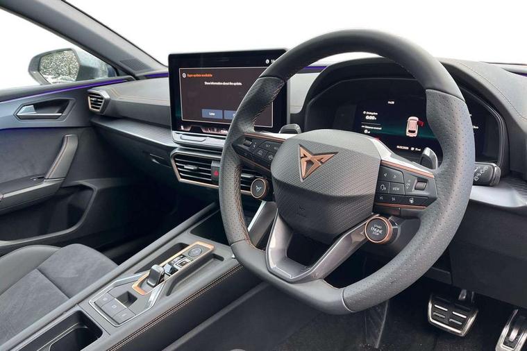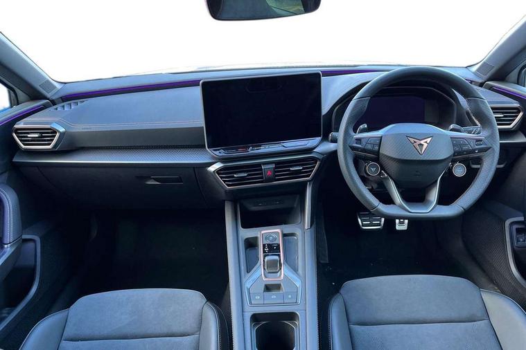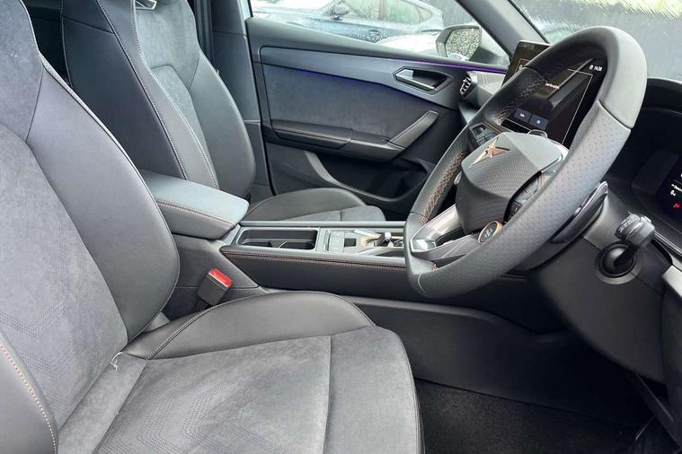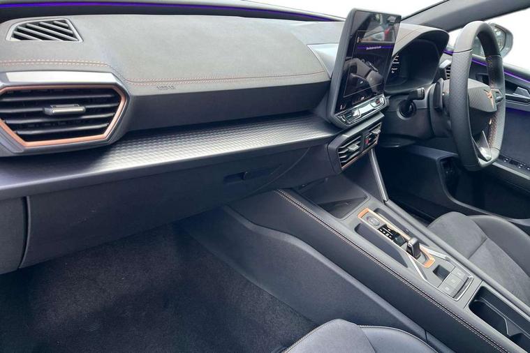 Adaptive cruise control with follow-to-stop and speed limiter, CUPRA mode drive profile selection with throttle response and gearshift mode, Digital cockpit, Driver alert system, Dynamic road sign display, E-call, Front and rear parking sensors, Front assist with forward collision warning braking reaction to vehicles, pedestrians and cyclists, Front cross traffic assist, Full link smartphone integration with Mirror Link, wireless Apple CarPlay and wired Google Android Auto, Lane assist, Lockable tailgate, Rear view camera, RPM, trip computer, outside temp gauge, instrument light brightness, low fuel warning light, lights on reminder, gearshift indicator, Service interval indicator, Start/stop system with regenerative braking, Virtual pedal with electric tailgate, Wireless phone charger, 10 amp mode 2 charging cable, 16 amp mode 3 charging cable, Auxiliary input socket, Auto dimming rear view mirror, Body colour door handles, Body coloured bumpers, Cupra matrix LED ultra headlight with variable light distribution, high definition LED w/signature w/ceremony, Cupra sports bumpers, Dark tinted rear windows, Electric front/rear windows, Electrically adjustable, heated and folding door mirrors, Gloss black roof rails, High beam assist, High-resolution matrix beam plus digital projection, LED front fog lamps with cornering function, LED rear fog lamp, Rain sensing wipers, Rear diffuser with copper simulated exhaust pipes, Rear side wing doors, Rear wash/wipe, Separate daytime running light with automatic headlight control and coming home feature, Third brake light, Welcome light with logo projector in door mirrors, 12v power supply in centre console, 3 seat bench in 2nd row, 5 headrests, 60/40 split rear bench seat with armrest, Ambient lighting (glovebox, footwell, ambient lighting multicoloured), Black headlining, Cupra sports pedals, CUPRA Supersports, heated steering wheel with satellite buttons, Dinamica cloth upholstery, Electrically adjustable driver seat and lumbar support with memory function + manually adjustable passenger seat, Four x USB Type C ports (2 in front and 2 in rear), Front and rear reading lights X 4, Front centre armrest, Heated front seats, Height/reach adjust steering wheel, Illuminated interior front door sills, Interior wraparound lighting, ISOFIX points in outer rear seats with top tether anchorage points, Single front passenger seat, Sliding boot cover, Storage pockets on rear of front seats, Sunvisors with illuminated mirror, Three zone climate control, Dynamic and comfort pack - Leon Cupra, Media system plus with 12.9" display + navigation pack - Leon Cupra, 3 point seatbelts on all rear seats, ABS, Brake control system - ESC and brake booster, Child proof door locks, Cupra black brake calipers, Disc brakes in front, Driver and front passenger airbags with front passenger airbag de-activation, front side and curtain airbags, Electronic parking brake, Hill hold control, Rear disc brakes, Seat belt reminder for front and rear seats, Tiredness recognition system, Tyre pressure monitoring system, Anti theft alarm system with interior monitoring in cab, backup horn and towing protection, KESSY Advanced - Keyless start, keyless entry, Locking wheel bolts, Chrome and copper interior detailing, 19" Polar machined sport black and silver alloy wheel with 91Y tyres, Breakdown kit, Tool kit,