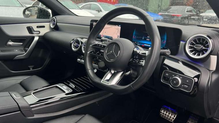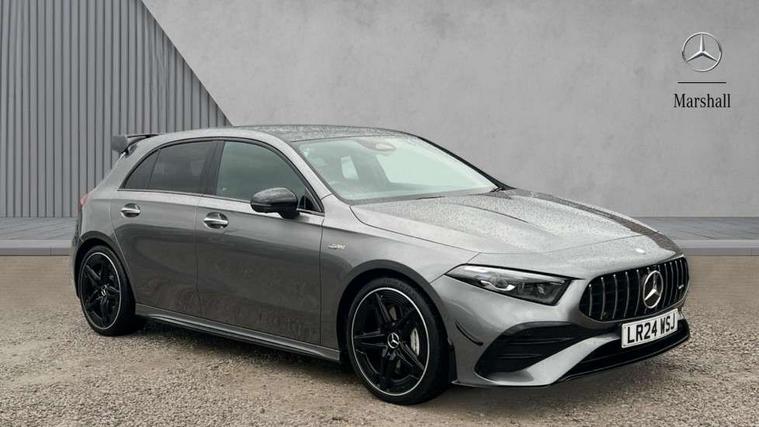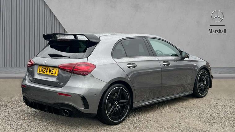 10.25 inch touchscreen central media display, 10.25" Digital instrument cluster display screen, Attention assist, Brake pad wear indicator warning light, Car wash mode, Direct steering, Direction indicators with lane change function, Dual bluetooth interfaces, DYNAMIC SELECT with driving programs (Slippery, Comfort, Sport, Sport+ and Individual), Easy pack tailgate hands-free access, ECO start/stop function, Engine start/stop button, Fingerprint scanner, Fluid level warning indicator for fuel, oil, coolant and washer fluid, Fluorescent jacket for driver, Hard-disk navigation, Head up Display, Hey Mercedes Voice activation, Lamp failure indicator, MBUX augmented reality for navigation, MBUX Interior assistant, Mercedes me connect including emergency call system, accident recovery, breakdown and maintenance management, Mercedes me remote services, Outside temperature gauge, Owners manual in English, Pre-installation of private car share, Preinstallation for Mercedes Benz link, Remote boot closing, Service indicator (ASSYST), Smartphone integration with Apple CarPlay and Android auto, Speed sensitive power steering, Tailgate, Traffic sign assist, Trip computer in multifunction display with current consumption indicator, Wireless charging, AMG suspension, Suspension with adaptive damping system, DAB Digital radio, MBUX multimedia system, Mercedes Benz advanced sound system (225 W) with 10 speakers, 1 central speaker, speakers on doors, a tweeter on door, one sub woofer + boost amplifier, 4 Electric Front and Rear windows, Adaptive brake lights, AMG body styling - AMG front apron with front splitter and AMG rear apron and visible exhaust tailpipe trim elements, AMG Front apron with flics as air deflector elements on the outer air intakes, AMG radiator grille with twin blade lamella and AMG Lettering, AMG Rear apron with specific diffuser look with four vertical fins and two round chrome plated tailpipe trim elements with a diameter of 90 mm, AMG spoiler lip on roof, Beltline strips in High gloss Black, Body colour bumpers, Body colour door handles with chrome inserts, Body colour side skirt, Electric adjustable and heated door mirrors with integrated LED side indicators, Front splitter and trim elements on the louvres in the outer air inlets, Front wings wheel arches with TURBO 4MATIC lettering, Headlamp assist automatic headlamp activation, Heat insulating dark tinted rear and rear side windows, Heated glass rear windscreen + timer control, LED daytime running lights, LED High level third brake light, LED tail lamp, Multibeam LED headlamps with adaptive highbeam assist and cornering function, Panoramic sliding sunroof, Privacy glass, Radio aerial, Rain sensing windscreen wipers with two sensitivity settings, Rear fog lights, Rear side wing doors, Rear windscreen wiper, Surround lighting with logo projection, Wider wheel arches for AMG wheels, Window line trim strip in black, 3 seat bench in 2nd row, 40:20:40 split folding rear seats, Air conditioning - Two zone thermotronic luxury automatic climate control with display, AMG floor mats, AMG Performance steering wheel in nappa leather, Automatic child seat recognition sensor, Black air vents with surround in silver chrome, Black roof lining, Brushed stainless steel sports pedals with rubber studs, Electrically adjustable front memory seats including lumbar support and backrest inclination, Front centre armrest with stowage, Front seat backs luggage nets, Height/reach adjustable steering column, Illuminated AMG front door sills with changeable cover, Interior lighting - 64 colour Ambient lighting, Interior mirror with reading lamps in black and frameless, Rear armrest with 2 cupholders, Seat occupancy sensor for front passenger seat, Silver coloured aluminium gear shift paddles on steering wheel, Single front passenger seat, Sports seats with integrated headrests, Stowage compartment in centre console with retractable cover, Sunvisors with illuminated vanity mirrors, Twin front cupholders, Aerodynamic pack - A Class, AMG night pack - A Class, Light and sight package - A Class, Mirror package - A Class, Parking pack with 360 degree camera - A Class, Seat comfort pack - A Class, USB pack plus - A Class, Winter pack - A Class, 3 rear 3 point seatbelts, ABS with Brake Assist, Active bonnet, Adaptive brake assist with hold function and hill start assist, Black seatbelts, Bonnet with power domes, Childproof locks manually operated for rear doors and electrically operated for rear power windows, Crash responsive emergency lighting, Driver and passenger head and side airbags, Drivers knee airbag, Dual stage driver/passenger airbags, Electronic parking brake, ESP curve dynamic assist, ESP with ASR, Exit warning, Front and rear seatbelt reminder, Front brake calipers with AMG lettering, ISOFIX and top tether child seat fixing points in two outer rear seats, Tyre pressure monitoring system, Warning triangle and first aid kit, Window airbags, Alarm system/interior protection/immobiliser, Guard 360 degree vehicle protection, Keyless entry lock/unlock, Keyless Go, Remote central locking and crash sensor with emergency opening function, Light longitudinal grain aluminium trim, 19" AMG 5 twin spoke light alloy wheels aerodynamically optimised painted in matt black with high sheen rim flange, Summer tyres, Tirefit sealant kit,