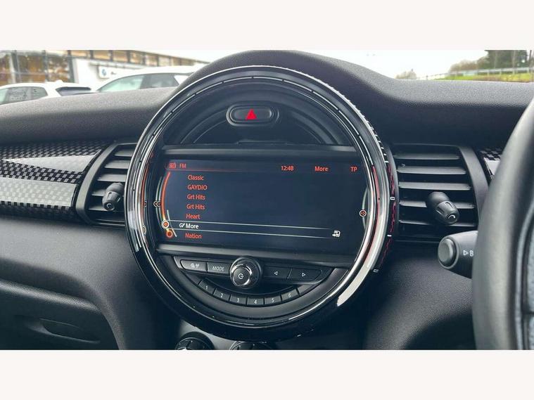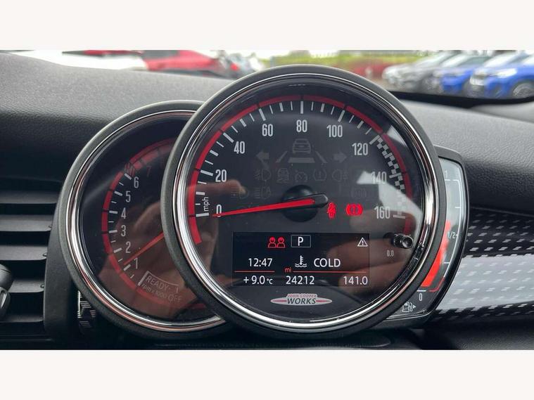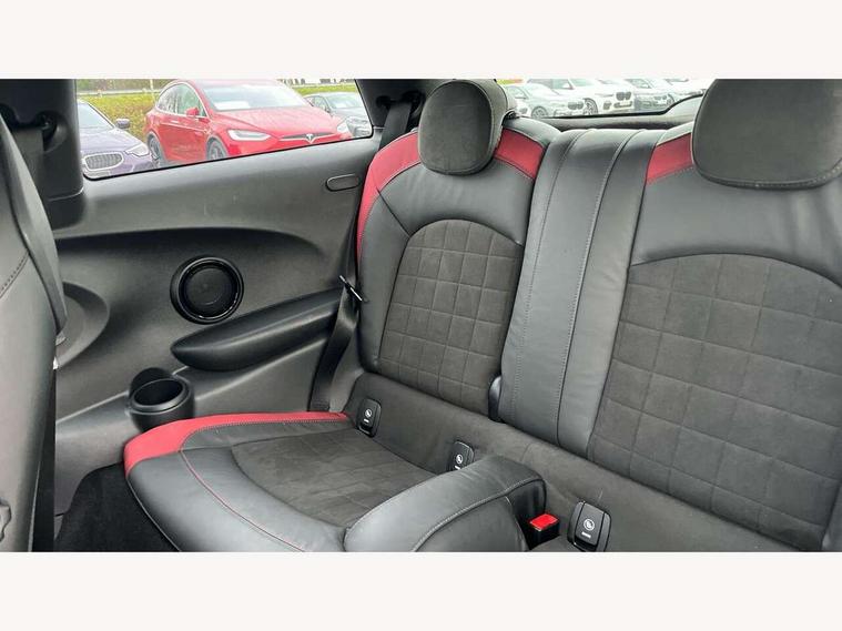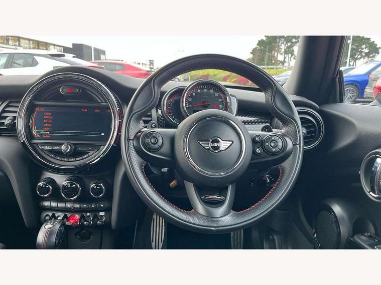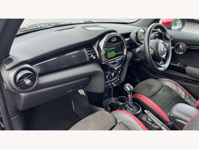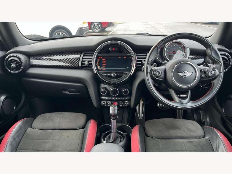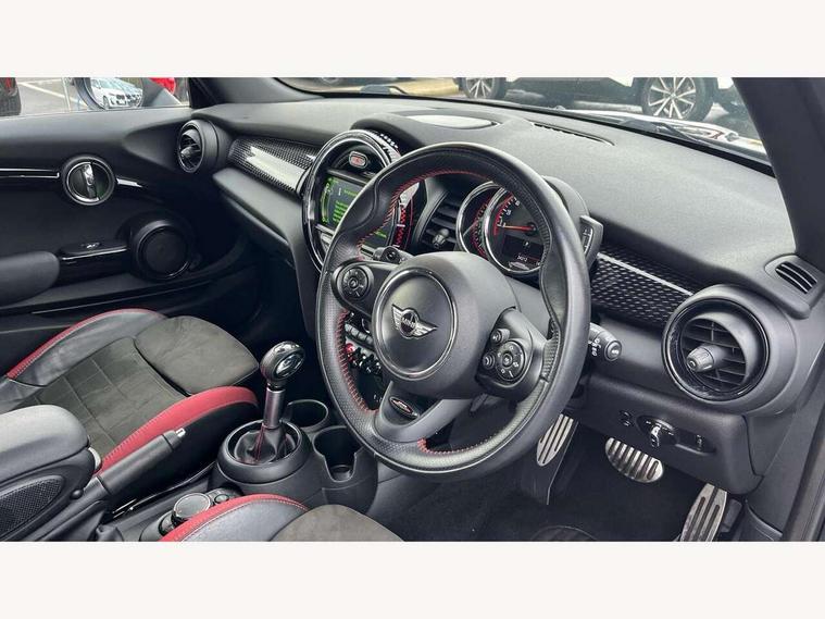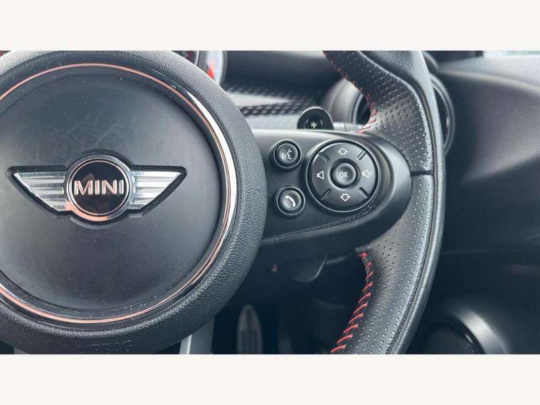 Acoustic seat-belt warning, Brake fluid level warning light, Brake pad wear indicator warning light, DTC - Dynamic traction control, Exterior temperature gauge, Intelligent emergency call, MINI Driving Modes - centre toggle switch to control driving setting (sport, mid and green), MINI TeleServices, Oil level indicator, On board computer, Push button starter, Service interval indicator, Servotronic PAS, Electronic differential lock, Performance Control, Auxiliary input socket, DAB digital radio module, 2 speed wipers+intermittent wipe, Anti dazzle mirror, Anti trapping/one touch open close front windows, Body colour scoop integrated into engine- compartment lid, Body coloured bumpers, Chili red grille bar, Chrome bezels around rear lights and headlights, Chrome door handles, Chrome plated fuel cap, Chrome plated trim on bottom edge of window, Chrome strip on lower grille, Electric front windows, Electrically adjustable door mirrors, Extended wheel arches, Follow me home headlights, Green tinted heat insulating glass, Heated door mirrors/heated windscreen washers, Heated rear window with auto timer, High gloss black tailgate, Honeycomb radiator grille, John Cooper Works roof spoiler, Metal look door sill finishers, Rear wiper, Side scuttles, Twin chromed exhaust pipes, White indicator lights, 2 rear head restraints, 4 boot load lashing points, 6 way manually adjustable passenger seat, 6-way manually adjustable driver's seat, Active carbon filter, Air recirculation system, Anthracite headlining, Auxiliary socket in centre console storage compartment, Centre console storage, Driver's seat height adjuster, Driver/passenger sunvisors, Easy entry seats, Front and rear cupholders, Front head restraints, Front interior light, Front passenger grab handle, Front seat backrest storage nets, Front sports seats, Gear/selector and handbrake in artificial leather, Internal chrome door handles, Isofix child seat preparation, Luggage compartment lighting, Multifunction steering wheel, Passenger seat height adjuster, Reach + rake adjustable steering column, Rear grab handles, Rear storage trays, Split folding rear seats, Storage compartments in doors, Toolkit in luggage compartment, Vanity mirrors, 3 point seatbelts, ABS/EBD, ASC+T, Brake calipers in red, Cornering brake control (CBC), Crash Sensor - activates hazard/interior lighting + unlocks doors, Driver and passenger airbags, Driver/front passenger side airbags, DSC - Dynamic Stability Control, Fuel cut off safety device, Head airbags, Hill start assist, Manual passenger airbag deactivation function, Seatbelt pretensioners, Tyre pressure warning, Ventilated front disc brakes, Drive away door locking, Locking wheel bolts, Remote central locking/doors+fuel cap+tailgate, Second remote key, Thatcham category 1 alarm + immobiliser,