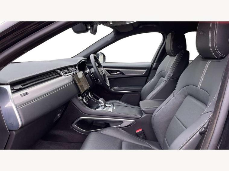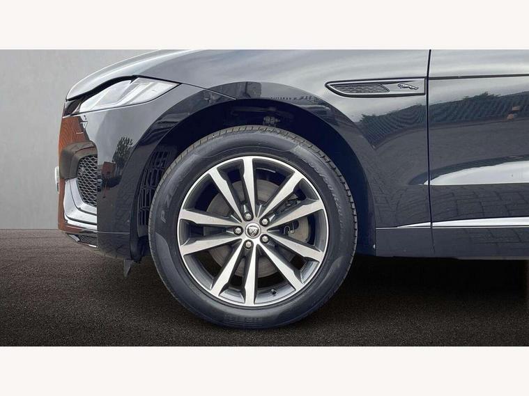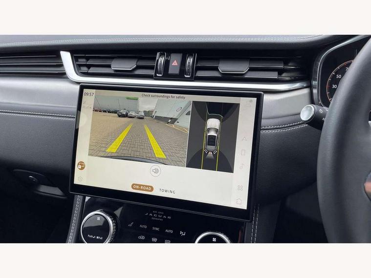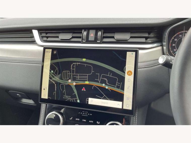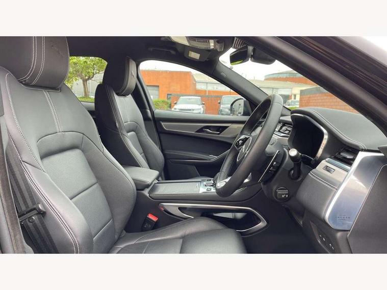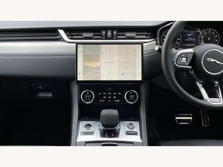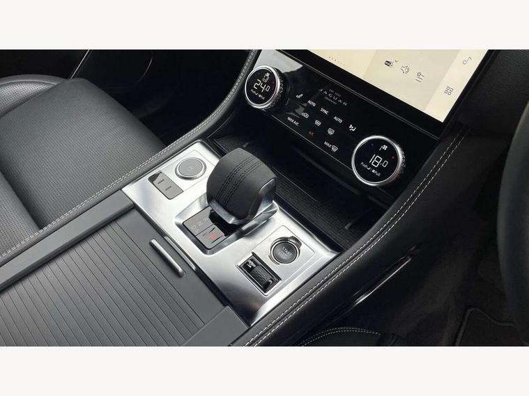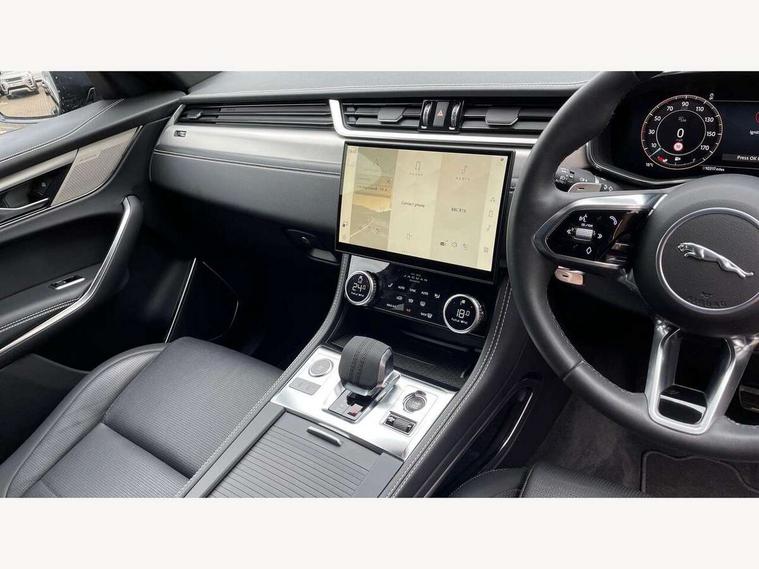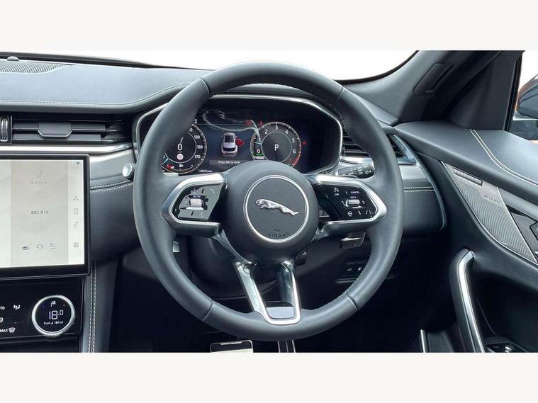 11.4" touchscreen, Android Auto, Apple car play, Blind spot assist, Bluetooth connectivity, Clear exit monitor, Driver alert system, Driver condition monitor, eCall emergency call system, Eco driving style assistant, Electric power assisted steering, InControl remote, Interactive driver display digital with 12" TFT display, Jaguar Toggle shift selector, Lane departure warning system, Lane keep assist, Outside temperature gauge, Personalisation profile management, Pivi pro connected navigation system with app interface and media storage, Pro services and wifi hotspot, Push button starter, Rear traffic monitor, Service interval indicator, Speed proportional steering, Start up sequence with movement in dials and lighting, Traffic sign recognition with adaptive speed limiter, Trip computer, Voice control system, 7 kW onboard charger, 8 speed automatic transmission, AC/DC charging, Adaptive dynamics, All terrain progress control, All Wheel Drive (AWD), Configurable dynamics, Home charging cable, Open differential with torque vectoring by braking, Public charging cable, AM/FM radio, Bluetooth streaming, DAB Radio (Digital Audio Broadcasting), Dynamic volume control, InControl apps, InControl protect, iPod integration, 3 flash lane change indicators, Animated directional indicators, Approach Illumination, Auto dimming rear view mirror, Automatic headlights, Electric heated/power fold memory door mirrors with approach lights and auto dimming driver side, Electric windows with one touch open/close and anti trap, F-Pace and R Dynamic badge, Green tinted glass, Heated front windscreen + heated washer jets, Heated rear window with timer, Jaguar script and leaper, LED High level third brake light, LED tail lights, Metal load space scuff plates, Non acoustic front windscreen, P400e AWD badge, Privacy glass, R Dynamic badge on side door, Rain sensor windscreen wipers, Rear fog lights, Rear metal tread plates, Rear side wing doors, Rear wiper, Trailer stability assist, Variable front intermittent wipers, 12V power point front, 3 rear headrests, 3 seat bench in 2nd row, Air distribution speed, Bright metal foot pedals, Centre armrest console, Centre console with side storage, Configurable cabin lighting, Deletion loadspace storage rails, Door sill tread plates, Fold flat front seats, Front centre armrest with storage compartment, Front door storage space, Glovebox finisher with jaguar script, Heated steering wheel, Hooks in loadspace, Illuminated glovebox, Interior front door handles with separate locking switches, ISOFIX on outer rear seats, Jaguar sense, Leather steering wheel, Luggage tie downs in loadspace, Mist sensing, Multifunction steering wheel, Overhead lighting console, Overhead stowage for sunglasses, Passive front head restraints, Premium carpet mats, Rear air vents, Rear armrest with twin cupholders, Rear centre headrest, Rear door storage space, Reversible boot floor, Satin chrome gearshift paddles, Shopping bag hook, Single front passenger seat, Sunvisors with illuminated vanity mirrors, Twin front cupholders with cover, Online Pack with data plan - F-Pace, 380mm front brakes and 325mm rear brakes, 3x3 point rear seatbelts, ABS, All surface progress control (ASPC), Brake pad warning light, DSC - Dynamic Stability Control, Electric parking brake (EPB), Emergency brake assist, Front airbags with passenger seat occupant detector, Front and rear seatbelt reminder, Front side airbags, Full length side window curtain airbag, Hill launch assist, Power operated child locks, Traction control, Tyre pressure monitoring system, Immobiliser, Keyless entry, Keyless Start, Locking wheel nuts, Perimeter alarm, Remote central locking, Valet mode,