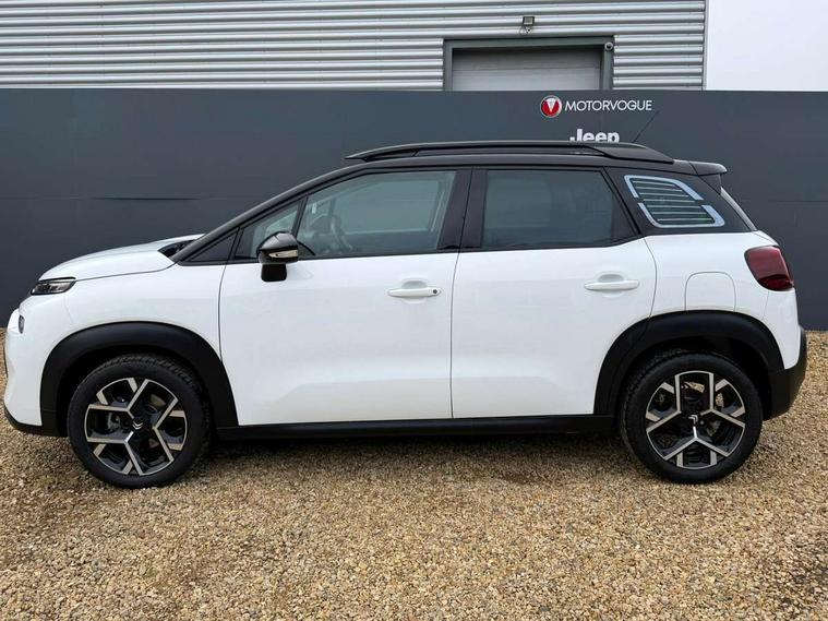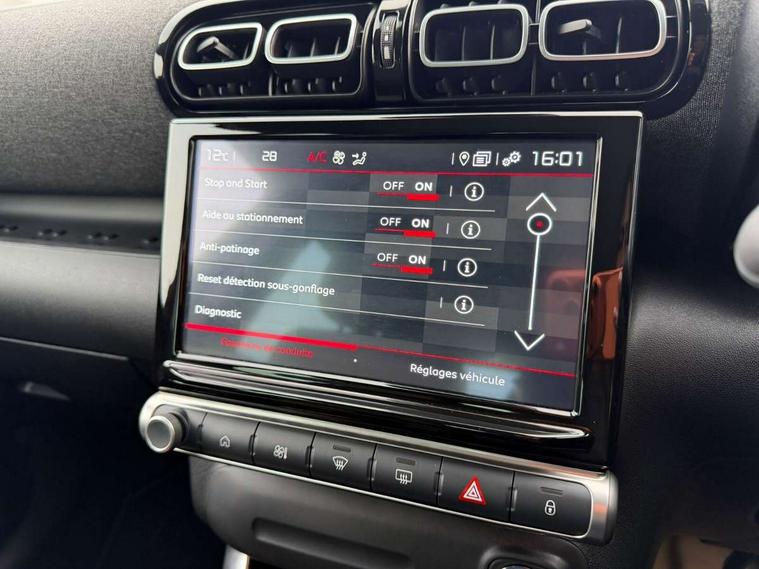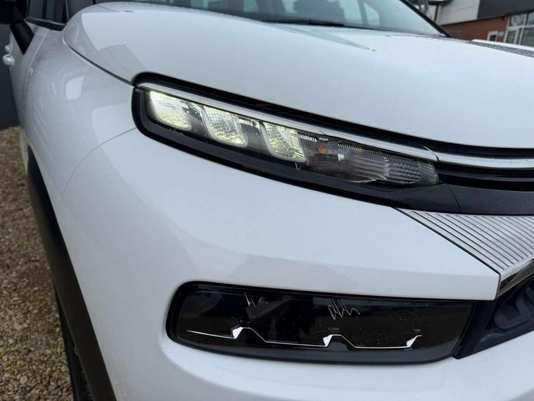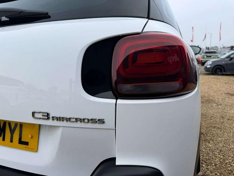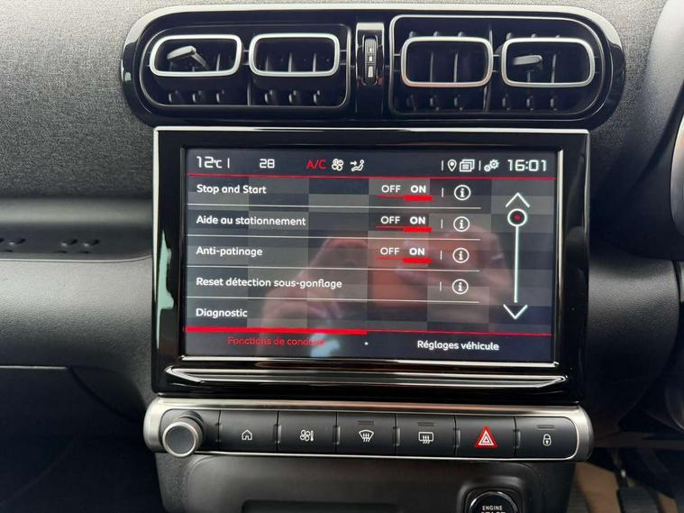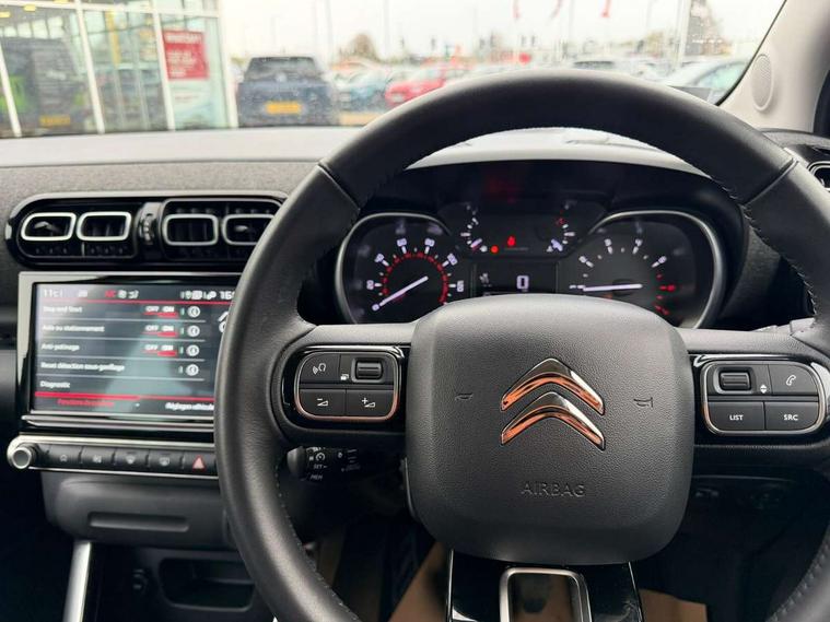 3.5" head up display, 9" Touchscreen display, Citroen connect box emergency and assistance system, Citroen Connect Nav with 3D navigation, Coffee Break Alert, Cruise control with speed limiter, Driver instrument cluster including trip computer and rev counter with white text LCD display and white needles and chrome decor, eCall emergency call system, Engine start button, Lane departure warning system, Mirror screen with Apple CarPlay and Android auto, Outside temperature sensor, Rear parking sensors, Tailgate, Top rear vision reversing camera, Traffic signs and speed limit recognition and recommendation, Variable assistance power steering, Voice recognition for radio, navigation and telephone features, Bluetooth hands free and media streaming with USB socket, Citroen connected DAB radio with 6 speakers, Steering wheel mounted controls for stereo and telephone, 3D effect LED rear lights, Automatic Eco LED headlights, Automatic lights and windscreen wipers, Black roof bars, Body colour painted door handles, Chrome chevrons front grille, Electric front windows + one touch + anti-pinch, Electric rear windows with one touch/anti-pinch, Electrically adjustable door mirrors, Electrically folding door mirrors, Electrochrome rear view mirror, Fog lights integrated into front bumper, Front and rear body coloured bumpers, Heated door mirrors, Integrated roof spoiler, LED daytime running lights, LED third brake light, Rear side wing doors, Rear wiper, Roof aerial, Tinted rear windows and rear quarterpanel glass, Variable front intermittent wipers, 12V socket in front, 12V socket in rear of vehicle, 60/40 split folding rear seats with sliding rear bench, centre armrest and ski flap, Automatic air conditioning, Boot light, Brasilia leather effect and flecked cloth upholstery with metropolitan graphite ambience, advanced comfort seats and wrapped dashboard, Central adjustable armrest on drivers seat, Centre console with closed storage and chrome insert, Driver and front passenger cup holders, Driver and passenger sunvisor with courtesy mirror, Flex load/Pull out boot floor, Front and rear courtesy reading lights, Front and rear door storage, Front head restraints, Front passengers seat flat folding, Glovebox with closable lid, Height adjustable driver's seat, Height and reach adjustable steering wheel, Leather steering wheel with satin chrome inserts and radio controls, Manual handbrake with chrome insert, Passenger compartment headlight adjustment, Rear isofix mounting points (outside seats) with top tether, Row 2 - Three seats with individually adjustable head rests, Satin chrome interior door handles, Single front passenger seat, Gloss black colour pack - C3 Aircross Max, 3 point, height adjustable, pre tensioned front seatbelts, ABS with Electronic brakeforce distribution and Emergency braking assistance, Active safety brake including Forward collision warning, Automatic illumination of hazard warning lights, Curtain airbags, Driver airbag, Drivers/passengers and rear seats unfastened seat belt warning, ESC (Electronic Stability Control), Front lateral airbags, Front passenger airbag, Front passenger airbag deactivation switch, Hill start assist function, Mono-tone horn, Rear door child safety locks, Three 3 point rear seatbelts, Tyre pressure monitor, Automatic door and boot locking when moving off with automatic unlocking in case of impact, Automatic locking of the vehicle (after 30 seconds if door or boot unopened), Immobiliser, Keyless entry and keyless start, Perimetric and volumetric anti theft alarm, Remote central locking + deadlocks, Vehicle locater function (headlights illuminate when button on key pressed), Gloss black centre console, Satin chrome air vent decors,