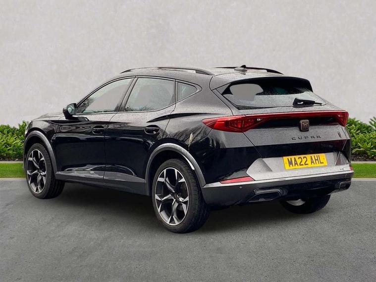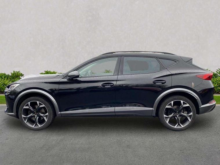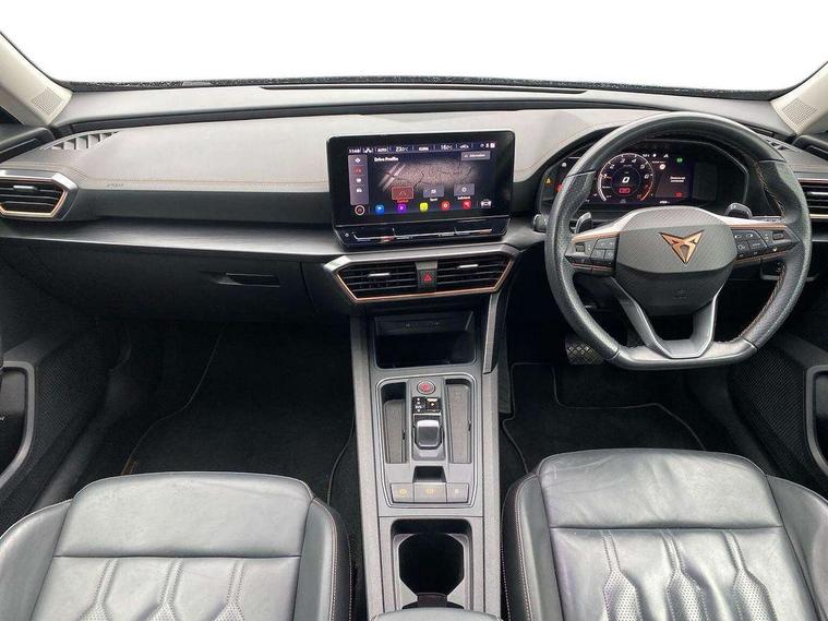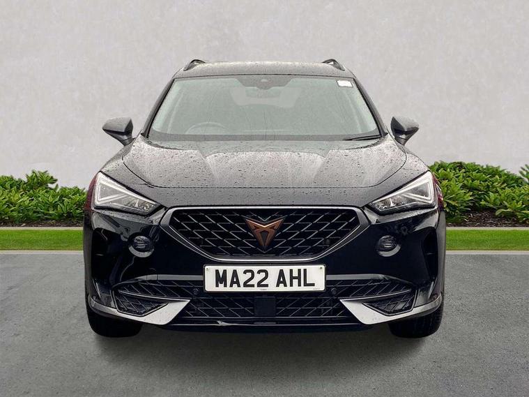 Digital cockpit and configurable dashboard, Driver alert system, Driving profile selection, E-call, Forward collision warning with automatic braking, Lane assist, Park assist (inc front/rear parking sensors), PAS, Predictive adaptive cruise control with speed limiter, Rear view camera, RPM, trip computer, outside temp gauge, instrument light brightness, low fuel warning light, lights on reminder, gearshift indicator, Service interval indicator, Start/stop system with regenerative braking, Wireless apple carplay, Wireless phone charger, Electronic locking differential and dynamic traction support, Standard suspension, 2 front and 2 rear USB type C sockets, Auxiliary input socket, DAB radio, Auto dimming rear view mirror, Body colour door handles, Body coloured bumpers, Dark grey wing mirror, Daytime running light with automatic headlight control and coming home feature, Dynamic headlight range control, Electric front/rear windows, Electrically adjustable heated and folding door mirrors with memory function, Front fog lamps with cornering function, Gloss black roof rails and window surrounds, LED Headlights, LED Taillights with dynamic indicator, Rain sensing wipers, Rear diffuser with black simulated exhaust pipes, Rear side wing doors, Rear wash/wipe, Third brake light, Tinted rear windows, Welcome lights, 12v power supply in centre console, 12V socket, 12v socket in loadspace, 2 front and 2 rear reading lights, 230V socket, 3 seat bench in 2nd row, 60/40 split rear bench seat with armrest and mechanical seat release, Dust/pollen filter, Front and rear head restraints, Front centre armrest, Height/reach adjust steering wheel, Illuminated interior front door sills, Illuminated sunvisor with mirror, Isofix, Leather multi function heated steering wheel with gear shift paddles, Luggage tie-down hooks, Single front passenger seat, Three zone climate control with control panel in rear, Variable luggage/load compartment floor, Wraparound lighting, Genuine Nappa leather Pack - Cupra, Navigation system pack with 10" navigation system - Formentor, 3 point seatbelts on all rear seats, ABS, Brake control system - ESC and brake booster, Child proof door locks, Driver and front passenger airbags with front passenger airbag de-activation, Electronic parking brake, Front and rear disc brakes, Front side curtain airbags, Hill hold control, Seat belt reminder for front and rear seats, Tyre pressure monitoring system, Anti theft alarm system, Keyless entry and start system (KESSY), Locking wheel bolts, Copper and aluminium interior detailing, 19" 'Exclusive' machined sport matte black and silver alloy wheels,