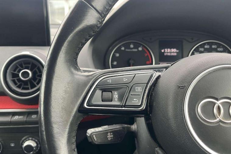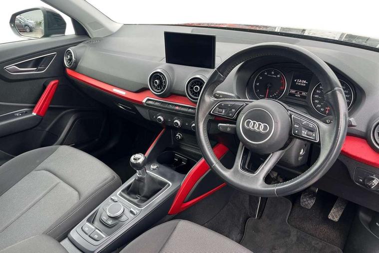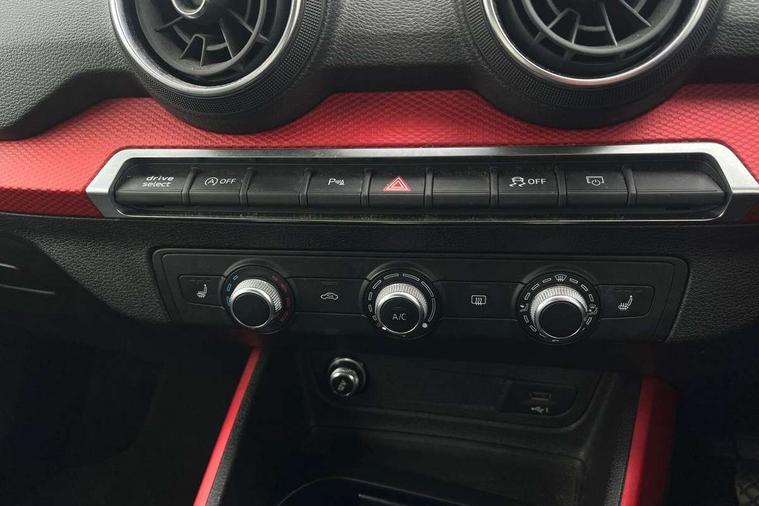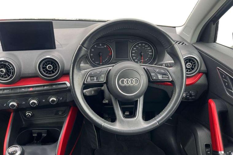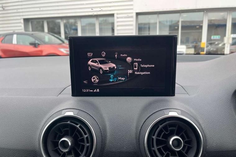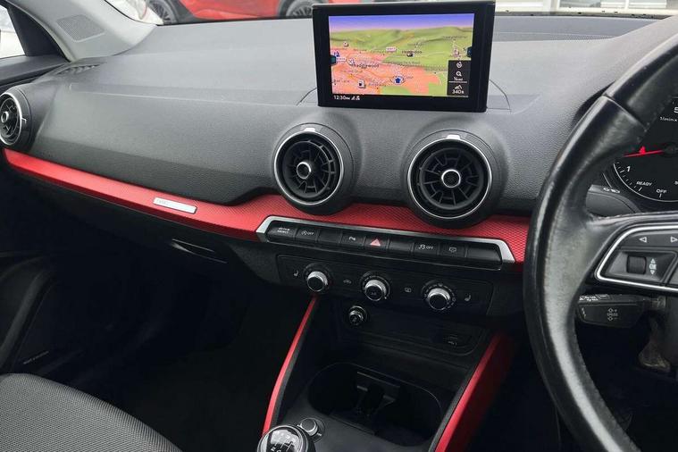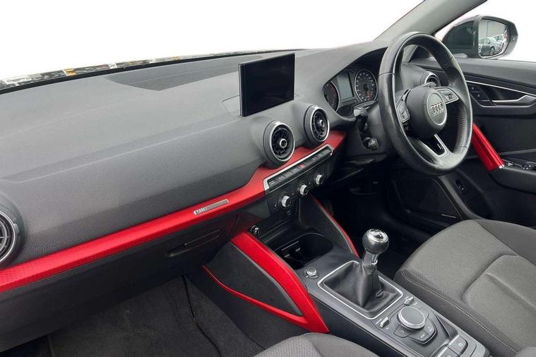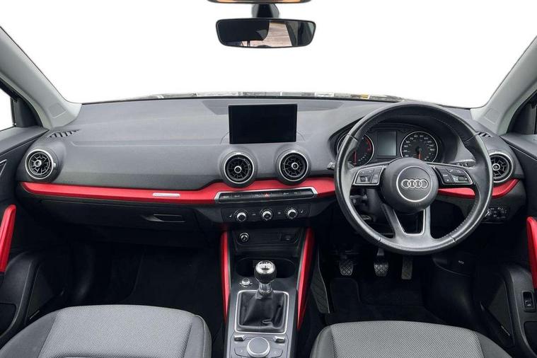 Audi drive select, Audi smartphone interface, Automatic start/stop system with recuperation, Bluetooth interface includes bluetooth audio streaming, Cruise control, MMI - Multi Media Interface control system, MMI SD card integrated nav with 3D map display, dynamic route guidance with TMC, MMI search, natural voice recognition and myAudi special destinations, Power operated tailgate, Progressive steering, Service interval indicator, Dynamic suspension, 2 x SDXC card reader, Audi music interface - apple iPod, apple iPhone, USB storage media, compatible MP3 players, 2 x USB charging points and 1 x Aux-in, CD Drive, DAB digital radio and AM/FM radio, MMI radio plus with 7" colour MMI screen and MMI controller, Air inlet in manhattan grey metallic, Black window trims, Body colour door mirrors, Chrome exhaust tailpipe, Electrically adjustable and heated door mirrors with integrated LED side indicators, Front and rear electric windows, Front underbody guard and rear diffuser trim in selenite silver, Front windscreen with grey tinted sunband, Halogen headlights including headlight range adjustment, High gloss black radiator grille, Interior mirror, LED indicator lights, Manual folding door mirrors, Rain and light sensors, Rear wiper, Side skirts in manhattan grey, Wheel arch trims in manhattan grey, 60/40 split folding rear seat bench, Door sill trims with aluminium inlay, Electronically operated child locks, Front centre armrest, Front headrests, Front sports seats, Front/rear floor mats, Height/reach adjust steering wheel, ISOFIX child seat mounting for front passenger with airbag deactivation and outer rear seat including top tether attachment point for outer rear seats, Manual seat adjustment including seat height adjustment for front seats, Storage compartments - Glovebox, cupholder compartment in centre console, storage compartment in rear centre console, front and rear door pockets, Three rear headrests, Titanium grey cloth headlining, Non smoking pack - Q2, 3x3 point rear seatbelts, 6 airbags - Front, curtain and front side airbags, Electromechanical parking brake, Electronic stabilisation control including ABS, ASR and EDL, Extended and proactive pedestrian protection, Hill hold assist, Multi collision brake assist, Pre-sense front with pedestrian recognition, Seatbelt monitoring, Tyre pressure warning light, Warning triangle and first aid kit, Anti theft alarm, Anti theft wheel bolts, Central locking system with remote control key, Aluminium interior element,