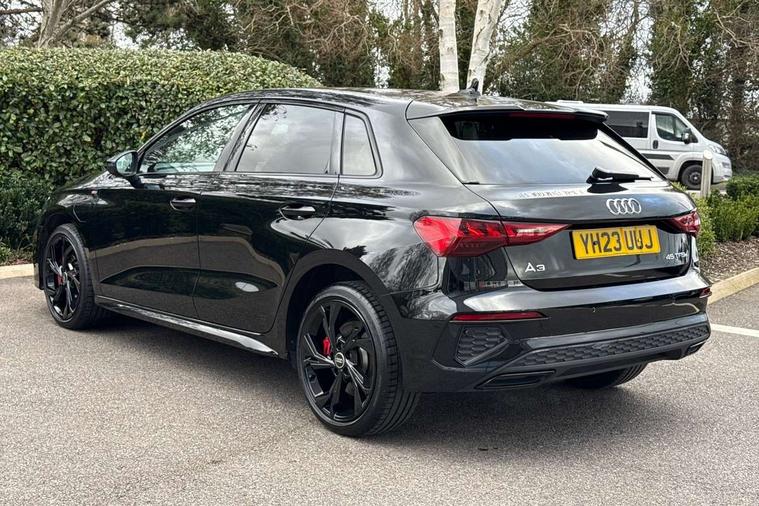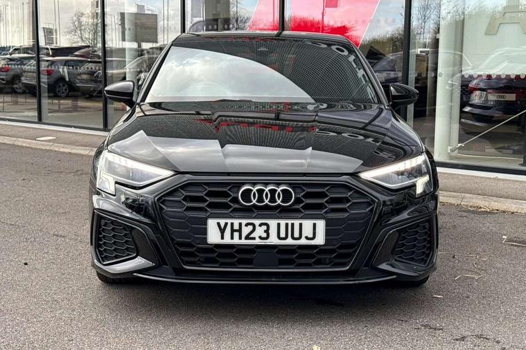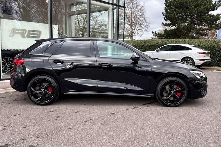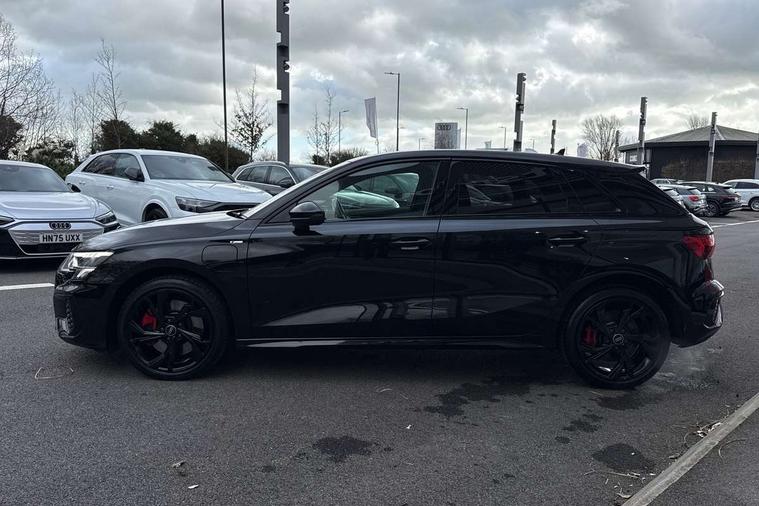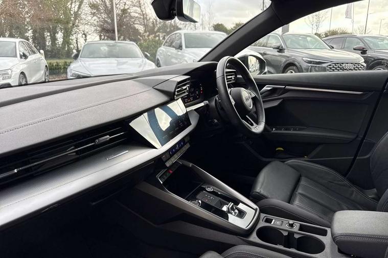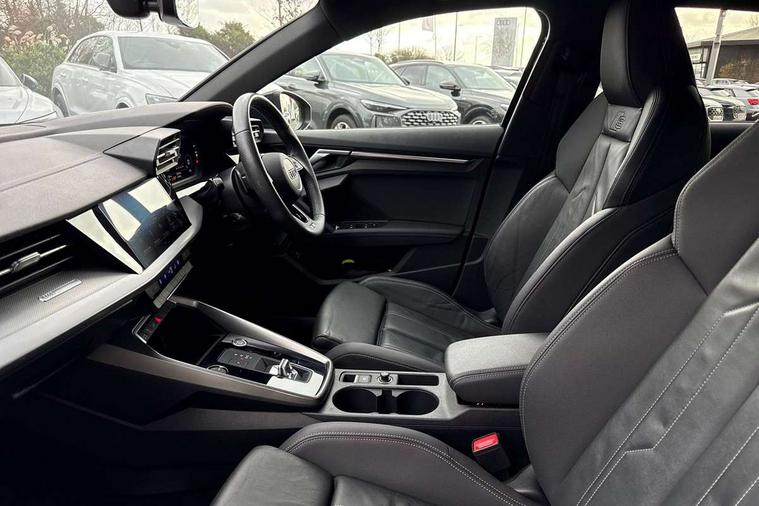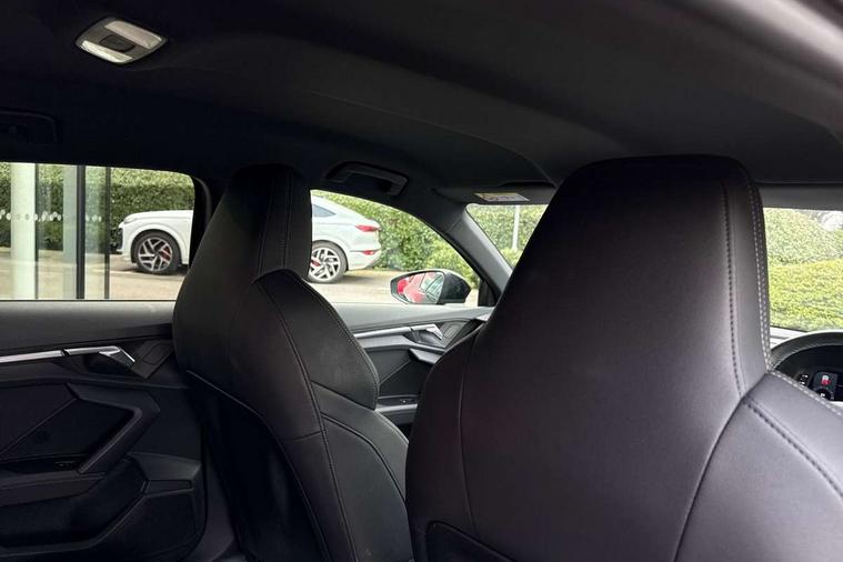 Audi drive select (Auto, Comfort, Dynamic, Efficiency and Individual), Audi smartphone interface, Audi Virtual Cockpit - 10.25" digital and colour instrument cluster, Automatic start/stop system with recuperation, Bluetooth interface, Collision avoidance assistant, e-Call (emergency call), Electromechanical power speed sensitive steering, Lane departure warning system, MMI Navigation Plus with high resolution 10.1" colour touch screen display, Service indicator, Trip computer, Voice control system with natural language interaction, 2.9 kW On-board charger, 3 pin 10 amp domestic charging cable, Standard suspension, Type 2 mode 3 32 amp charging cable, Type 2 socket for AC charging, 2xUSB-C connection with data and charging functions, 6 passive loudspeakers, DAB Digital radio, 3rd brake light, Acoustic glass windscreen, Aluminium window trim, Auto dimming frameless rear view mirror, Electrically adjustable/heated/folding/auto dimming door mirrors with integrated LED indications + kerb view function for passenger side, Front electric windows, Illuminated aluminium inserts front door sills with S logo, LED daytime running lights, LED headlights with LED rear lights and dynamic rear indicators, Light and rain sensors, Privacy glass - dark tinted rear window, rear door and side windows, Rear electric windows, Rear side air outlets in grained matt black, Rear side wing doors, Rear wiper, S line bumpers, S roof spoiler, 12V socket and storage compartment in front centre console, 3 seat bench in 2nd row, 3 spoke leather multifunction steering wheel with paddle shift, 40/20/40 split folding rear seat bench with cupholder, Black cloth headlining, Dual zone electronic climate control, Front and rear centre armrest in leather, Front and rear headrests, Front/rear floor mats, Height and reach adjustable steering wheel, Illuminated vanity mirror, Interior lighting - glove compartment light and right hand side, Luggage compartment floor covering, Manual boot compartment lid, Manually adjustable front seats, Seat side bolsters, Single front passenger seat, Stainless steel pedals and front footrest in black, Twin leather upholstery with front sports seats S embossed logo, Aluminium interior elements pack - A3 Sportback, Black styling pack - A3 Sportback, LED interior lighting pack - A3 Sportback, S line styling pack - A3 Sportback, 3x3 point rear seat belts, Audi pre sense front, Driver and front passenger airbag with passenger airbag deactivation, Electronic Stabilisation Control (ESC) including ABS, ASR and EDL, First aid kit with warning triangle and 2 safety vests, Front side airbags with head airbags and interaction airbag, Pre-sense front with pedestrian and cyclist detection, Red brake calipers, Seatbelt monitoring, Tyre pressure loss indicator, Anti theft alarm, Anti-theft wheel bolts, Electronically operated child lock, Immobiliser, Remote control central locking, Accent surfaces in the dashboard and centre console in platinum grey silk effect paint finish, Dark spectrum aluminium inlays, Tool kit, Tyre repair kit,
