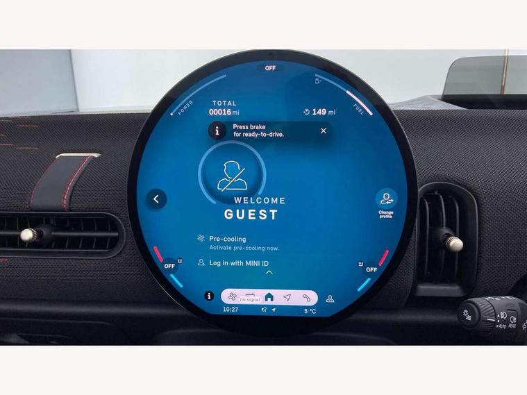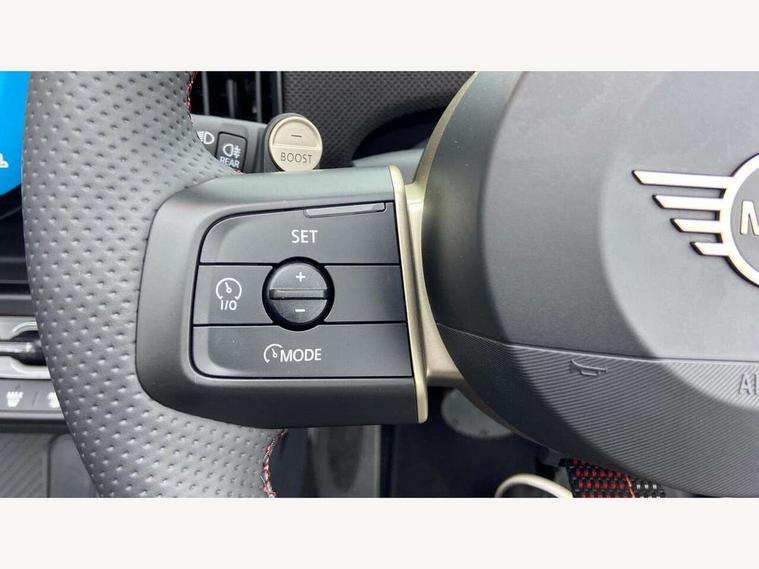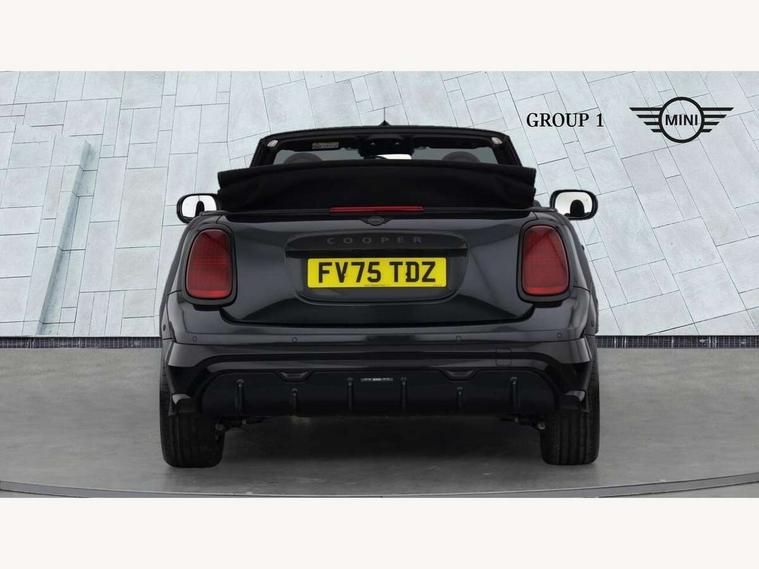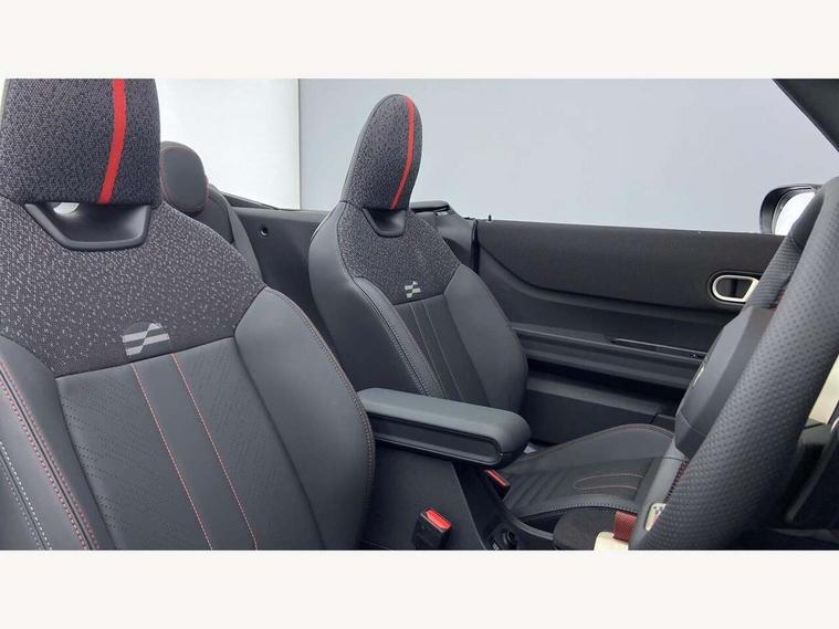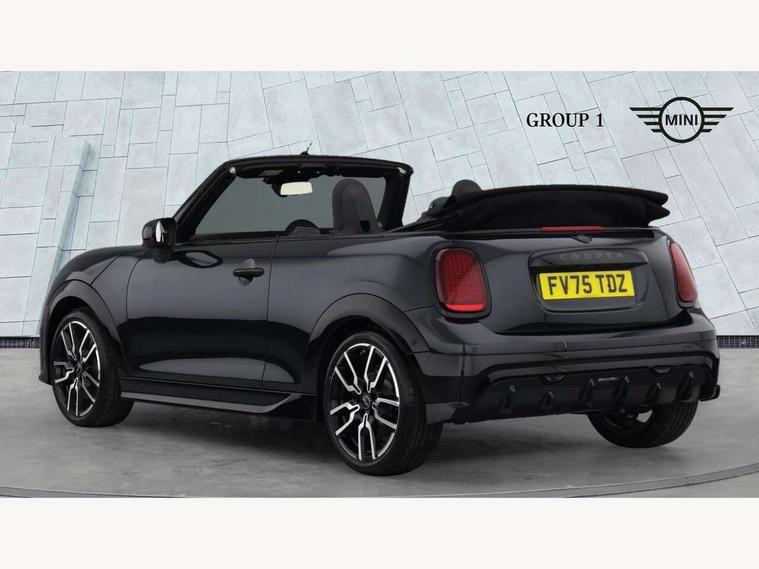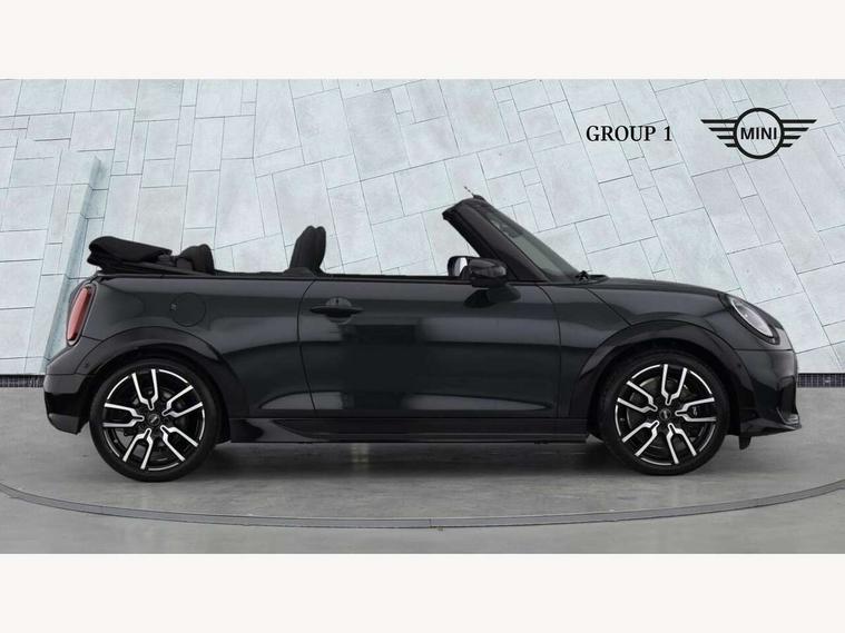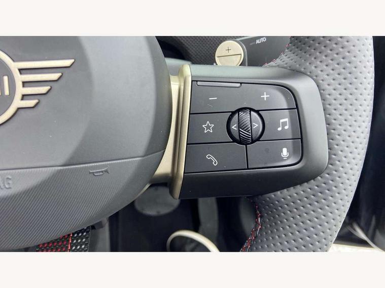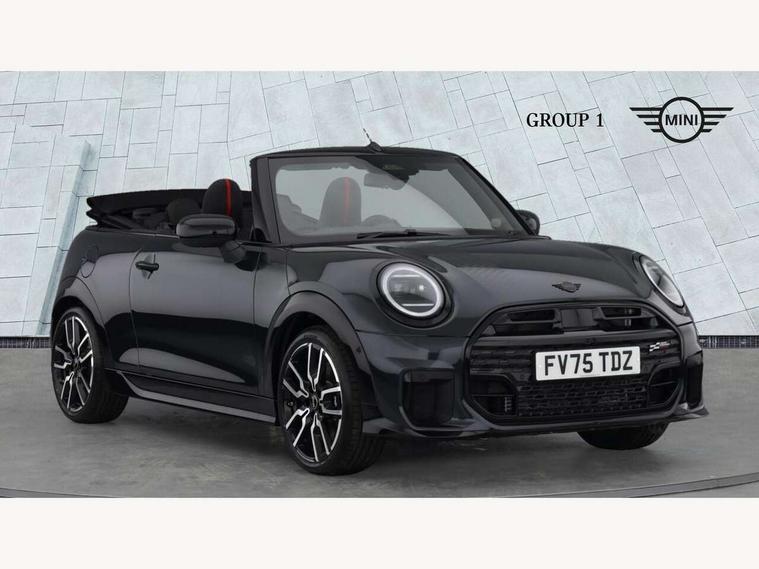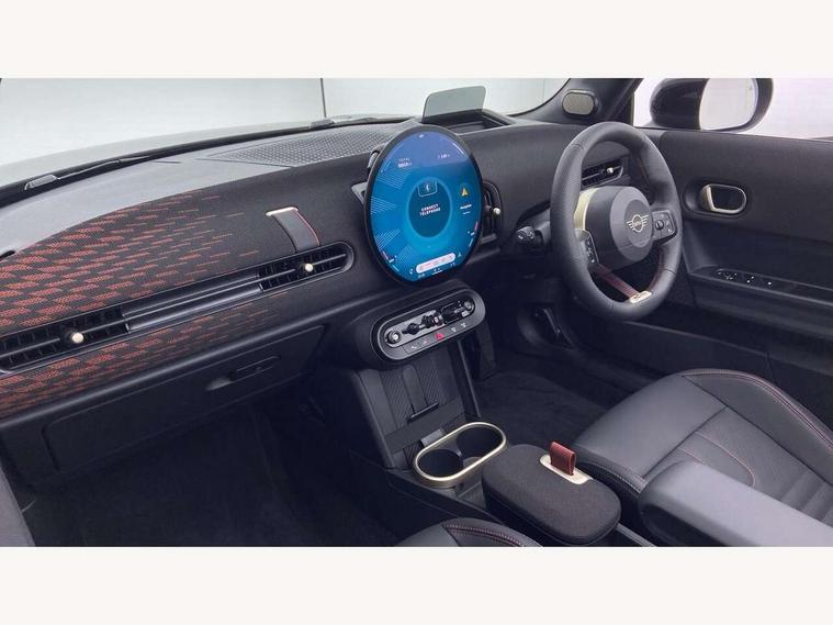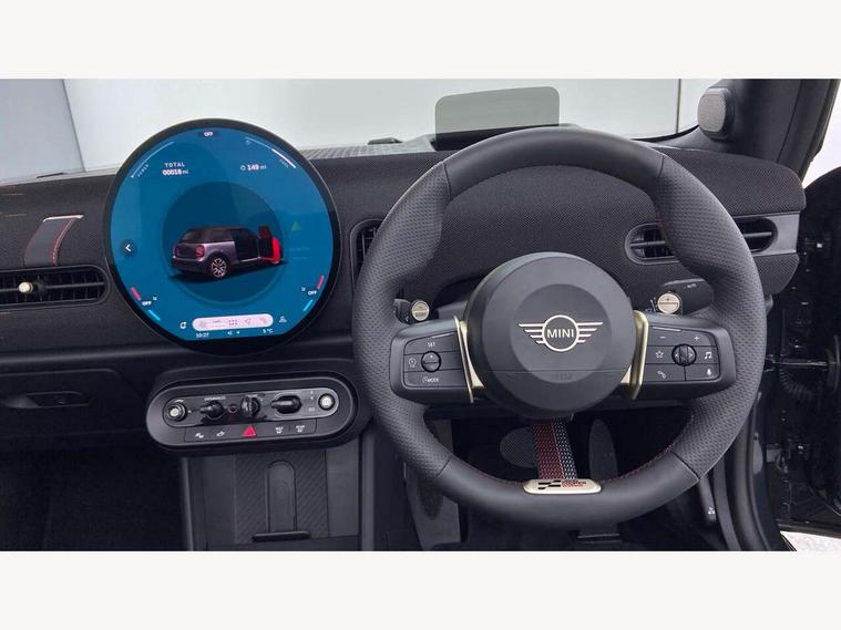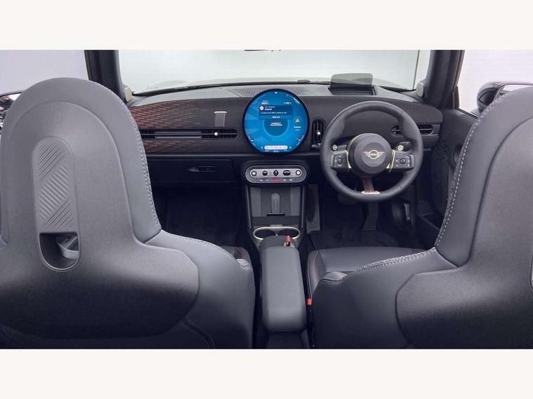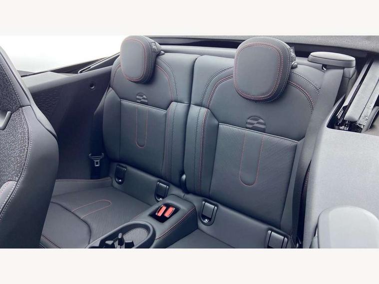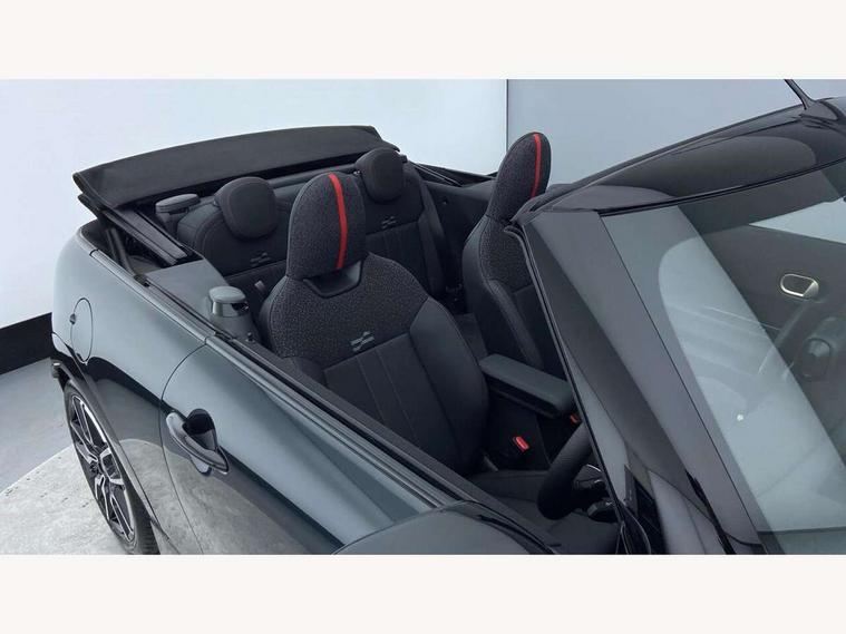Always open timer, Central toggle bar, Circular OLED Screen, Compatible mobile phone bluetooth with audio streaming, Cruise control, Digital instrument cluster, e-Call (emergency call), MINI Experience Modes, Mini navigation system, On board computer, PAS, Service interval indicator, 7 speed steptronic transmission with double clutch, Adaptive suspension, DAB Digital radio, Personal eSim, Auto headlights, Electric front windows, Front and rear apron, High gloss hexagonal patterned grille surround, LED 3rd brake light, LED daytime running lights, LED Headlights, LED indicator lights, LED rear lights, Logos in Vibrant Silver, Rain sensor window wipers, Rear boot, Rear fog lights, Rear roof spoiler with airblades, Wind deflector, 2 seat bench in second row, 2 zone automatic air conditioning, 60/40 rear seat bench, Ambient lighting, Black lower band in high gloss, Floor mats, Front and rear head restraints, Front compact armrest, Heated steering wheel, Height adjustable passenger seat, Lidded storage box in Black/Red knit, Light headliner, Luggage compartment lighting, Partially perforated vescin steering wheel with red accent, black/red decorative strap, Single front passenger seat, Steering wheel paddle shift, Sunvisors with vanity mirrors, Driving assistant pack - Cooper Convertible, Park assistant pack - Cooper Convertible, 3 point seatbelts on all four seats, 6 Airbags - front, side, head and seat belt tensioners, Anti-lock braking system (ABS), Brake caliper in Black with JCW badge, DSC - Dynamic Stability Control, Electronic parking brake, Front and rear disc brakes, Front ISOFIX (iSize), Front passenger airbag deactivation, JCW Sport Brakes, Traction control, Tyre pressure monitoring system, Alarm, Immobiliser, Physical spare key (not digital), Remote central locking, Black/Red decorative dash strap, Tyre repair kit,