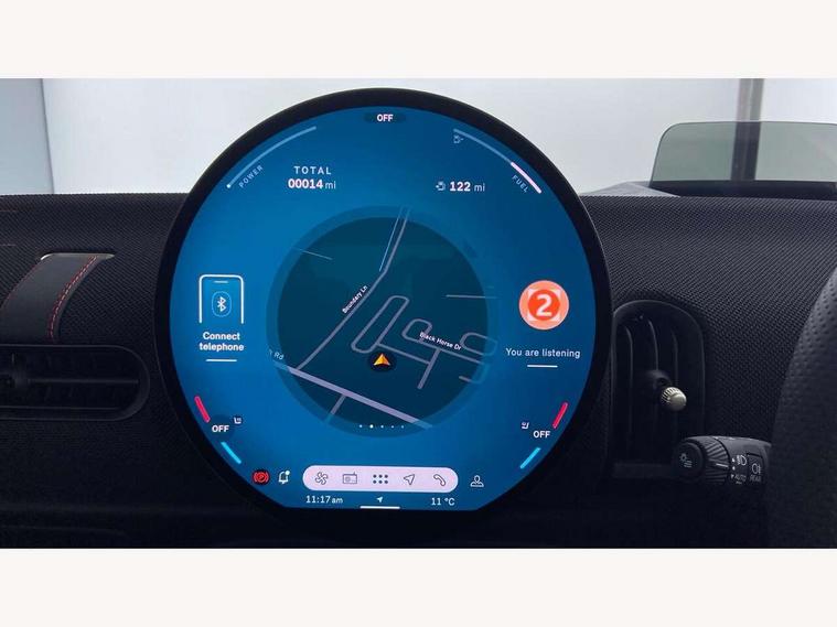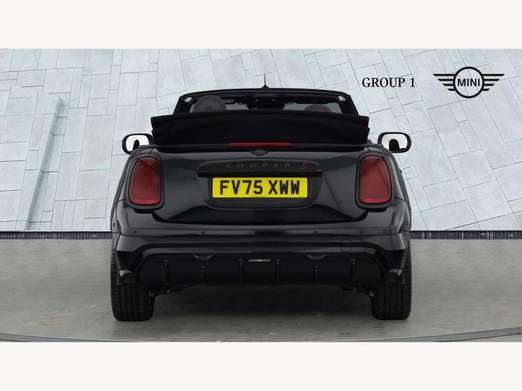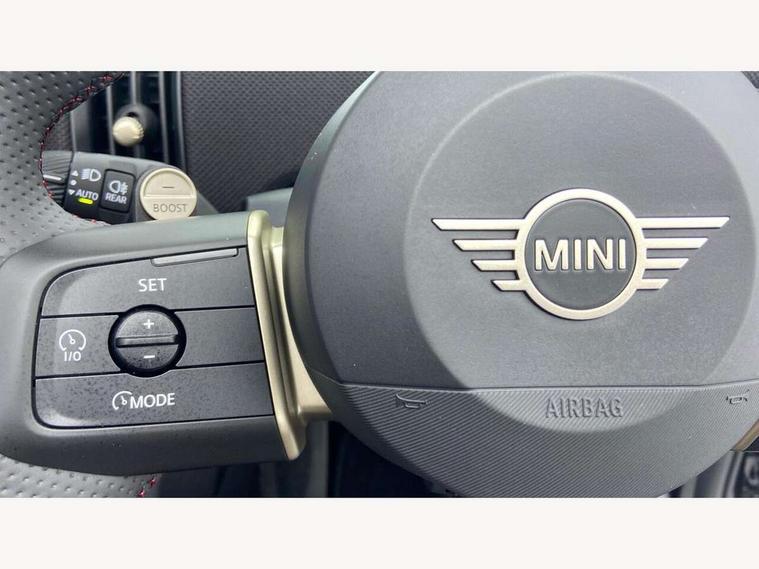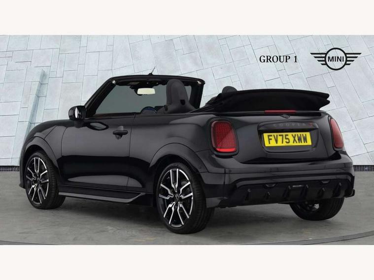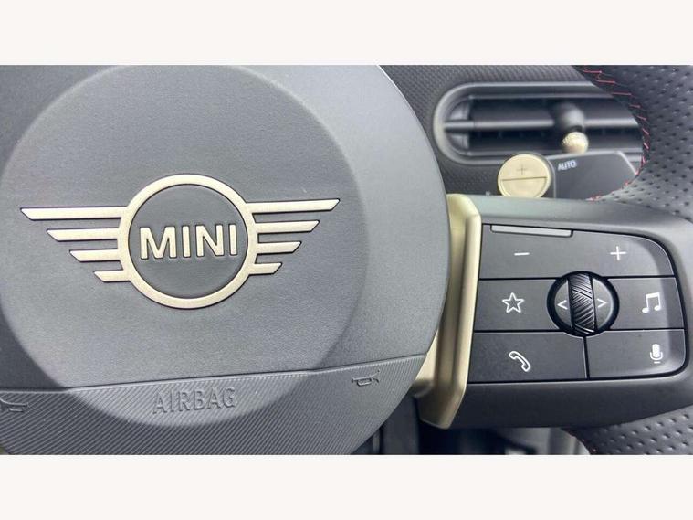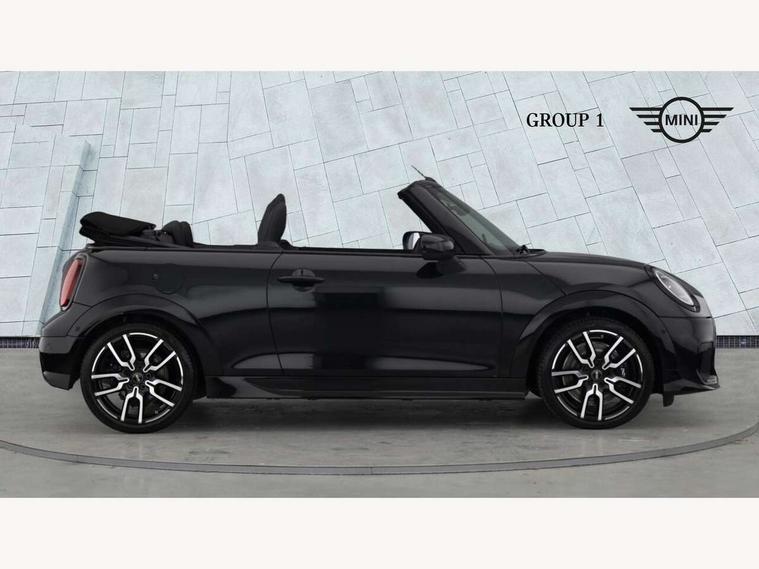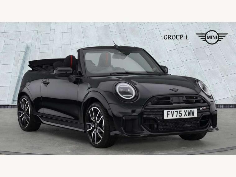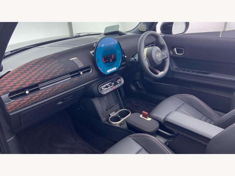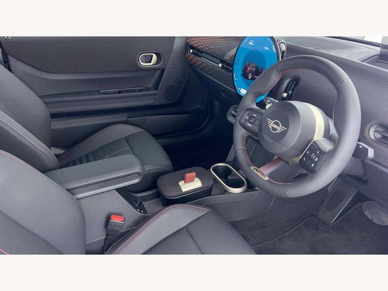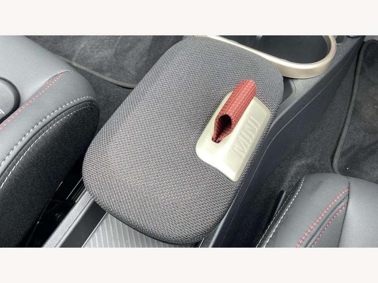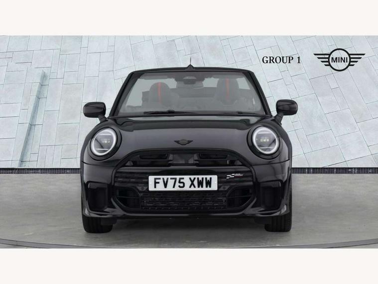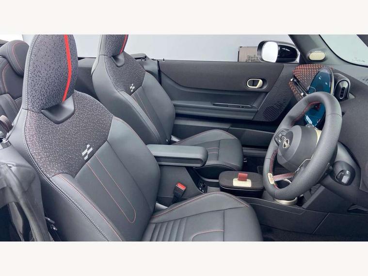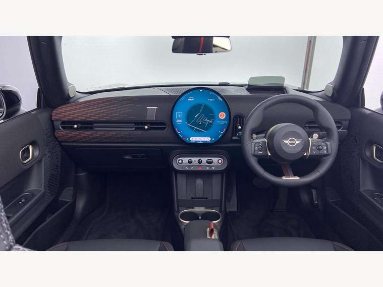 Always open timer, Central toggle bar, Circular OLED Screen, Compatible mobile phone bluetooth with audio streaming, Cruise control, Digital instrument cluster, e-Call (emergency call), MINI Experience Modes, Mini navigation system, On board computer, PAS, Service interval indicator, 7 speed steptronic transmission with double clutch, Adaptive suspension, DAB Digital radio, Personal eSim, Adaptable light signatures, Auto headlights, Electric front windows, Front and rear apron, High gloss hexagonal patterned grille surround, LED 3rd brake light, LED daytime running lights, LED indicator lights, LED rear lights, Logos in Vibrant Silver, Rain sensor window wipers, Rear boot, Rear fog lights, Rear roof spoiler with airblades, Wind deflector, 2 seat bench in second row, 2 zone automatic air conditioning, 60/40 rear seat bench, Ambient lighting, Black lower band in high gloss, Floor mats, Front and rear head restraints, Front compact armrest, Heated steering wheel, Height adjustable passenger seat, Lidded storage box in Black/Red knit, Light headliner, Luggage compartment lighting, Partially perforated vescin steering wheel with red accent, black/red decorative strap, Single front passenger seat, Steering wheel paddle shift, Sunvisors with vanity mirrors, Driving assistant pack - Cooper Convertible, Level 1 pack - Mini Convertible, Park assistant pack - Cooper Convertible, 3 point seatbelts on all four seats, 6 Airbags - front, side, head and seat belt tensioners, Anti-lock braking system (ABS), Brake caliper in Black with JCW badge, DSC - Dynamic Stability Control, Electronic parking brake, Front and rear disc brakes, Front ISOFIX (iSize), Front passenger airbag deactivation, JCW Sport Brakes, Traction control, Tyre pressure monitoring system, Alarm, Immobiliser, Physical spare key (not digital), Remote central locking, Black/Red decorative dash strap, Tyre repair kit,