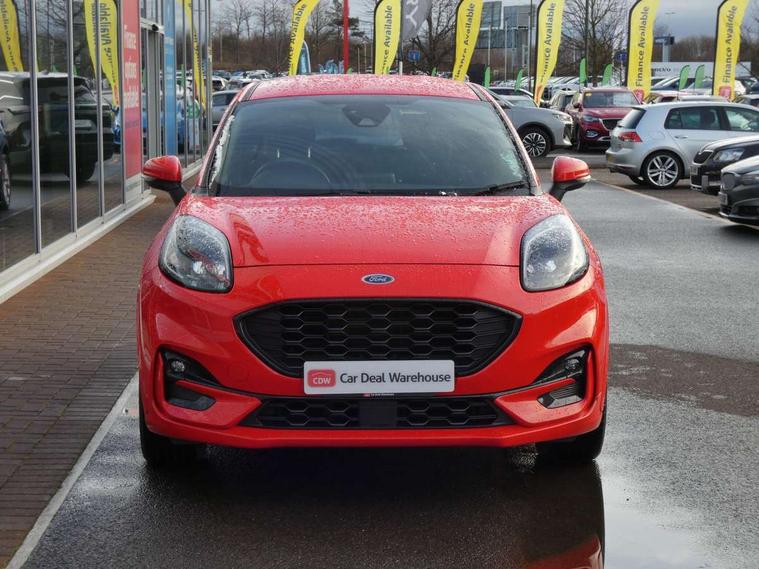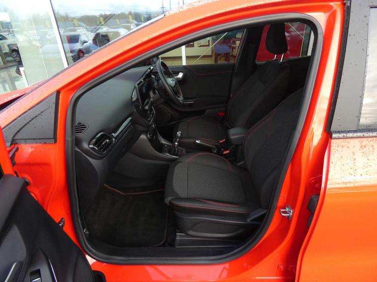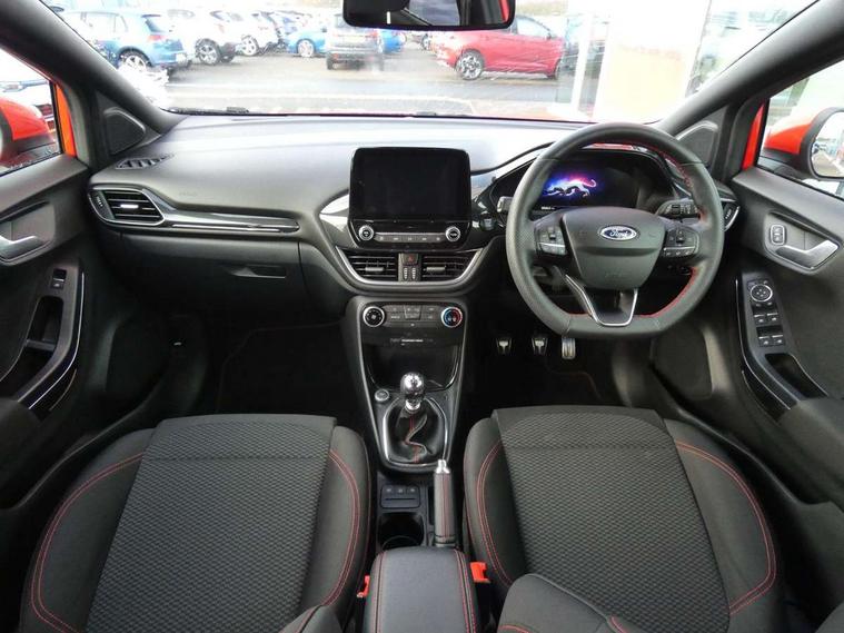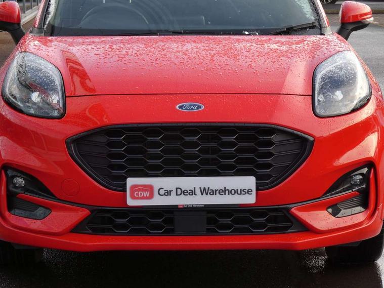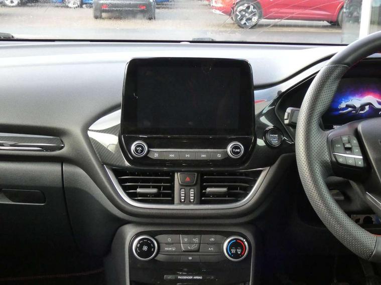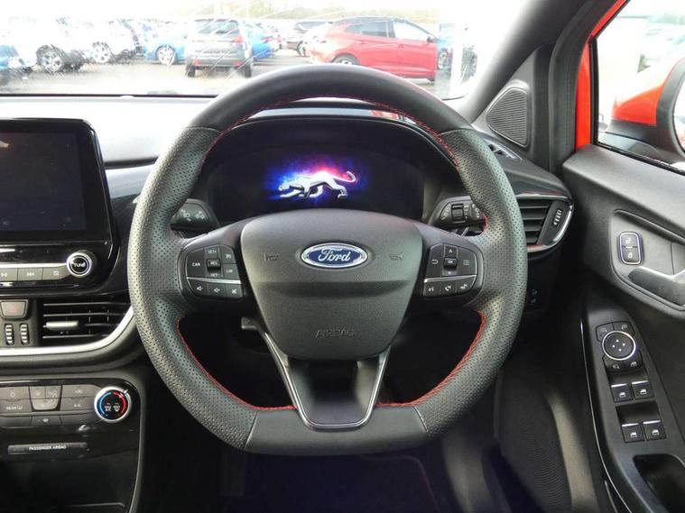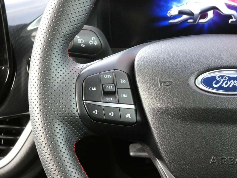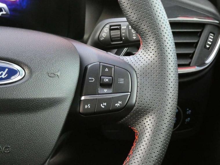 Ford easy fuel, Full digital 12.3" instrument cluster, Power assist steering, Power start button, Rear parking sensor, Selectable drive modes(Normal, sport, Eco, trail, slippery), Automatic rain sensing wipers, Body coloured door mirrors, Front fog lights with cornering lights and LED rear lamps, Power foldable heated door mirrors with puddle lamps, Projector headlamps with LED day time running lights, Quickclear heated windscreen, Rear wiper, ST-Line body kit with large rear spoiler wth sports suspension, Centre console with armrest and stowage, Cloth upholstery, Driver seat height/lumbar adjust, Ford megabox extended bootspace, Front and rear floor mats, Front and rear head restraints, Manual air conditioning, ST-Line flat bottomed sensico leather steering wheel with leather handbrake and aluminium gear knob, Driver assistance pack with Lane departure warning - Puma, Ford SYNC 3 navigation pack - Puma, 3 rear seatbelts, Electronic stability control (ESC) and hill start assist, Pedestrian/cyclist detection & post-collision braking, Tyre pressure monitoring system (TPMS), Thatcham alarm,