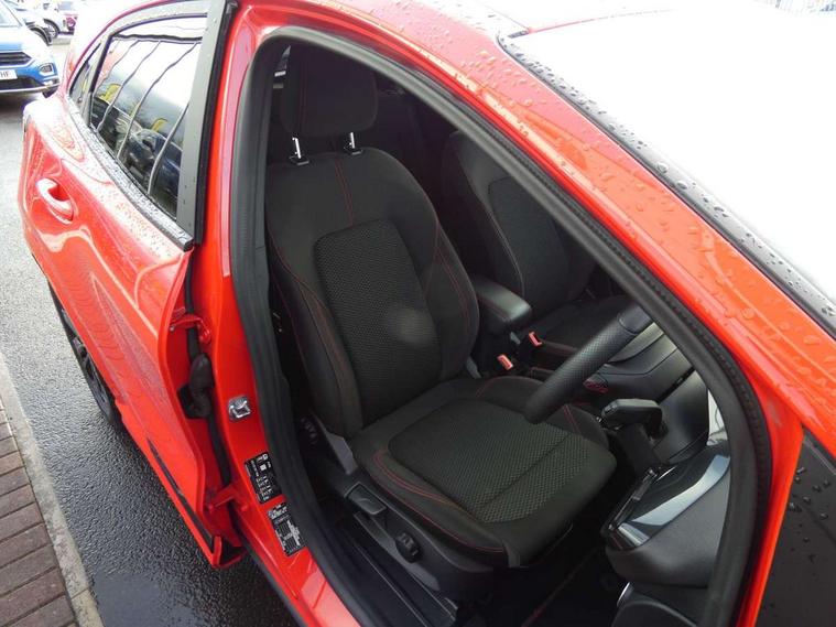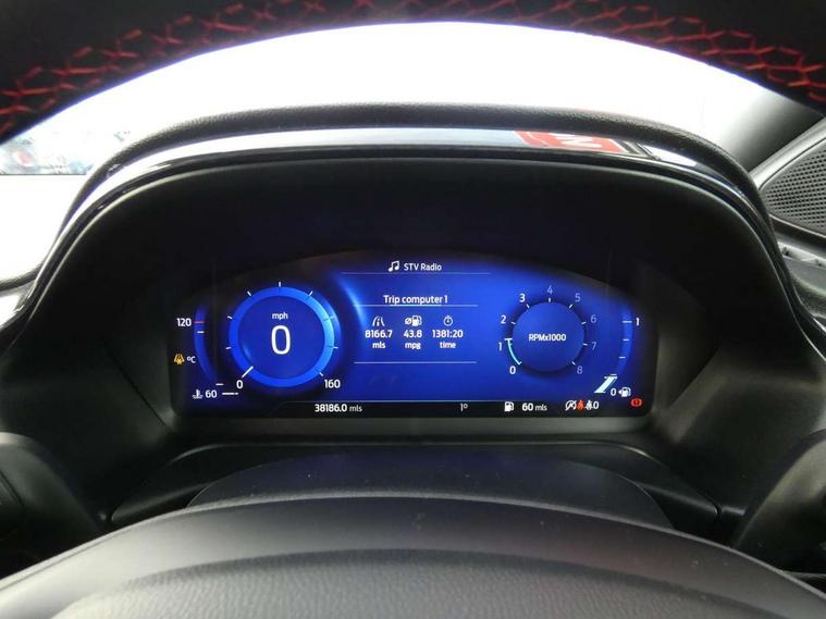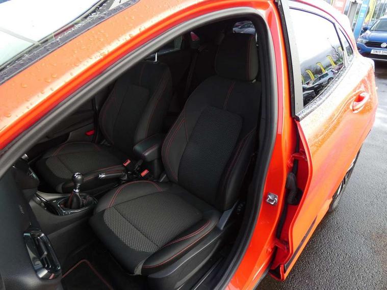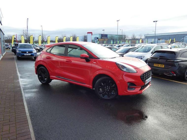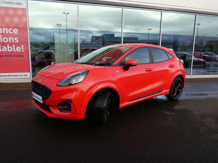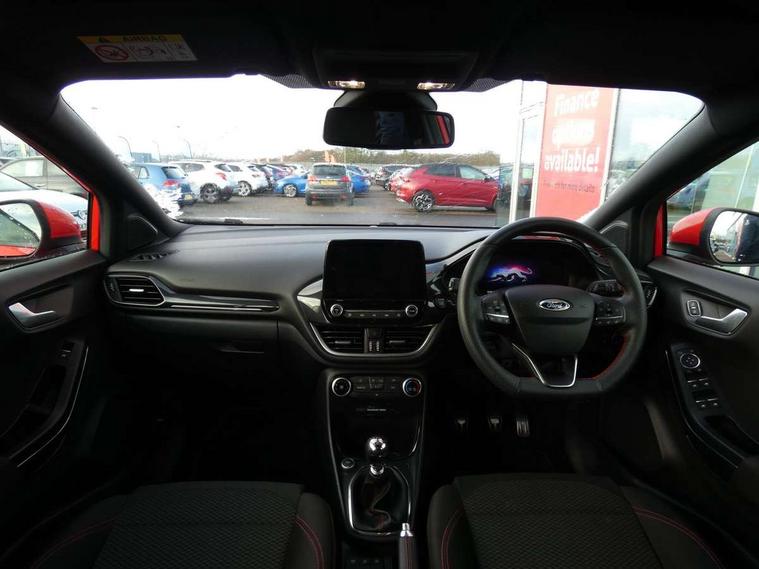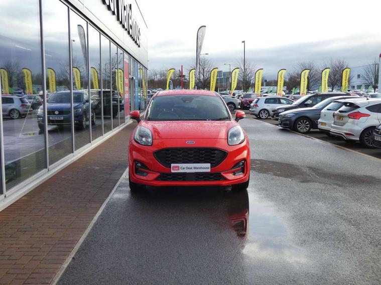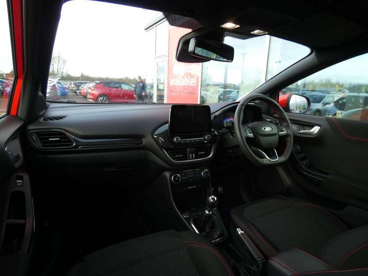 Ford easy fuel, Full digital 12.3" instrument cluster, Power assist steering, Power start button, Rear parking sensor, Selectable drive modes(Normal, sport, Eco, trail, slippery), Automatic rain sensing wipers, Body coloured door mirrors, Front fog lights with cornering lights and LED rear lamps, Power foldable heated door mirrors with puddle lamps, Projector headlamps with LED day time running lights, Quickclear heated windscreen, Rear wiper, ST-Line body kit with large rear spoiler wth sports suspension, Centre console with armrest and stowage, Cloth upholstery, Driver seat height/lumbar adjust, Ford megabox extended bootspace, Front and rear floor mats, Front and rear head restraints, Manual air conditioning, ST-Line flat bottomed sensico leather steering wheel with leather handbrake and aluminium gear knob, Driver assistance pack with Lane departure warning - Puma, Ford SYNC 3 navigation pack - Puma, 3 rear seatbelts, Electronic stability control (ESC) and hill start assist, Pedestrian/cyclist detection & post-collision braking, Tyre pressure monitoring system (TPMS), Thatcham alarm,
