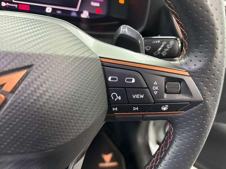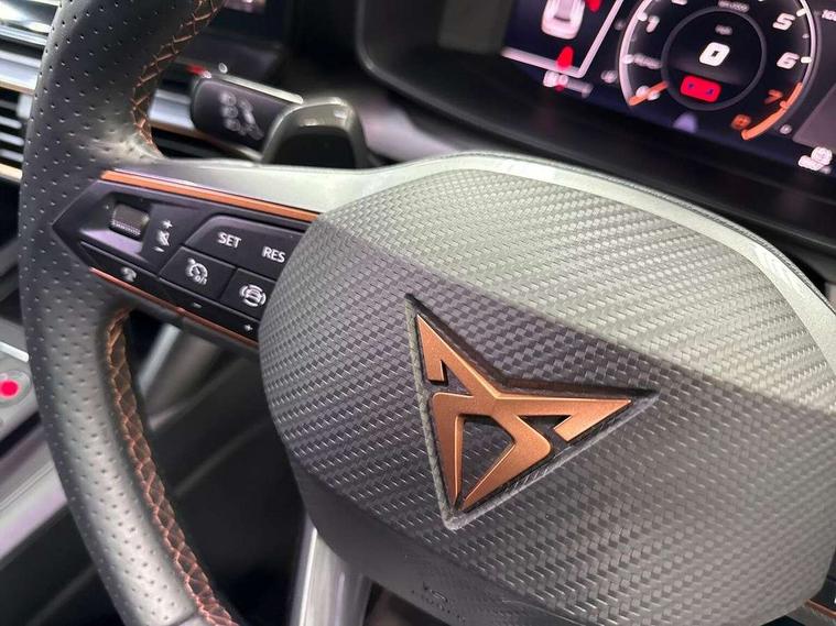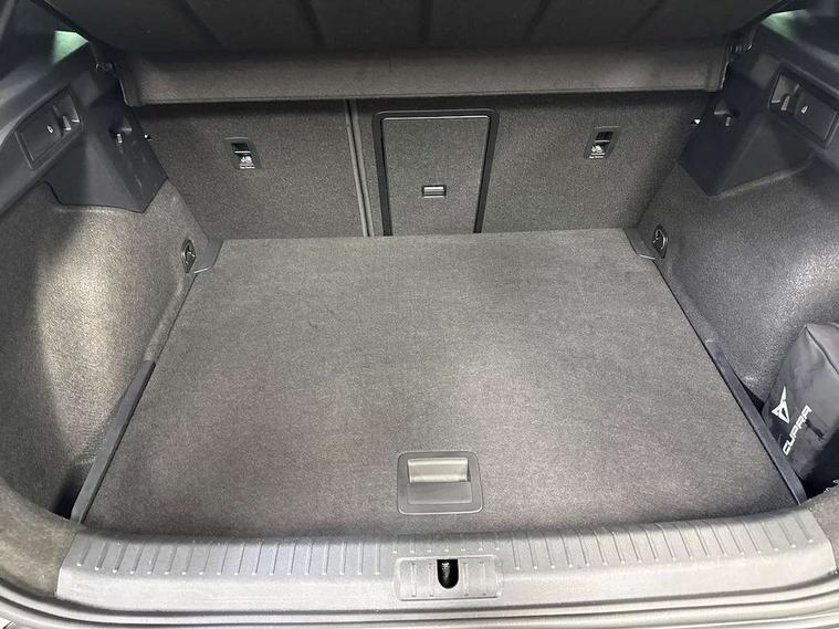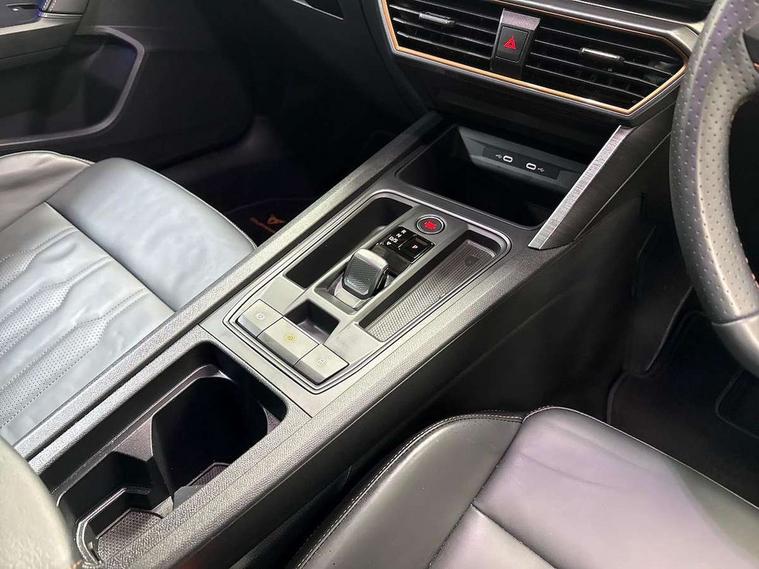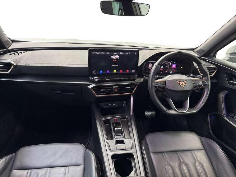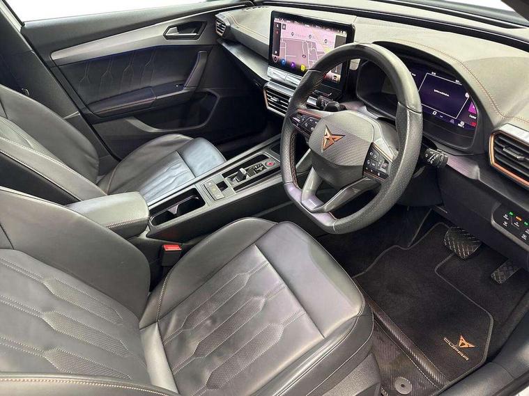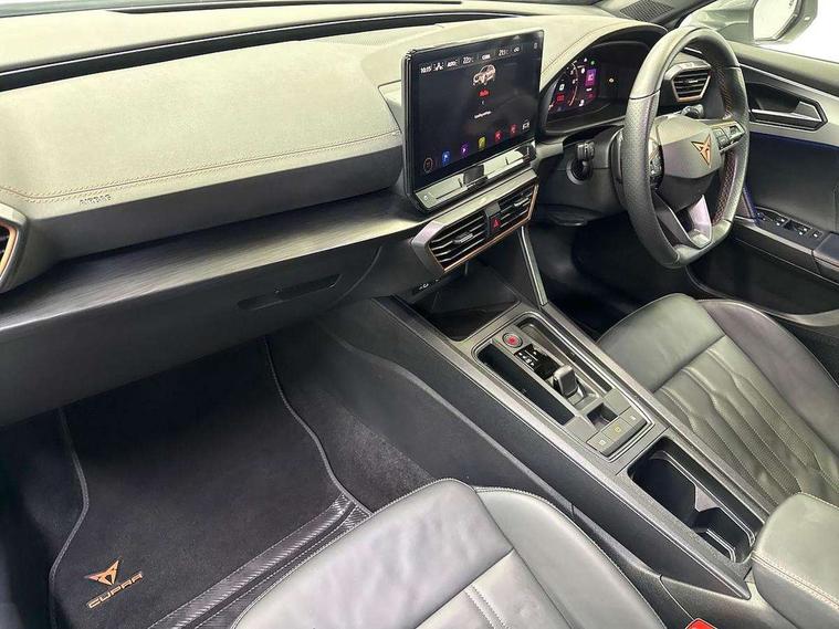 Digital cockpit and configurable dashboard, Driver alert system, Driving profile selection, Forward collision warning with automatic braking, Lane assist, Navigation system with 12'' Touchscreen Display, Park assist (inc front/rear parking sensors), PAS, Predictive adaptive cruise control with speed limiter, Rear view camera, RPM, trip computer, outside temp gauge, instrument light brightness, low fuel warning light, lights on reminder, gearshift indicator, Service interval indicator, Start/stop system with regenerative braking, Voice control system, Wired Android Auto, Wireless apple carplay, Wireless phone charger, Electronic locking differential and dynamic traction support, Standard suspension, 2 front and 2 rear USB type C sockets, Auxiliary input socket, DAB radio, Auto dimming rear view mirror, Body colour door handles, Body coloured bumpers, Dark grey wing mirror, Daytime running light with automatic headlight control and coming home feature, Dynamic headlight range control, Electric front/rear windows, Electrically adjustable heated and folding door mirrors with memory function, Front fog lamps with cornering function, Gloss black roof rails and window surrounds, LED Headlights, LED Taillights with dynamic indicator, Rain sensing wipers, Rear diffuser with black simulated exhaust pipes, Rear side wing doors, Rear wash/wipe, Third brake light, Tinted rear windows, Welcome lights, 12v power supply in centre console, 12V socket, 12v socket in loadspace, 2 front and 2 rear reading lights, 230V socket, 3 seat bench in 2nd row, 60/40 split rear bench seat with armrest and mechanical seat release, Black headlining, Dust/pollen filter, Front and rear head restraints, Front centre armrest, Height/reach adjust steering wheel, Illuminated interior front door sills, Illuminated sunvisor with mirror, Isofix, Leather multi function heated steering wheel with gear shift paddles, Luggage tie-down hooks, Single front passenger seat, Three zone climate control with control panel in rear, Variable luggage/load compartment floor, Wraparound lighting, Genuine Nappa leather Pack - Cupra, 3 point seatbelts on all rear seats, ABS, Brake control system - ESC and brake booster, Child proof door locks, Driver and front passenger airbags with front passenger airbag de-activation, Electronic parking brake, Front and rear disc brakes, Front side curtain airbags, Hill hold control, Public e-call, Seat belt reminder for front and rear seats, Tyre pressure monitoring system, Anti theft alarm system, Keyless entry and start system (KESSY), Locking wheel bolts, Copper and aluminium interior detailing, 19" 'Exclusive' machined sport matte black and silver alloy wheels,