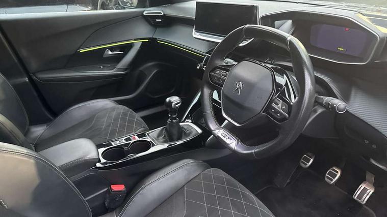 Blind spot monitoring, Bluetooth telephone facility, Connected 3D navigation, Driver attention warning, Exterior temperature indicator with ice warning, Front and rear parking sensors, Lane keep assist, Mirror screen with mirror link, apple carplay and android auto, Multi function trip computer, PEUGEOT i-Cockpit with 10" capacitive colour touchscreen, PEUGEOT i-Cockpit with compact steering wheel, PEUGEOT i-Cockpit with configurable 3D headup instrument panel, PEUGEOT SOS and assistance, Smart phone docking station, Smartphone charging plate, Speed limit recognition and recommendation, Visio Park 1 with 180 degree Colour reversing camera, 2 front USB socket with USB-C, 2 USB sockets in rear, DAB Radio (Digital Audio Broadcasting), Voice recognition for radio, navigation and telephony features, 2 X Rear number plate lights, Automatic front windscreen wipers, Automatic hazard light activation upon heavy brake application, Black diamond roof, Black front wing trim with gloss black detail and GT badging, Body coloured exterior door handles, Dark tinted rear side and tailgate windows, Diamond black mirror shells, Diamond black rear spoiler (roof), Electric, heated, and power folding door mirrors, Frameless electrochrome interior rear view mirror, Front bumper - Silver lower trim, Full LED headlights with smartbeam assist, Gloss black finish on B pillar, Gloss black longitudinal roof rails, Gloss black rear cluster connecting strip, Gloss black roof bars, Gloss black window surround, GT model designation badging on tailgate, Headlights left on audible warning, LED daytime running lights with 3 claw headlight with distinctive tooth design, LED front fog lamps with remote cornering function, LED side indicator lights integrated into door mirrors, Model designation badges front and rear, One touch electric front/rear windows with pinch protection, Radiator grille - Dark chrome chequered and gloss black edge trim, Radiator grille - gloss black top edge trim, Rear full LED 3D peugeot signature claw effect lights with daylight function, Rear reversing lights, Rear windscreen wiper triggered automatically in reverse gear, Stainless steel door sill scuff plates, Tailgate with heated rear windscreen and wiper blade, Twin chromed exhaust pipes, Wheel arch extensions, 1/3 to 2/3 split folding rear seats, 12V socket, 8 Colour personalisable ambient lighting, Aluminium pedals, Automatic air conditioning with pollen and active carbon filter, Central front armrest with storage compartment, Driver and front passenger sport seats, Electric power steering with reach and rake adjustable steering column, Front and rear carpet mats in black with lime green stitch detail, Front LED interior light with 2 reading spotlights and rear interior light with timer, Front passenger seat manual adjustment - height, longitudinal and back rest angle, Gear lever top - manual in full grain leather, Gear shift indicator, Heated front seats, High centre console, ISOFIX child seat mounting points on passenger seat, Lime green contrast stitching to front centre console, door panels and dashboard facia, Mistral full-grain perforated leather steering wheel with Lime Green stitch detail and satin chrome 'GT' emblem, Modular boot floor, Piano keys: Gloss black and chrome toggle switches to access main functions of the vehicle and touchscreen functions, Roof lining - Mistral black, Seatbelt unfastened on the move audible and visual alert for front and rear seats, Drive assist pack - 2008, Visibility pack - 2008, 2x 2nd row ISOFIX child seat mountings, ABS (Anti-lock Braking System) with EBD (Electronic Brakeforce Distribution) and EBA (Emergency Braking Assistance), Acoustic vehicle alerting system, Active safety brake with night function/cyclists/pedestrians, Adaptive driver and front passenger airbags with passenger airbag deactivation function, Child locking functionality on rear doors, Driver/front passenger side airbags, Electric parking brake, ESP (Electronic Stability Program) + Hill Start Assist, Front and rear curtain airbags, Front and rear disc brakes, Front and rear three-point retractable seatbelts, with force limiters, Front optimised safety headrests and rear retractable headrests (x3), height adjustable, Tyre pressure sensor, Alarm system with anti-lift sensor, Automatic door locking when moving off, Deadlocks, Electronic code immobiliser, Peugeot Open and Go (keyless entry and push button start), Carbon effect Dashboard, front and rear door panel finish,