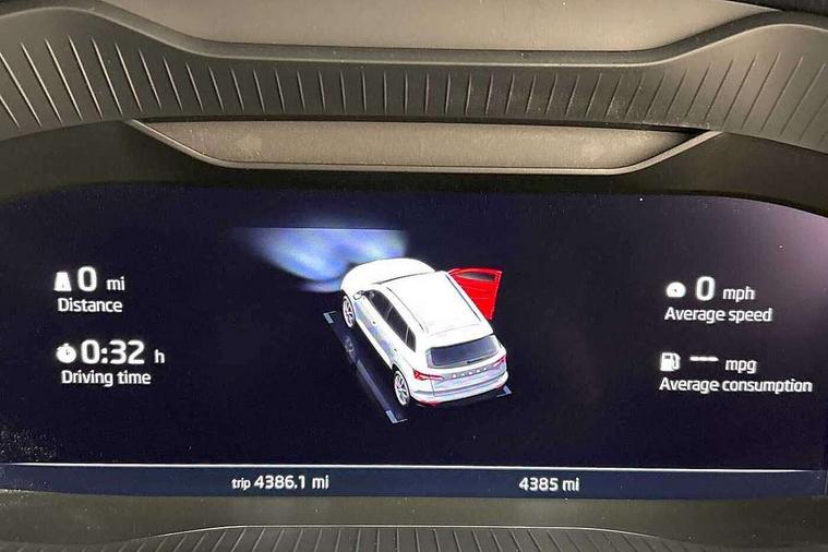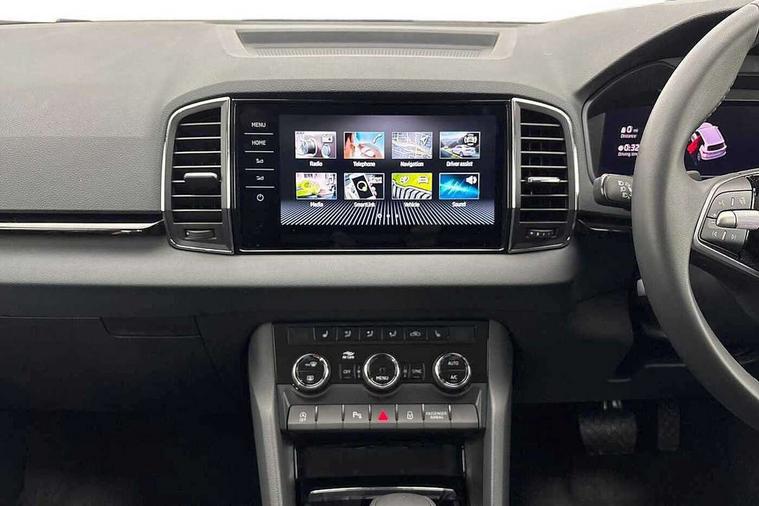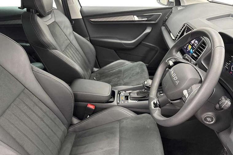 Advanced driver attention and drowsiness monitor, Drive Mode Selection including ECO function, Electro-mechanical PAS, Emergency services call system, Outside temperature gauge, Sensor for driver assistance systems, Service interval indicator, SmartLink wireless for Apple and wired for Android, Start/stop system with regenerative braking, Traffic sign recognition, USB C Port x 2 in front centre console, Virtual Cockpit - 10.25" digital display, Virtual pedal with electrically operated boot door, Wireless smartphone charging, DAB radio with Bluetooth, USB connection, Acoustic glass, Aero front windscreen wipers with intermittent function, Auto dimming rear view mirror with light and rain sensors, Black electric window control buttons, Body colour door mirrors and handles, Electric front and rear windows with child proof lock, Extended rear roof spoiler, Heated rear windscreen, LED daytime running lights, LED rear lights with high functionality welcome effect and dynamic indicators, Light assistant (coming/leaving home/tunnel light), Plastic scuff plates in door apertures, Privacy glass, Rear side wing doors, Rear window wiper with washer system and intermittent control, Safety reflectors on front doors, Third brake light, Unique dark chrome design logo on alloy wheels, 1.5 litre bottle holders in driver and front passenger door panels, 12V socket in boot, 12v socket in front centre armrest with storage compartment and rear air vents, 2 spoke leather heated multifunction steering wheel with DSG paddles, 2 x Tablet holder, 3 rear height adjustable headrests, 3 seat bench in 2nd row, 4 foldable roof handles with rear coat hooks, Black floor carpet, Cargo elements in boot, Chrome inner door handles, Decorative door sills with KAROQ badging, Foldable hooks in the boot, Front head restraints, Height adjustable front three point seats belts with tensioners, Height/reach adjust steering wheel, Ice scraper, Illuminated glovebox, Illuminated luggage compartment, Interior noise suppression, Isofix child seat preparation for front passenger seat, Isofix child seat preparation outer rear, Manual lumbar support for front seats, Pearl grey interior ceiling, Pen holder, Pollen filter, Rear boot cover, Rear package tray, Rear reading lights, Rubbish bin door, Safety vest holder, Single front passenger seat, Skoda lettering on steering wheel, Storage box in upper central dashboard closed, Sunvisors with illuminated vanity mirrors, Textile floor mats, Ticket holder, Columbus pack - Karoq, Design Pack - Karoq, Non Smokers pack, Parking pack - Karoq, Automatic door unlocking in case of crash, Automatic fuel cut off in case of crash, Driver airbag, Electronic parking brake with auto hold function, Emergency rear braking signal, ESC (incl. ABS+MSR+ASR+EDS+HBA+DSR+RBS+MKB), Front side airbags, Head airbags, Hill hold control, Knee airbags, Passenger airbag with switch-off function, Pedestrian monitor, Power operated child safety locks, Seatbelt reminder signalisation and pretensioner for all seats, Three point seatbelts rear, Two tone horn, Tyre pressure monitor, Alarm with interior monitoring, back up horn and tilt sensor with safe function, Electronic engine immobiliser, Keyless entry and start/stop, Remote central locking with 2 remote folding keys, Black centre console, Chrome framed air vents, Satin black dashboard, Anti-theft wheel bolts protection, Breakdown and tool kit,