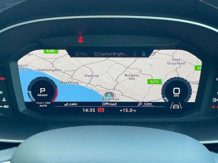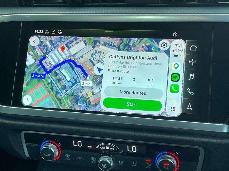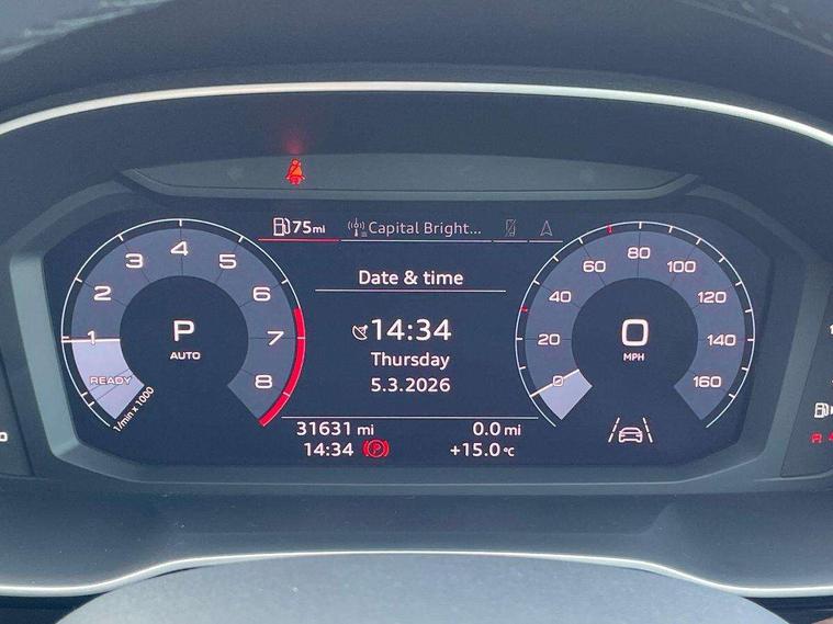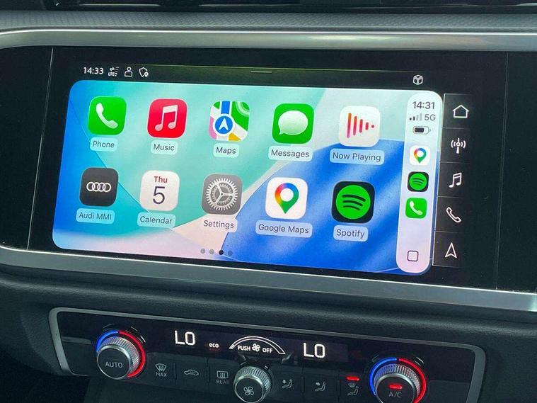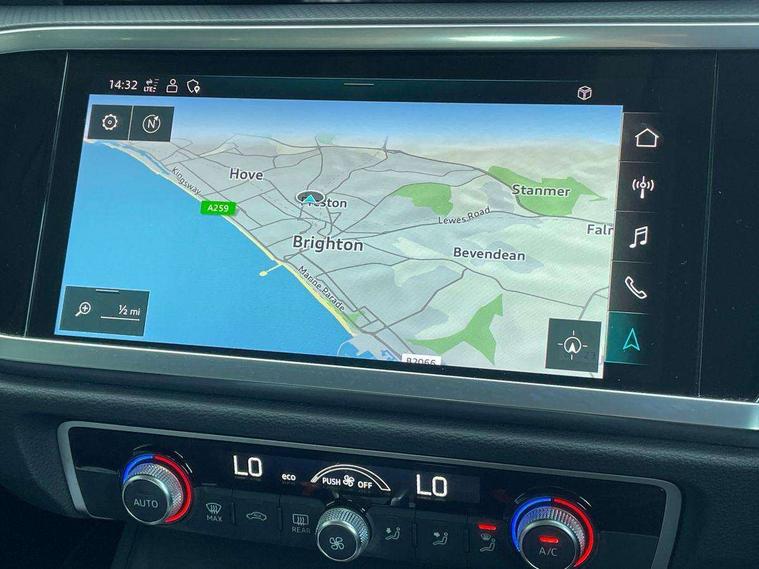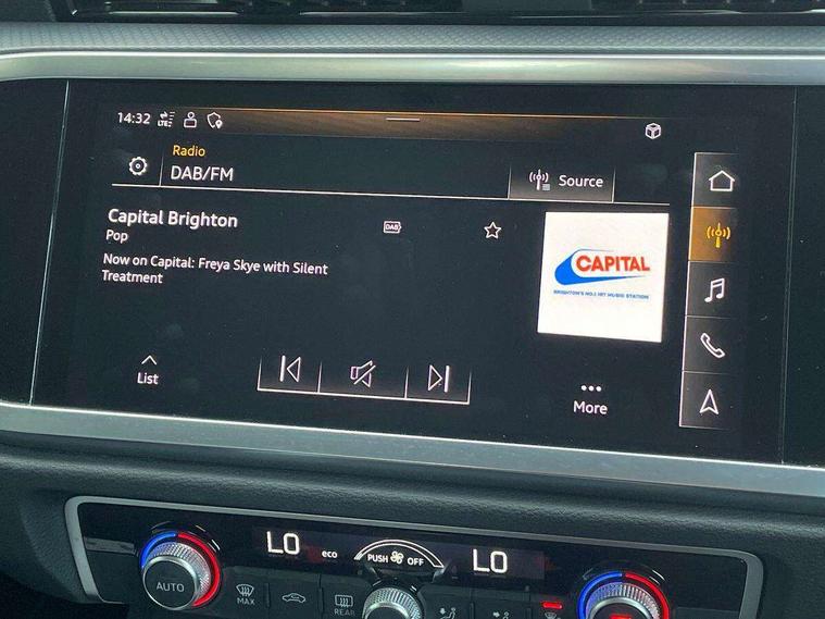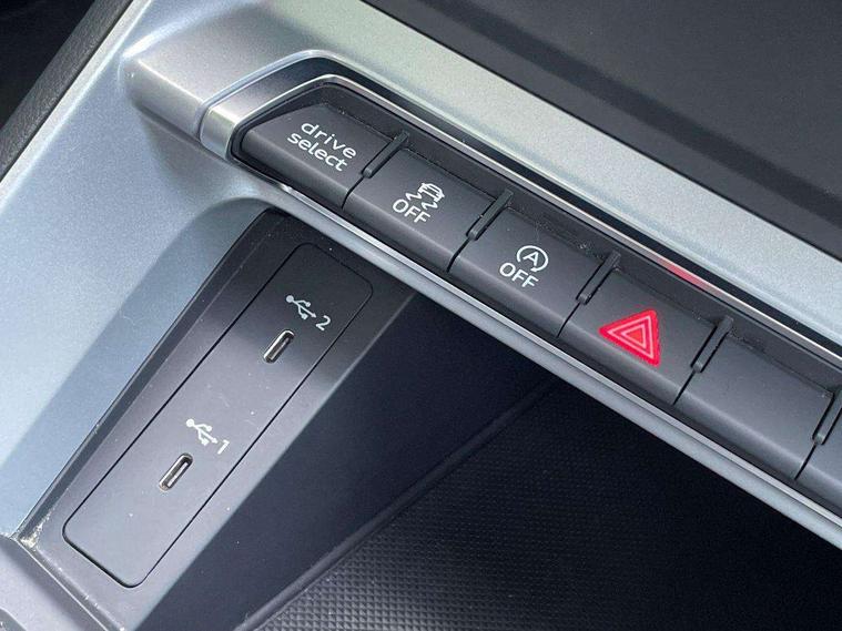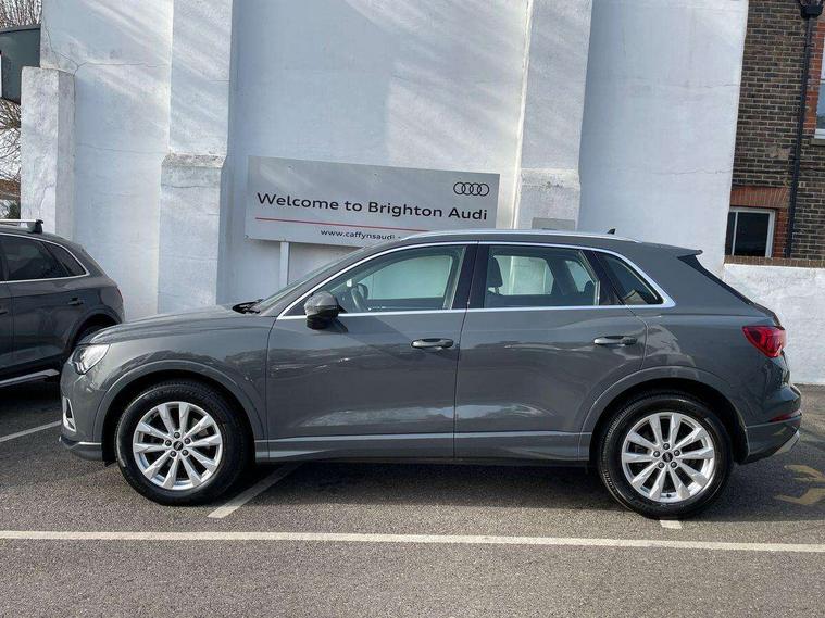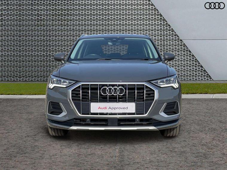 Audi connect safety and service (e-call), Audi drive select, Audi lane departure warning, Audi Virtual Cockpit - 10.25" display, Bluetooth interface, Camera based traffic sign recognition, MMI Navigation Plus with high resolution 10.1 inch touchscreen colour display, Power operated tailgate, Progressive steering, Service interval indicator, Smartphone interface includes wireless Apple carplay/Android Auto, Start stop system with recuperation, Voice control system with natural language interaction, 48V Mild hybrid technology, Standard suspension, 2 USB-C ports with charge and data functions, 6 passive loudspeakers, DAB digital radio module, Acoustic windscreen, Aluminium roof rails, Aluminium window trim, Auto dimming frameless rear view mirror, Body coloured bumpers, Electrically folding, adjustable and heated door mirrors with integrated LED side indicators and kerb view function for passenger side, Front and rear electric windows, Front fog lights, Front side air inlets in matt selenite silver, Front spoiler in matt selenite silver, Grille vertical bars in aluminium silver/Matt, High gloss black finish B and C pillars, LED headlights with LED daytime running lights and dynamic rear indicator, LED rear lights, Rain and light sensors, Rear diffuser strip in matt selenite silver, Silver chrome grille surround, Titanium black radiator grille, 12V socket in rear centre console, 3 spoke multi-function leather steering wheel, 40:20:40 folding with manual adjustment for 60:40 forwards/backwards position and backrest angle, Adjustable rear seat bench/backrest, Aluminium door sill trims, Dual zone electronic climate control, Front and rear floor mats, Front and rear headrests, Front and rear roof module including reading lights, Front centre armrest, Glove compartment lighting, Height and reach adjustable steering wheel, ISOFIX child seat mounting for front passenger with airbag deactivation and outer rear seat including top tether attachment point for outer rear seats, Luggage compartment light, Lunar silver cloth headlining, Manual front seats with height adjustment, Stainless steel luggage compartment sill finisher, Non smoking pack - Q3, 3x3 point rear seatbelts, 6 airbags - Driver, front passenger, curtain and side windows, Audi pre-sense front with pedestrain and cyclist recognition, Electrically operated child locks on rear doors, Electromechanical parking brake, Electronic stabilisation control including ABS, ASR and EDL, Hill descent control, Hill hold assist, Pre sense basic, Seatbelt monitoring, Tyre pressure warning, Warning triangle and first aid kit, Anti theft alarm, Anti theft wheel bolts, Remote central locking, Detail dashboard around MMI touch colour display in glass look, black with surround in aluminium look, Micrometallic silver inlay, Tool kit, Tyre repair kit,