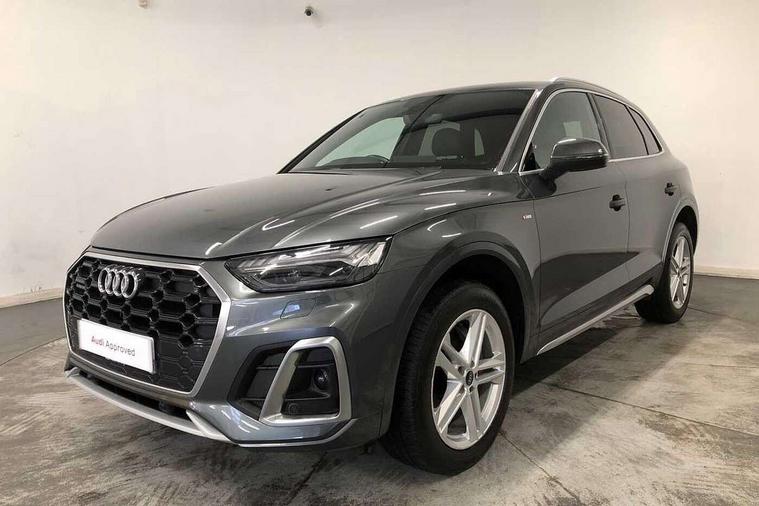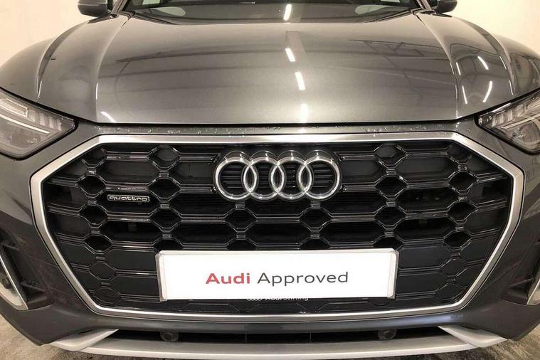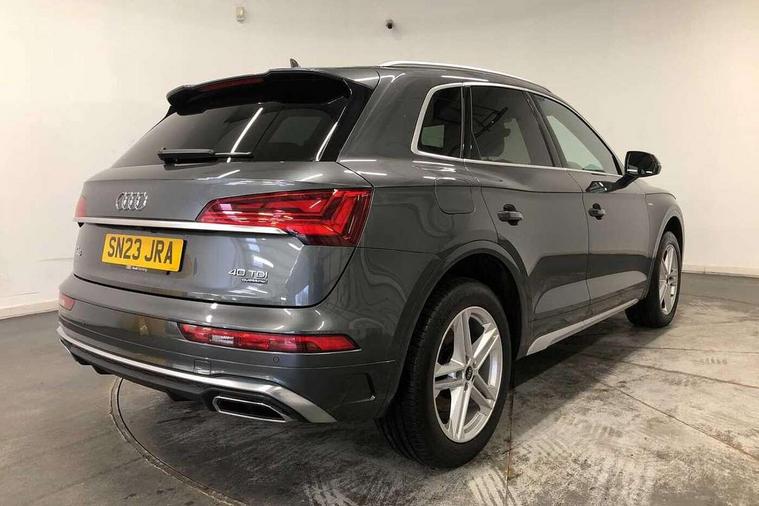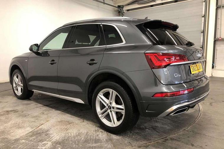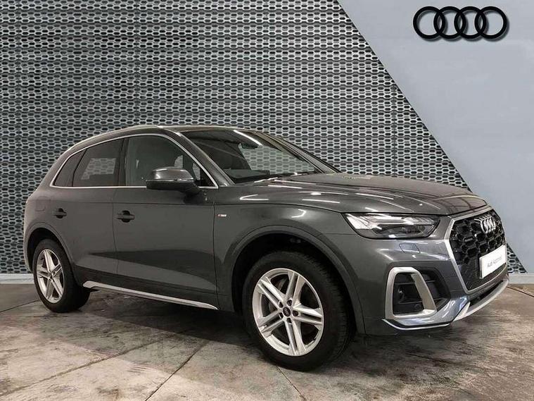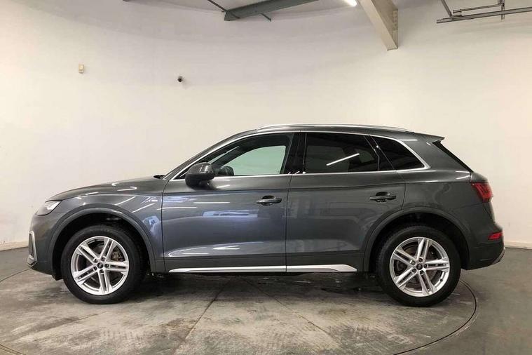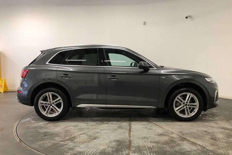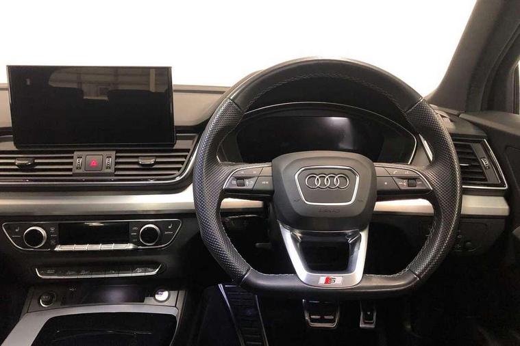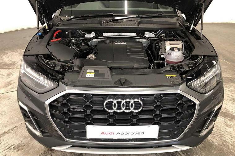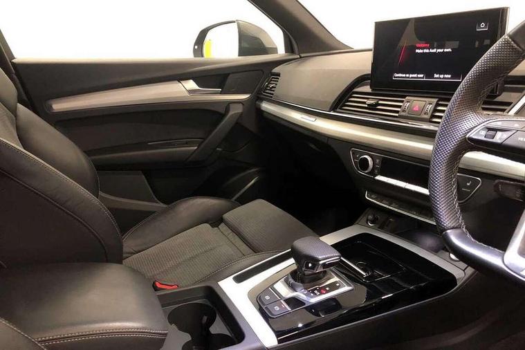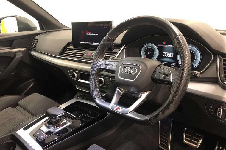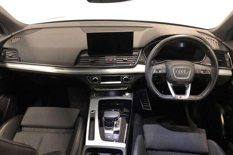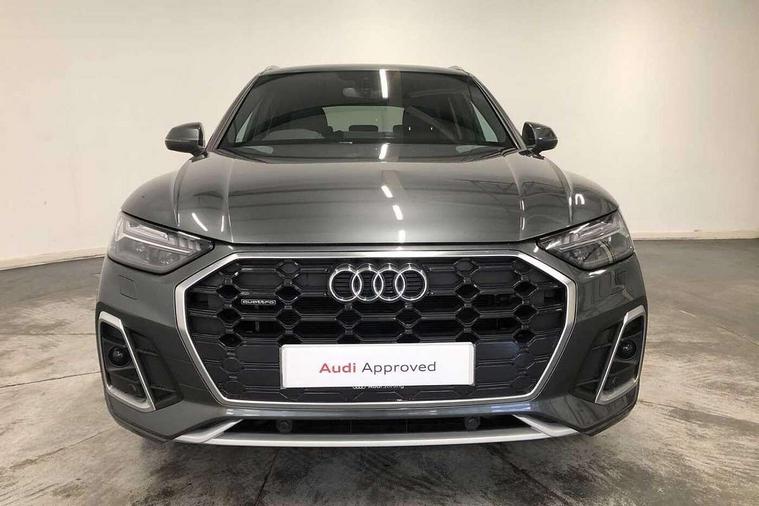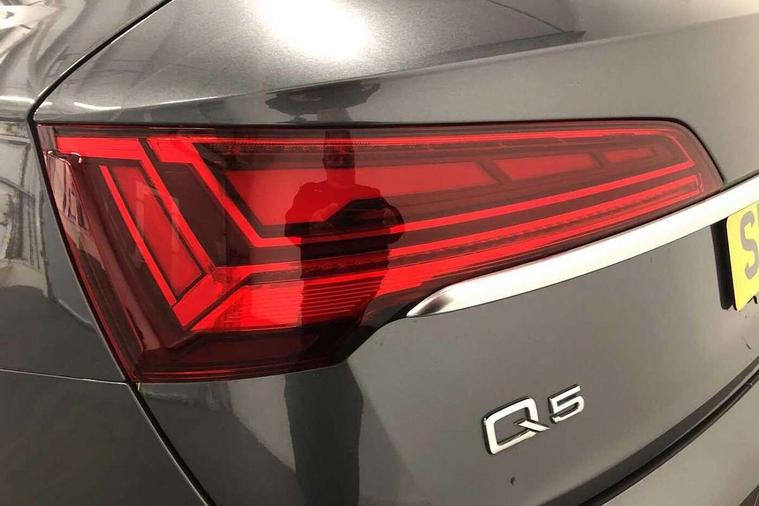 Acoustic front and rear parking sensor, Audi connect safety and service (e-call), Audi connect with Amazon Alexa Integration, Audi drive select, Audi virtual cockpit plus with 12.3" screen and three different layout designs, Audi wireless smartphone interface, Automatic start-stop system with coasting functionality and efficiency programme, Bluetooth interface, Electro - mechanical power assisted steering, MMI navigation plus with 10.1" touch screen, Power tailgate, Reversing camera, Service interval indicator, Voice control system with Audi hotword activation "Hey Audi", Diesel particulate filter, Quattro on demand, S line sports suspension, 2 x USB charging port with aux input socket, 8 loudspeakers, DAB Digital radio, Acoustic windscreen, Aluminium roof rails, Audi matrix LED headlights with dynamic front and rear indicators, Auto dimming door mirrors, Auto dimming frameless rear view mirror, Automatic headlight adjustment, Automatic headlights and windscreen wipers, Body colour bumpers, Body colour door mirrors, Body colour rear diffuser with matt aluminium silver surrounds, Body colour underbody protection, Chrome plated exhaust trims, Daytime running lights, Door sills in Selenite silver, Electric adjustable/heated/folding door mirrors, Front air inlet surrounds in aluminium, Front and rear electric windows, Front radiator grille in honeycomb design, Headlight washers, High level LED brake light, Lower bumpers painted in contrast Manhattan grey, Rear chrome trim strip below lights, Rear privacy glass and rear side windows, Rear side wing doors, Rear wiper, Roof bars, S Line badges on the front wings, S Line front and rear bumpers, S Line rear spoiler, S Line side skirts, 3 rear headrests, 3 spoke leather multifunction steering wheel with S badging perforated leather grips, 40:20:40 split folding 3 rear bench seat in 2nd row with rear centre armrest, Black cloth headlining, Comfort front centre armrest, Contrast stitching on seats, steering wheel and gear lever gaiter, Deluxe 3 zone electronic climate control, Front/rear floor mats, Gear lever in black leather, Heated front seats, Height adjustable front head restraints, Height/reach adjustable steering column, Illuminated door sill trims with S logo, Luggage compartment cover, Manual seat adjustment with 4-way electric lumbar support, Removable luggage compartment floor, Single front passenger seat, Stainless steel pedals, Sunvisors with vanity mirrors, High gloss pack - Q5, LED interior light pack - Q5, 3 point seatbelts on all seats, 6 airbags - Driver, front passenger, curtain and side airbags, Electrically operated child locks on rear doors, Electromechanical parking brake, Electronic stabilisation control including ABS, ASR and EDL, First aid kit with warning triangle and vests, Front passenger airbag deactivation, Hill descent control, Hill hold assist, ISOFIX child seat mounting for front passenger seat and ISOFIX child seat mounting with Top Tether for outer rear seats, Multi collision brake assist, Pop-up bonnet for pedestrian protection, Pre sense city, Seat belt force limiter, Seatbelt monitoring, Tyre pressure warning, Anti theft alarm, Anti-theft wheel bolts, Keyless Go access/ignition system, Remote central locking, Air vents inserts and centre console in gloss black, Matt brushed aluminium inlays,
