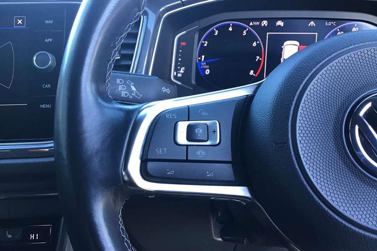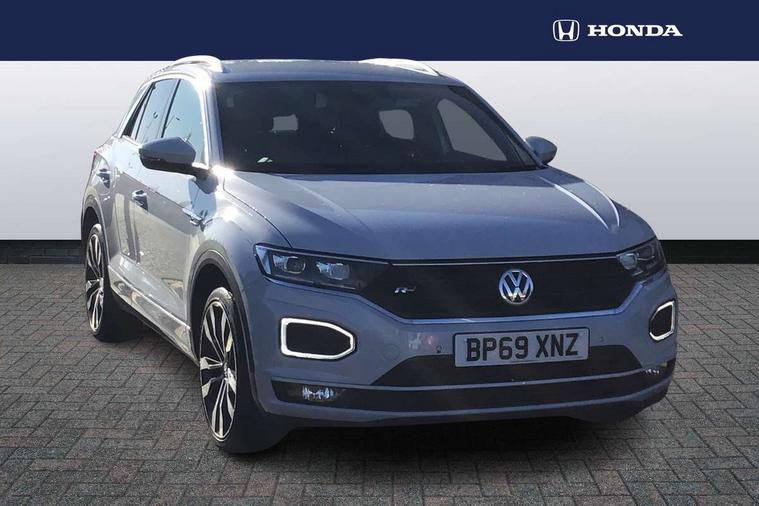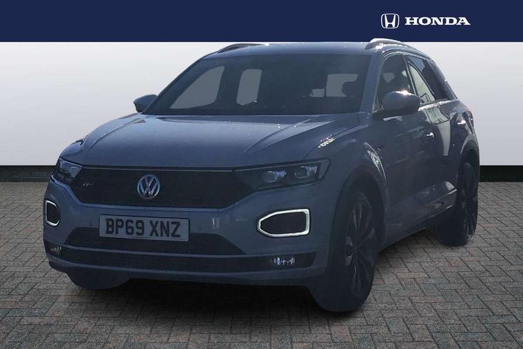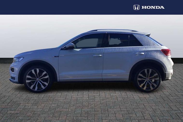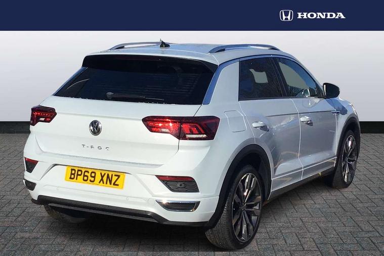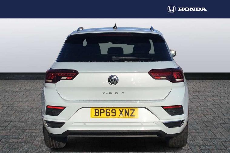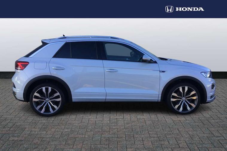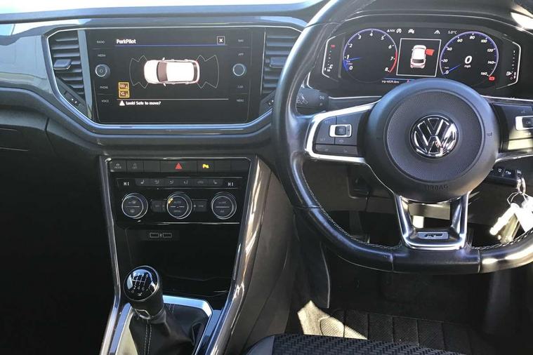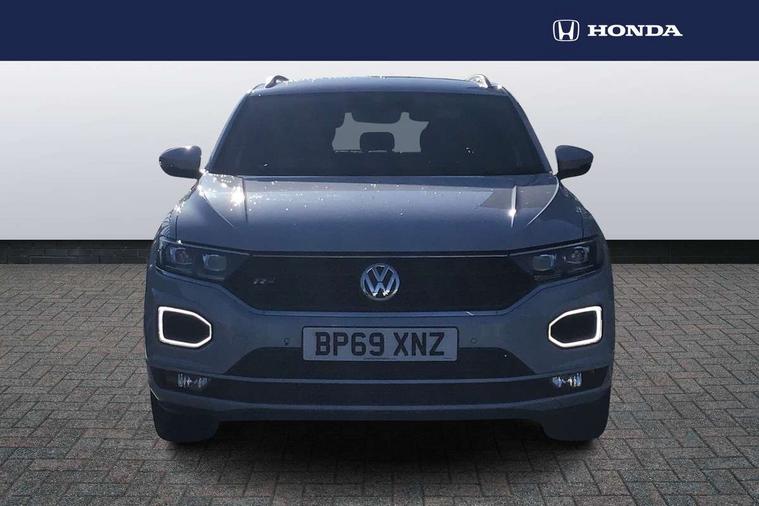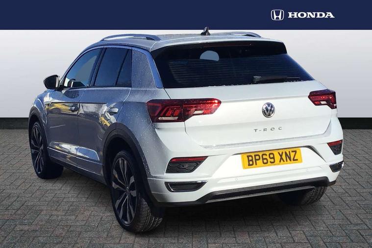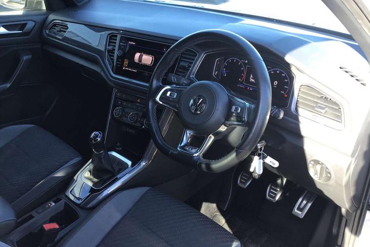 App-Connect, 'Lights On' Reminder warning buzzer, 2 USB connection charging sockets, Active Info Display, 10.3" high resolution TFT dash display screen with customised information, Adaptive cruise control with front assist, radar sensor controlled distance monitoring, city emergency braking, Automatic start/stop system, Bluetooth telephone and audio connection for compatible devices, Car information display, Car-Net Security and Service, Discover navigation, 8" touch screen navigation/infotainment system with Car-Net, European map, CD/radio, 2D/3D map and speed limiter, Driver alert system with audible and visual fatigue detection system, Driver tips and journey analysis, Driving profile selection - Eco, normal, sport or individual modes with Individual mode allows for steering, drive and air conditioning settings, Dusk sensor, Lane assist, Multifunction computer with visual gear change recommendation for fuel consumption, Service interval indicator, Think blue trainer driver tips and journey analysis, Voice activation, Warning sound and light for doors and tailgate open, Warning sound and light for front seatbelts unfastened, Battery regeneration during braking, DAB Digital radio, Dynamic navigation based on TMC+, Multi device interface (MDI) with USB connection, Music playback - MP3, WMA and AAC files, Premium USB cable in choice of either Apple or Android smartphone compatibility, SD card slot, Simultaneous pairing of 2 compatible mobile devices, SMS functionality - read, compose and send SMS messages using touch-screen display, Three route options - Fast, Short, Eco, Title and cover art display, Auto dimming interior rear view mirror, Automatic hazard lights activation under emergency braking, Black grained lower door protectors, Body colour door handles, Body colour rear roof spoiler, Chrome effect left and right trapezoid exhaust tailpipe fascia surround, Chrome trim on upper and lower radiator grille, Electrically foldable, adjustable and heated door mirrors with puddle lights and reverse activated kerb-view adjustment on passenger's door mirror, Front and rear electric windows, Front fog lights with static cornering function, Front windscreen wiper with intermittent wipe and 4 position delay, Fully galvanised body, Heated rear window, High level 3rd brake light, LED darkened rear light clusters, LED dipped and main beam headlights with automatic range adjustment including signature LED daytime running lights, LED rear number plate lights, Manual coming/automatic leaving home lighting function, Rain sensor, Rear tinted glass from B-pillar backwards approx 65% tinted, Rear wash/wipe with intermittent wipe setting, 12V socket in centre console storage area, 2 Front and rear reading lights incorporating LED technology, 3 rear head restraints, 4 load lashing points in luggage compartment, Aluminium pedals, Ambient lighting in front footwell and light strips below trim in front doors, Black roof lining and sun visors, Branded points of interest, Carbon flag cloth upholstery, Climate control - 2 zone electronic air conditioning with automatic air recirculation and allergy filter, Drawer under drivers seat, Front and rear carpet mats with contrast stitching, Front centre armrest with storage compartment, longitudinal and height adjustable and two rear air vents, Front cupholders x 2, Front footwell illumination, Front seat back storage pockets, Front sports seats with R-Line logo on seat backrest, Glovebox, Height adjustable front seats, Height/reach adjust steering wheel, Illuminated vanity mirrors, Instrument lighting, white adjustable panel illumination, Interior light delay, Isofix easy fit child seat preparation for 2 outer rear seats, Load through provision with single cup holder when folded down, Luggage compartment cover, removable, Luggage compartment lighting, R Line badge, Split folding rear seat backrests with centre armrest, Storage compartment in left and right luggage area, Storage compartment in rear doors, Storage compartments in driver and front passenger doors, Three spoke multi function leather trimmed steering wheel including gear knob with contrast stitching and aluminium inserts and R Line logo, Unique R Line door sill protectors, R line styling pack - T-Roc, Winter pack - T-Roc, 3 rear three point seatbelts, ABS, Curtain airbags, Driver and front passenger safety-optimised head restraints, Drivers and front passengers airbags with passengers deactivation switch, Electronic parking brake with auto hold, Electronic stability control (ESC) includes ASR, EDL, EDTC and trailer stabilisation function, Front seat side impact airbags, Predictive pedestrian protection, Rigid safety cell with front and rear crumple zones, Three point height adjust front seatbelts + pretensioners, Tyre pressure loss indicator, Ventilated front and rear disc brakes, Volkswagen roadside assistance, Alarm with interior protection and deactivation via infotainment system, Electronic engine immobiliser, Remote central locking with 2 remote folding keys, Shadow steel decorative inserts in dash and door panel, 19" Suzuka alloy wheels with low rolling resistance tyres and anti wheel bolts, Space and weight saver spare wheel,