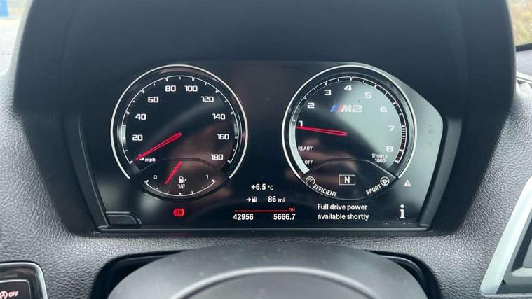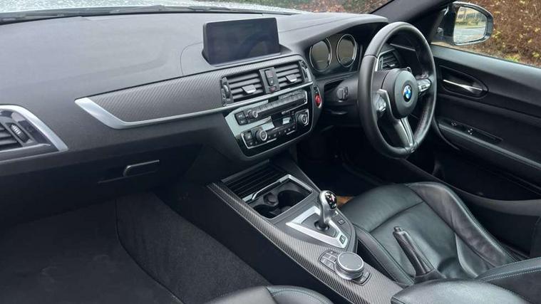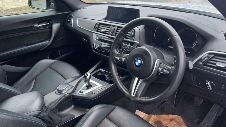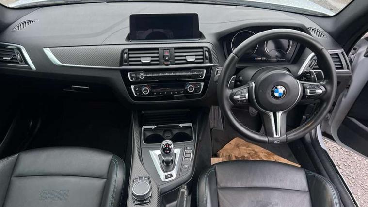 Auto start-stop, BMW Online services, BMW remote services, BMW Teleservices, Cruise control with braking function, Door/boot open warning, Front and rear Brake pad wear indicator, Front/rear Parking distance control, Instrument cluster with speedometer with miles per hour read out, tachometer and fuel gauge, Lights on warning by audio warning signal when ignition is switched off, M Servotronic power steering, Oil sensor for level and grade, warning by check control system, Oil temperature display via on board computer in instrument cluster, On board computer - average speed+fuel consumption, service interval, clock/date, odometer/trip meter, outside temperature display and ice warning, Optimum shift indicator, Personal Profile - automatic lock when driving away selectable, Real time traffic information, Speed limiter, Battery age recognition function, Drive performance control with ECO PRO comfort + sport mode, Engine cover with BMW roundel twin power turbo designation, M sport suspension, Oil dipstick, DAB Digital radio, 2 speed adjustable intermittent wipers with wash/wipe function, Automatic headlight beam throw control, Automatically dimming rear view mirror, Black chrome exhaust, Body colour bumpers, Body colour door handles, Body colour mirror caps, Body colour roof mouldings, Clear lenses direction indicator lights, Darkened rear lights with LED light bars, Daytime driving lights, Direction indicator side lights integrated exterior mirrors, Dual dark chrome exhaust tailpipes, Dynamic brake lights, Electric windows - front and rear, with open/close fingertip control, anti-trap facility and comfort closing, Electrically adjustable and heated M specific exterior mirrors, Follow me home headlights, Front apron with large air inlets, Green tinted heat protection glazing, Headlight range control, Heated windscreen washer jets, High gloss black kidney grille with M double rod vertical slats and M2 badging, High gloss black M side strakes with M2 designation, High gloss shadow line, High level third brake light, LED rear lights, LED welcome home lights, M rear spoiler, M2 specific aerodynamic body styling with unique kidney grille, front bumper, rear bumper and side skirts, Rain sensor with automatic headlight activation, Rear bumper with high gloss black finish, Rear fog lights, Reversing light in rear light cluster, Shark fin roof aerial, Visible VIN plate, Welcome lighting, 12V power socket in centre console, 12V power socket in passenger footwell, 4 grab handles, Anthracite headlining, Anthracite Velour floor mats, Automatic two zone climate control air conditioning, Conditioned based service, Dakota leather upholstery, Driver and front passenger lumbar support, Driver and front passenger seat heating, Folding rear seat head rests, Folding storage compartment with glasses holder + coin tray, Front and rear side armrests integrated into door trim, Front door sill finishers with M designation, Front door storage bins, Front head restraints, Front sliding armrest, Glove box handle with chrome surround, Isofix child seat for two outer rear seats, Leather gearknob, Leather handbrake lever, Luggage compartment access via BMW roundel, M multifunction nappa leather steering wheel, M Sports seats, Manually adjustment steering wheel column, Rear coat hooks, Rear folding head restraints, Storage compartment in rear centre console, Two cupholders with sliding cover and inlay mat, Two extra lashing eyes in luggage compartment, Interior comfort pack - 2 Series/M2, Media pack - Professional - 2 Series/M2, Active differential brake (ADB), electronic differential lock in DSC-OFF mode, Airbag - Front driver and passenger, front and rear head, front side, curtain head protection, manual deactivation of front passenger airbag possible, Anti lock braking system (ABS) with brake assist, Automatic Stability Control (ASC), Battery safety cut-off, BMW emergency call, Brake drying, Brake energy regeneration, Braking readiness, Cornering brake control (CBC), Crash sensor activating central locking release with hazard warning lights and interior lighting + battery safety cut-off, Dynamic brake control, Dynamic stability control + (DSC+), Dynamic Traction Control - DTC, Front pyrotechnic belt tensioners and belt force limiter, rear coaded belt buckles, Hill start assist, M dynamic mode, M Sport seatbelts, Seat belt security check for driver and front passenger, Side impact protection, Twin horns, Tyre pressure monitoring with 3 level warning strategy, Warning triangle and first aid kit, Central locking switch for all doors, fuel filler cap and luggage compartment, Check control system for monitoring of lights and door/luggage compartment open warning, Drive away door locking, Locking wheel bolts, Remote control including integrated key with blue insert, Thatcham category 1 alarm system with remote control and engine immobiliser, Carbon fibre interior trim with black high gloss finish, BMW mobility system, Reduced rolling resistance tyres,