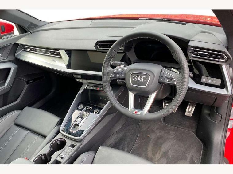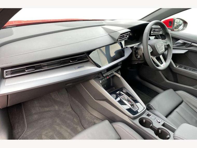 Adaptive cruise control (ACC), Adjustable speed limiter, Audi drive select (Auto, Comfort, Dynamic, Efficiency and Individual), Audi virtual cockpit plus - 12.3" full HD resolution dynamic digital instrument cluster, Automatic start/stop system with recuperation, Bluetooth interface, Camera based traffic sign recognition, Collision avoidance assistant, Driver attention and fatigue detection, e-Call (emergency call), Electromechanical power speed sensitive steering, Emergency assist, Intersection assist, Lane departure warning system, MMI Navigation Plus with high resolution 10.1" colour touch screen display, Park Assist with parking system Plus, Reversing camera, Service indicator, Smartphone interface with app store includes wireless Apple carplay, Android auto and Amazon alexa integration, Trip computer, Voice control system with natural language interaction, Sports suspension, Audi Phonebox light with wireless charging, Audi sound system - 10 loudspeakers including centre loudspeaker and subwoofer, DAB Digital radio, USB ports with charging function in the rear, Acoustic glass windscreen, All weather light, Aluminium window trim, Auto dimming frameless rear view mirror, Automatic dynamic range control, Body colour exterior mirrors, Dipped beam, main beam, position light and turning light, Electrically adjustable/heated/folding/auto dimming door mirrors with integrated LED indications + kerb view function for passenger side, Exterior model badging, Front and rear side air inlets in grained matt black with dark liquid chrome frame, Front electric windows, Front radiator grill in high gloss dark chrome, Heat insulating glass windscreen, Illuminated door sills with aluminium inserts at the front with S logo, Intersection light, Invisible tailpipe, LED 3rd brake light, LED brake lights, LED daytime running x3, LED headlights with LED rear lights and dynamic rear indicators, LED rear number plate lights, LED reverse light, LED tail lights, Light and rain sensors, Manoeuvring light, Motorway light, Privacy glass - dark tinted rear window, rear door and side windows, Rear diffuser and grill in grained matt black with inlay in dark liquid chrome, Rear electric windows, Rear side wing doors, Rear wiper, S line bumpers, S roof spoiler, Side S line emblems on front wings, Side sill trim in dark liquid chrome, Static cornering light, 12V socket and storage compartment in front centre console, 3 seat bench in 2nd row, 3 spoke flat bottomed leather multifunction sport steering wheel with gear shift paddles, 3-zone deluxe automatic air conditioning, 4 way electrically adjustable lumbar support for driver and front passenger, 40/20/40 split folding rear seat bench, Black cloth headlining, Black front and rear floor mats, Front and rear centre armrest in artificial leather with contrasting stitching on armrests and instrument panel, Front and rear headrests, Heated front seats, Height and reach adjustable steering wheel, i-Size child seat mounting on the front passenger side and outer rear seats, i-Size and top tether on the outer rear seats, Manual boot compartment lid, Manually adjustable front seats, Rear centre armrest with cupholder, S badging on the steering wheel, Seat side bolsters, Single front passenger seat, Stainless steel pedals and front footrest in black, Twin leather upholstery with front sports seats S embossed logo, Aluminium interior elements pack - A3, Multi-coloured LED interior lighting package with Multi-coloured contour lighting of instrument panel - A3, 3x3 point rear seat belts, Driver and front passenger airbag with passenger airbag deactivation, Electronic Stabilisation Control (ESC) including ABS, ASR and EDL, First aid kit with warning triangle and 2 safety vests, Front side airbags with head airbags and interaction airbag, Hill hold assist, Pre-sense front with pedestrian and cyclist detection, Seatbelt monitoring, Tyre pressure loss indicator, Anti theft alarm, Anti-theft wheel bolts, Electronically operated child locks, Immobiliser, Black dashboard, Inlay in dark aluminium spectrum,
