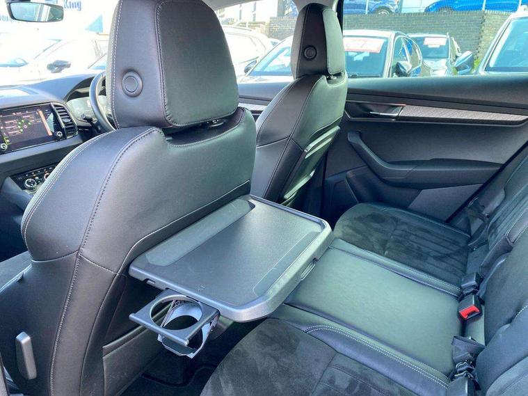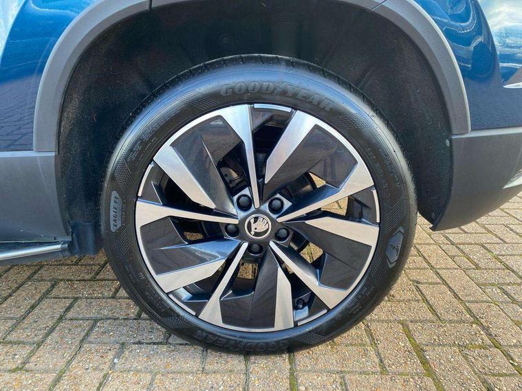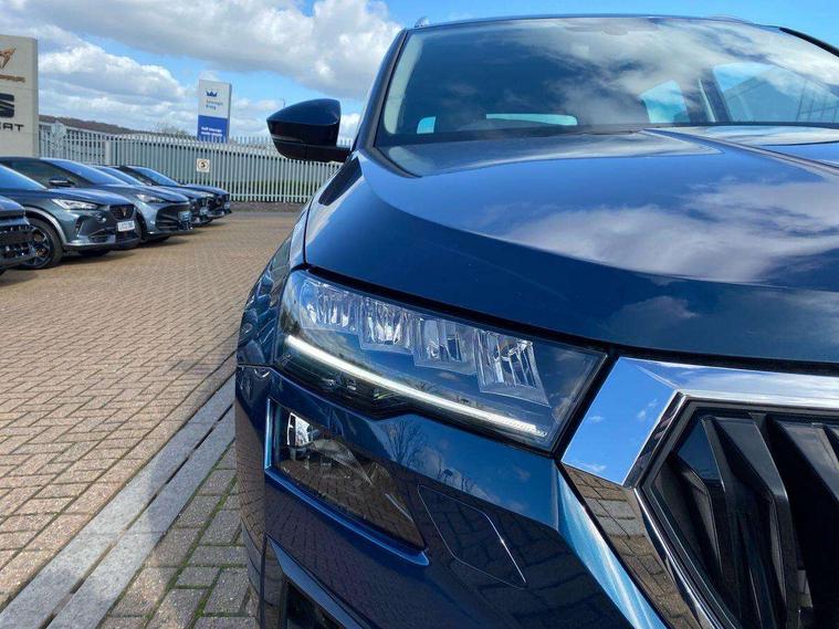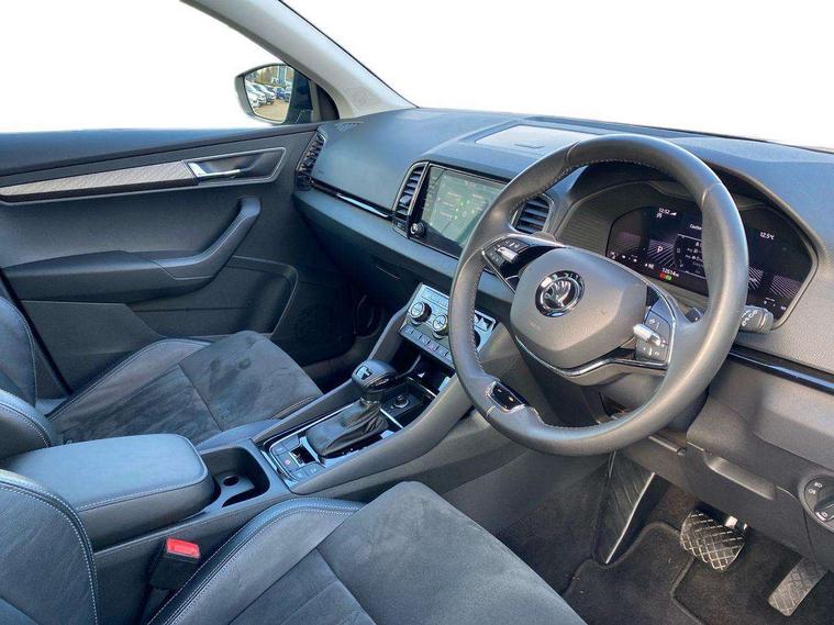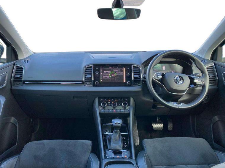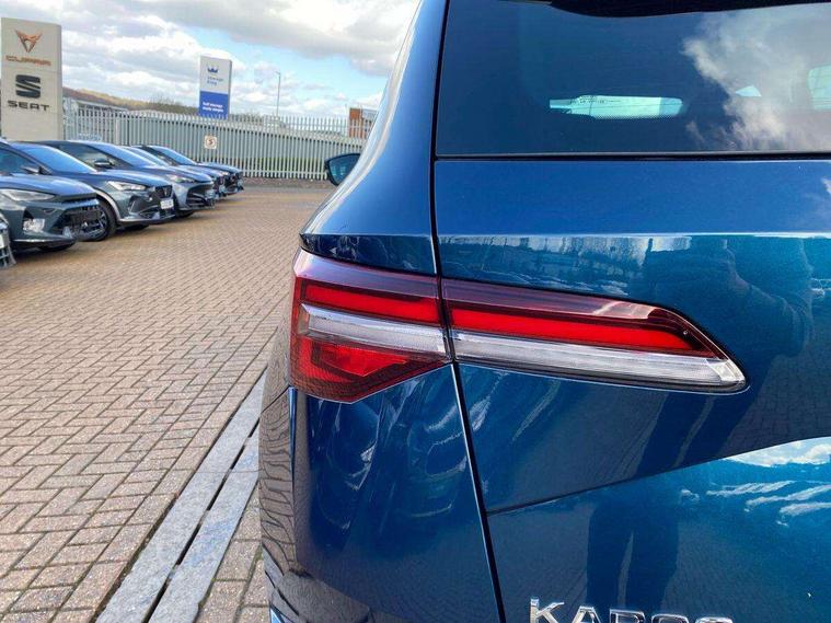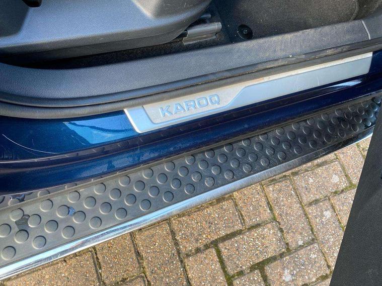 8" Digital display, Care connect, Driver fatigue sensor, Emergency services call system, Outside temperature gauge, Service interval indicator, SmartLink wireless for Apple and wired for Android, Start/stop system with regenerative braking, USB C Port x 2 in front centre console, 8 Speakers, DAB radio with Bluetooth, USB connection, Acoustic glass, Aero front windscreen wipers with intermittent function, Auto dimming rear view mirror with light and rain sensors, Black electric window control buttons, Body colour door mirrors and handles, Dynamic headlight range control with cornering light function, Electric front and rear windows with child proof lock, Heated rear windscreen, LED daytime running lights, LED rear lights with high functionality welcome effect and dynamic indicators, Light assistant (coming/leaving home/tunnel light), Plastic scuff plates, Privacy glass, Rear side wing doors, Rear spoiler, Rear window wiper with washer system and intermittent control, Safety reflectors on front doors, 1.5 litre bottle holders in driver and front passenger door panels, 12V socket in boot, 12v socket in front centre armrest with storage compartment and rear air vents, 2 Folding hooks and nets in boot, 2 spoke leather heated multifunction steering wheel with DSG paddles, 2 x Tablet holder, 3 rear height adjustable headrests, 3 seat bench in 2nd row, 4 foldable roof handles with rear coat hooks, Black floor carpet, Chrome inner door handles, Decorative door sills with KAROQ badging, Double sided boot floor, Foldable hooks in the boot, Front head restraints, Height adjustable front three point seats belts with tensioners, Height/reach adjust steering wheel, Ice scraper, Illuminated glovebox, Illuminated luggage compartment, Isofix child seat preparation for front passenger seat, Isofix child seat preparation outer rear, Manual lumbar support for front seats, Pen holder, Pollen filter, Rear boot cover, Rear reading lights, Rubbish bin door, Safety vest holder, Single front passenger seat, Storage box in upper central dashboard closed, Sunvisors with illuminated vanity mirrors, Textile floor mats, Ticket holder, VarioFlex seats with standard rear seat release, Chrome roof rails + chrome pack - Karoq, Parking pack - Karoq, Automatic door unlocking in case of crash, Automatic fuel cut off in case of crash, Child locks on rear doors, Driver airbag, Electronic parking brake with auto hold function, Emergency rear braking signal, ESC including ABS, MSR, ASR, EDS, HBA, DSR, RBS, MKB and traction control, Front side airbags, Hill hold control, Knee airbags, Passenger airbag with switch-off function, Pedestrian monitor, Seatbelt reminder signalisation and pretensioner for all seats, Three point seatbelts rear, Two tone horn, Tyre pressure display, Tyre pressure monitor, Alarm with interior monitoring, back up horn and tilt sensor with safe function, Electronic engine immobiliser, Keyless entry and start/stop, Remote central locking with 2 remote folding keys, Chrome framed air vents, 18" Procyon silver alloy wheels with anthracite aero inserts, Anti-theft wheel bolts protection, Storage on wheel cover, Tool kit,