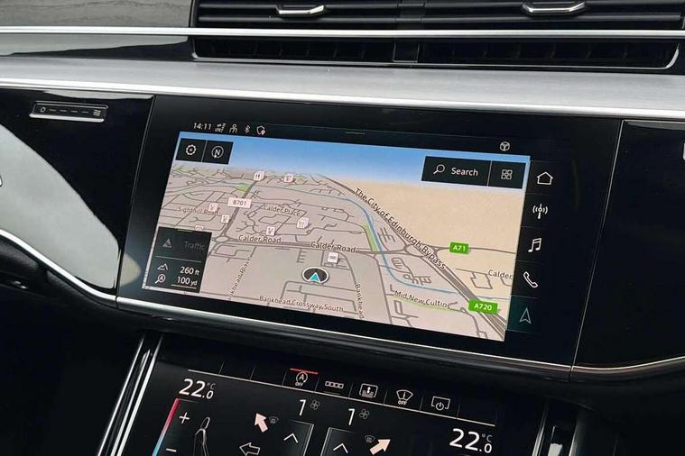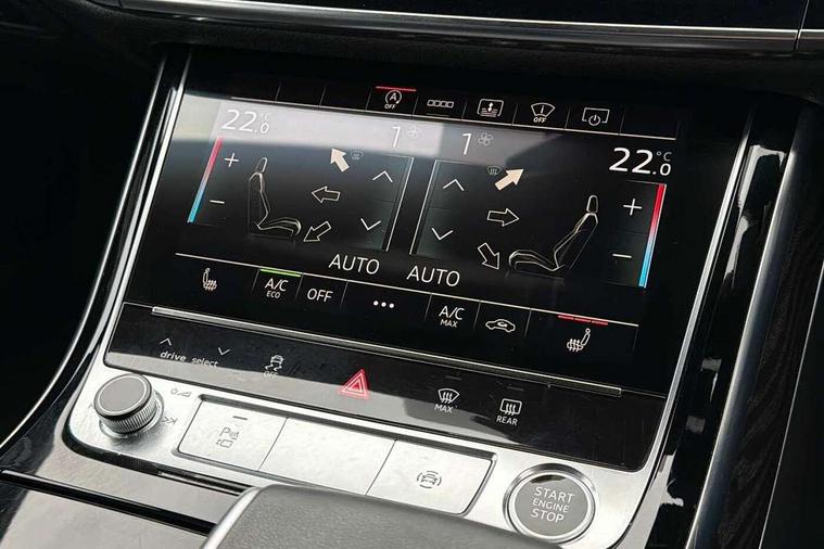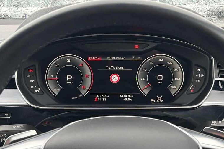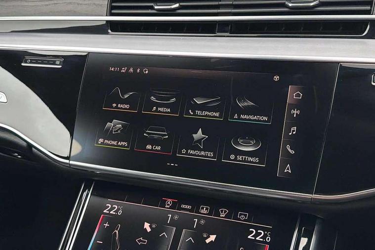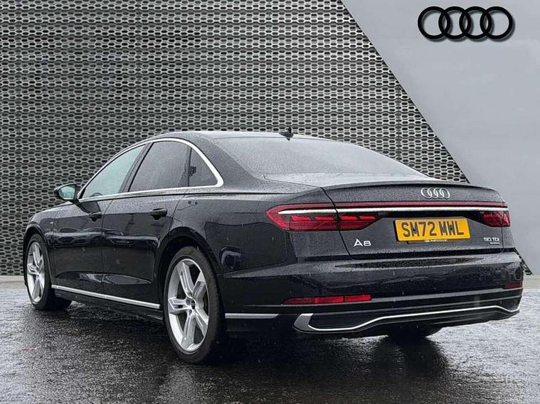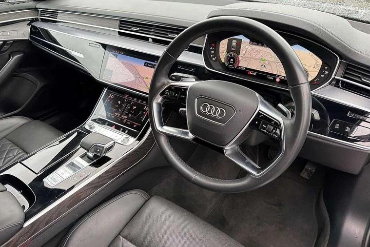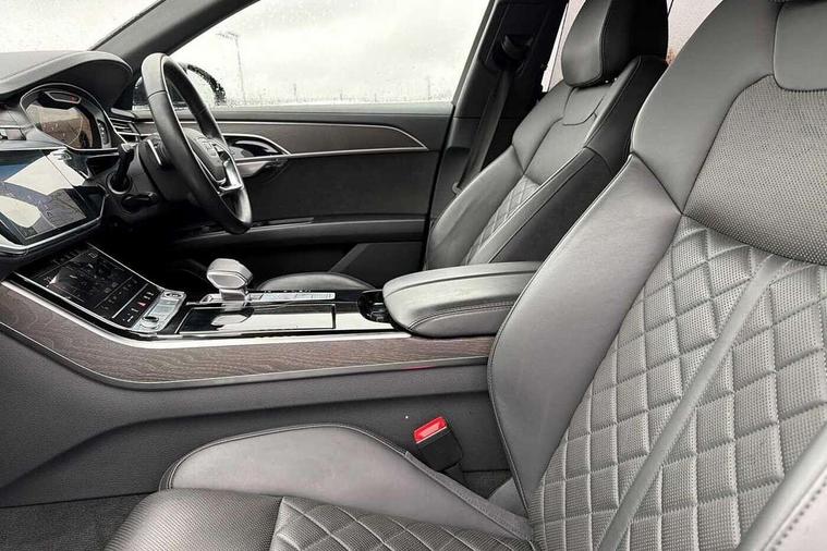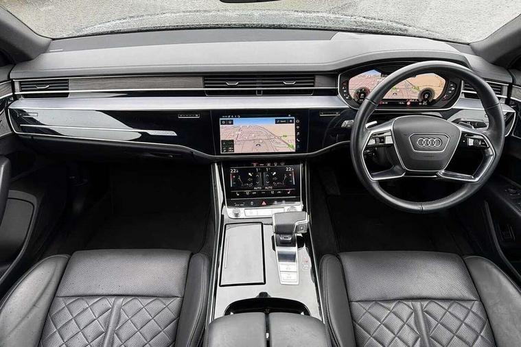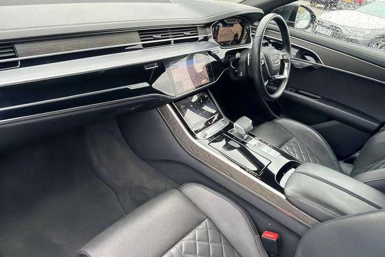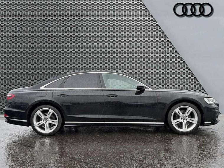 'Lights On' Reminder warning buzzer, Adaptive cruise control with cruise assist, emergency assist, efficiency assist, swerve assist, turn assist and speed limiter, Audi connect safety and service (e-call), Audi drive select, Audi parking system plus with front and rear sensors, Audi phone box with wireless charging, Audi virtual cockpit, Audi wireless smartphone interface, Bluetooth interface, Camera based traffic sign recognition, Convenience key, Electro - mechanical power assisted steering, Head up Display, MMI navigation plus with MMI touch + Twin touch screens with haptic feedback, Operating buttons in black, glass look with haptic feedback including extended aluminium look, Power door closure, Power operated tailgate, Rear central control unit, Rear view camera, Remote fuel filler release, Service interval indicator, 24 litre AdBlue tank, 48V Mild hybrid technology, 8 speed transmission with hill hold assist, 82 litre fuel tank, Adaptive air suspension, Diesel particulate filter, Quattro all wheel drive with self locking centre differential, Audi music interface, Audi sound system, DAB digital radio module, DVD System, MMI radio plus, USB connection, USB ports with charging function in the rear, Acoustic double glazing, Audi space frame, Auto dimming rear view mirror, Body colour bumpers, Body colour door handles, Body colour exterior mirror housings, Body colour side protection with aluminium trim strips, Electric front windows, Electric rear windows with isolation switch, Electrically adjustable heated folding + automatically dimming exterior mirrors with memory function and integrated LED indicators, Front wash/wipe with interval delay, Headlight cleaning system, Heat insulating darkened glass in side and rear windows, Heat insulating glass windscreen, Heated rear window, Heated windscreen washer jets, High beam assist, LED brake lights, LED daytime running lights, LED third brake light, OLED rear lights with changeable rear light signature, Privacy glass, Rear boot, Rear side wing doors, Side skirts, Welcome/leaving lighting, 4 zone control automatic air conditioning, Black cloth headlining, Centre console with cupholders, Comfort centre armrest front, Comfort rear headrests, Door pockets with bottle holder, Driver and front passenger side sunvisors with illuminated vanity mirrors, Dust/pollen filters, Electric front seats with memory function, Front floor mats, Glove compartment cooling, Heated front seats, Heated rear seats, Height/reach electric steering column with easy exit function, Isofix child seat mounting points on outer rear seats, Leather gearknob, Passenger footwell storage net, Roof mounted sunglasses holder, Single front passenger seat, Valcona leather upholstery with front sports seats in diamond quilted, Chrome exterior pack - A8, High gloss styling pack - A8, LED interior lighting pack - A8, S line exterior styling pack - A8, 3 point seatbelts on all rear seats, ABS/EBD, Active front headrest system, ASR traction control, Audi pre sense basic, Audi pre sense front, Black brake calipers, Driver/Front Passenger airbags, EDL traction control, Electromechanical parking brake, ESP, Extended pedestrian protection measures, Front and rear disc brakes, Front and rear side airbags with head airbag system, Front passenger airbag deactivation, Rear child proof door locks, Seatbelt reminder + electric contact in buckle + advanced safety equipment, Tyre pressure loss indicator, Warning triangle and first aid kit, Anti theft alarm tow away protection, Anti-theft wheel bolts and wheel loosening detection, Remote central locking, Dark matt brushed aluminium lower inlays,