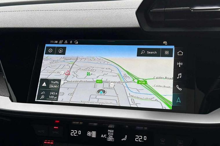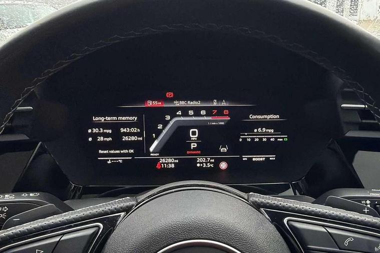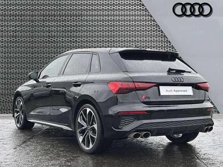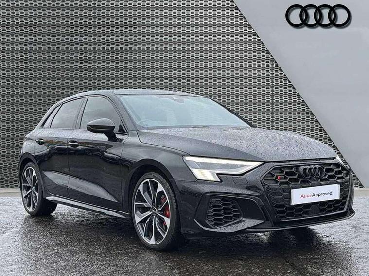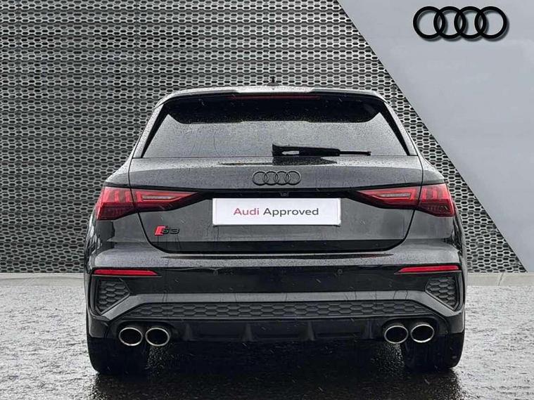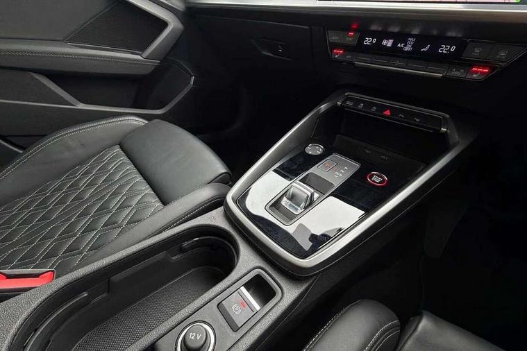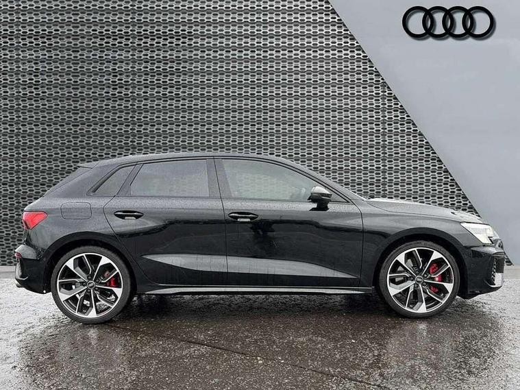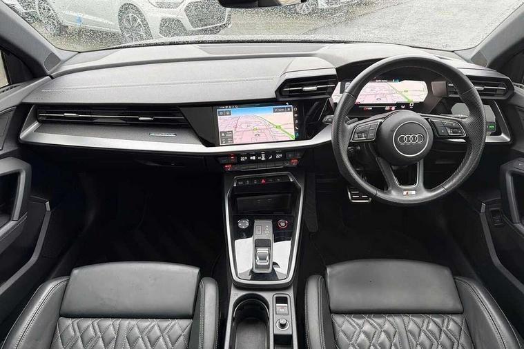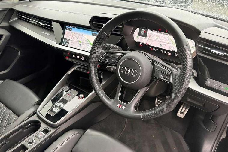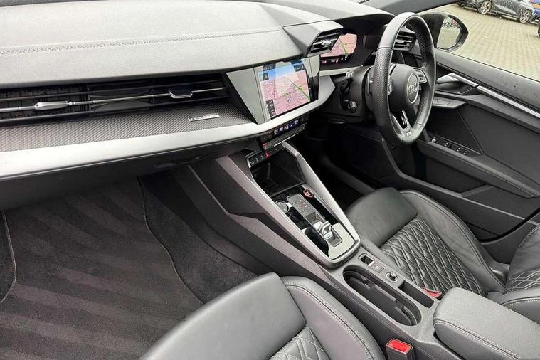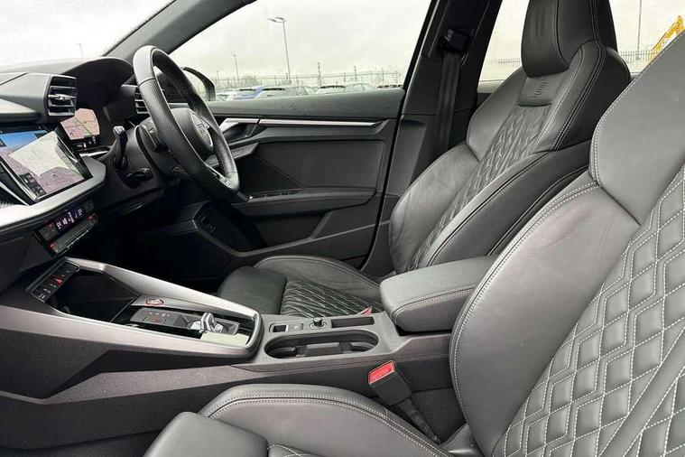 Adaptive cruise assist, Audi drive select (Auto, Comfort, Dynamic, Efficiency and Individual), Audi smartphone interface, Audi virtual cockpit plus - 12.3" full HD resolution dynamic digital instrument cluster, Automatic start/stop system with recuperation, Bluetooth interface, Collision avoidance assistant, e-Call (emergency call), Head up Display, Lane change assistant with exit warning system and rear cross traffic alert, Lane departure warning system, MMI Navigation Plus with high resolution 10.1" colour touch screen display, Power operated tailgate - Luggage compartment lid opens/closes electrically, Progressive steering, Service indicator, Trip computer, Voice control system with natural language interaction, Quattro permanent all wheel drive, S suspension with damper control, 2xUSB-C connection with data and charging functions, DAB Digital radio, 3rd brake light, Acoustic glass windscreen, Audi Beam uses LEDs to project Vorsprung onto the ground as you exit your S3, Auto dimming frameless rear view mirror, Carbon door mirror housings, Dual branch oval twin tailpipes in chrome plated finish, Electrically adj heated/folding + automatically dimming exterior mirrors with memory + automatic kerb side function for passenger side exterior mirror, Front electric windows, Headlight washers, Heat insulating glass windscreen, Illuminated door sills with aluminium inserts at the front with S logo, Integrated LED indicators in door mirrors, LED daytime running lights, Light and rain sensors, Privacy glass - dark tinted rear window, rear door and side windows, Rear electric windows, Rear side air outlets in grained matt black, Rear side wing doors, Rear wiper, 12V socket and storage compartment in front centre console, 3 seat bench in 2nd row, 3 spoke leather multifunction steering wheel with gear shift paddles, 4 way electrically adjustable lumbar support for driver and front passenger, 60/40 split folding rear seat bench, Black cloth headlining, Dual zone electronic climate control, Fine Nappa leather upholstery with front sports seats S embossed logo, Front and rear centre armrest in artificial leather, Front and rear headrests, Front/rear floor mats, Height and reach adjustable steering wheel, Interior lighting - glove compartment light and right hand side, Luggage compartment floor covering, Seat side bolsters, Single front passenger seat, Stainless steel pedals and front footrest in black, Aluminium interior elements pack - A3 Sportback, Black styling pack - A3 Sportback/S3, Body styling design pack - S3, Extended ambient lighting pack - A3 Sportback, Storage pack - A3 Sportback, Technology pack pro with 360 camera - A3 Sportback/Voursprung, 3x3 point rear seat belts, Driver and front passenger airbag with passenger airbag deactivation, Electronic Stabilisation Control (ESC) including ABS, ASR and EDL, First aid kit with warning triangle and 2 safety vests, Front side airbags with head airbags and interaction airbag, Pre-sense front with pedestrian and cyclist detection, Seatbelt monitoring, Tyre pressure loss indicator, Anti theft alarm, Anti-theft wheel bolts, Electronically operated child locks, Immobiliser, Remote control central locking, Carbon inlays, accent surfaces in the dashboard and centre console in platinum grey silk effect paint finish,