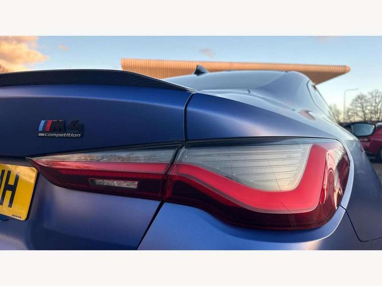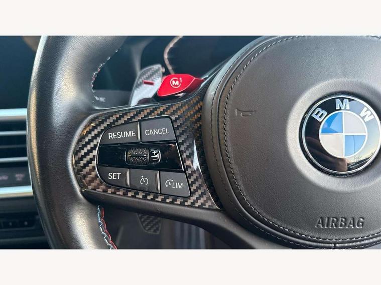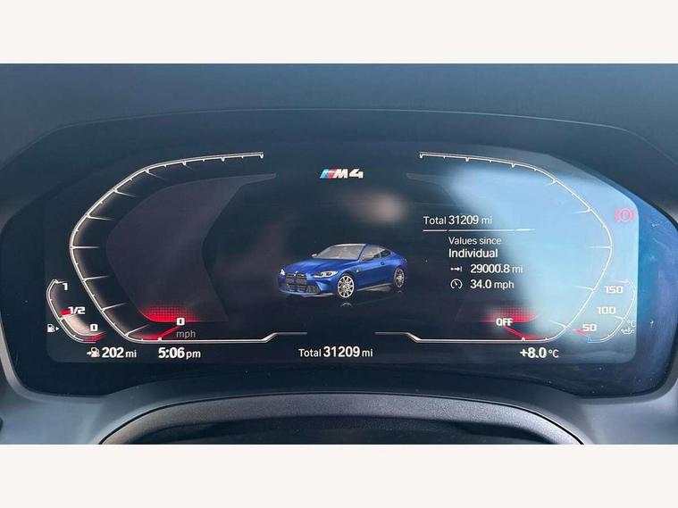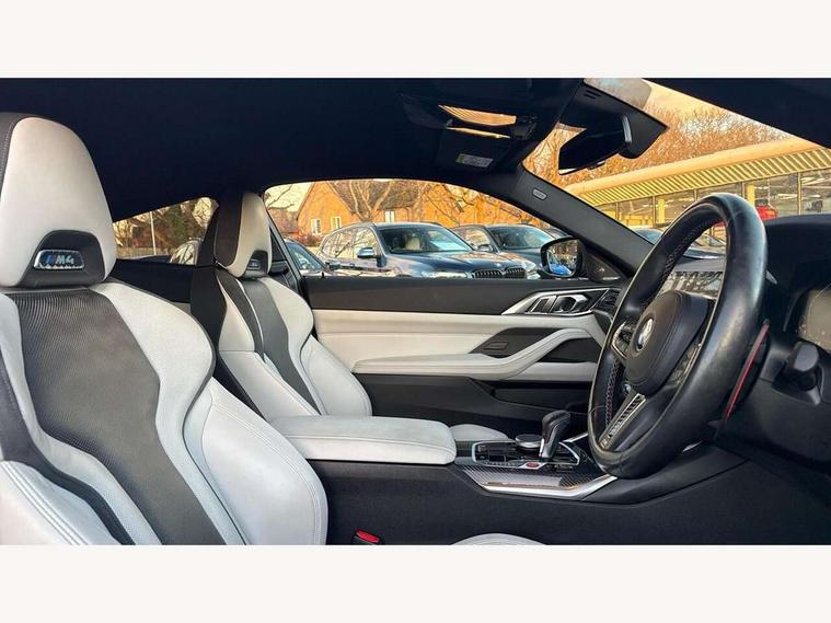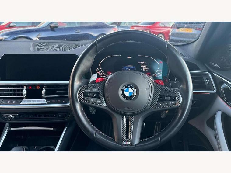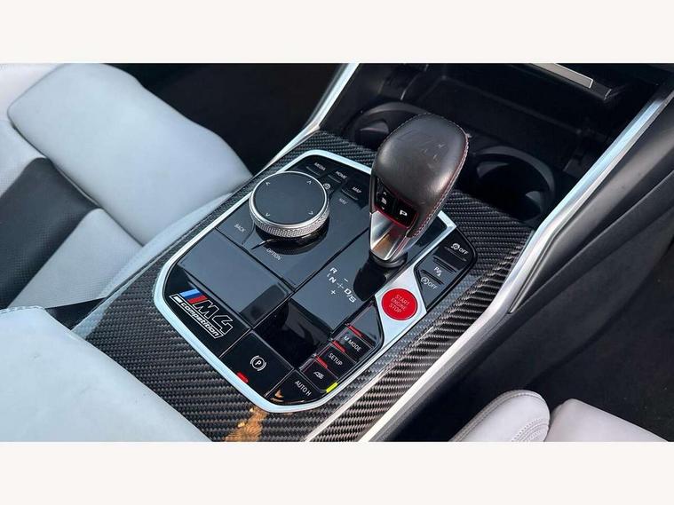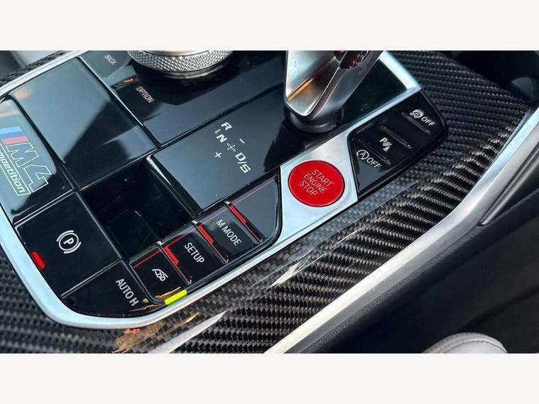 Automatic start/stop system, Bluetooth with USB, BMW gesture control, BMW iDrive controller on centre console, BMW legal emergency call, BMW Live Cockpit Professional sat nav system with 12.3" instrument display and high resolution control display, BMW Online services, BMW Teleservices, Brake pad wear indicator warning light, Door/boot open warning light, Electric Power Steering (EPS) with Servotronic, Head up Display, Instrument cluster with extended contents, Lights on warning, Oil sensor for level and grade, warning by check control system, Oil temperature gauge, On board computer, On board diagnostics, Optimum shift indicator, Outside temperature display, Pull away assistant, Run flat indicator, Service interval indicator, Speed limiter, Adaptive M Sport suspension, M Drive Professional including track mode, laptimer, traction control & Drift analyser, M Sport differential, M steptronic sport transmission with drivelogic, 8 programmable favourite buttons, Auxiliary point for auxiliary devices, BMW professional radio/CD/MP3, DAB Digital radio, Harman/Kardon loudspeaker system, Auto dimming driver's door mirror, Auto dimming rear view mirror, Automatic headlights + automatic windscreen wipers, Black chrome exhaust tailpipes, Black model designation badges, BMW high gloss shadow line with extended contents, BMW Individual shadowline lights, Body colour bumpers, Body colour door handles, Carbon fibre reinforced plastic (CFRP) roof, Day time running light, Door mirror integrated indicators, Door sill finishers with aluminium inserts, Dynamic brake lights, Electric adjustable heated door mirrors, Electric folding door mirrors, Follow me home headlights, Front and rear bumper system, Front electric windows with open and close fingertip control, anti trap facility and comfort closing, Heat protection, sun protection glazing, Heated rear window with automatic switch off, High beam assistant, High gloss black frameless kidney grille with M badge, LED number plate light, LED tail lights with 3D L-shaped LED light design, M designation, Mirror glass aspheric on driver's side, convex on passenger side, Rear fog lights, Rear reflectors, Shark fin roof aerial, Visible VIN plate, Welcome lighting, Windscreen wipers with integrated washing jets, 12V power socket in front centre console with blanking plug, 2 cupholders in front centre console, 2 rear head restraints, 40:20:40 manually split folding rear seat with two tilt positions for backrest, Ambient lighting, Anthracite headlining, Carbon fibre centre console incl. cover for cupholders, Carbon fibre decorative steering wheel finishers, Carbon fibre shift paddles, Carbon fibre strip in instrument panel on front passenger side, Compartment in front of cupholder, Driver/passenger sunvisors with illuminated vanity mirrors + covers, Electric front seats + driver memory, English handbook, Footwell lighting, Front and rear door exit lights, Front door storage bins with bottle holder, Front interior light, Front isofix attachment + airbag deactivation, Front seat backrest width adjustment, Front seats lumbar support, Front/rear door armrests, Gearshift lever with embossed M badge, Heated front seats, Height adjustable front headrests, Interior mirror lighting, Isofix on 2nd row outer seats, Lockable/illuminated glovebox, Luggage compartment lighting, Rake/reach adjustable steering wheel, Storage compartment in rear doors, Storage tray and compartment with cover in centre console, Three zone automatic air conditioning, Toolkit located in luggage compartment, Additional storage compartment pack - M4, Connected package professional - M4, High gloss shadowline exterior trim pack - M4, 4 x 3 point seatbelts, ABS/EBD, Automatic Stability Control (ASC), Brake energy regeneration, Brake fade compensation, Compound structure brake discs, Cornering brake control (CBC), Crash sensor, Driver/Front Passenger airbags, Dry braking, Dynamic brake control, Dynamic Stability Control with M Dynamic mode, Dynamic Traction Control - DTC, Electromechanical parking brake, Front and rear head airbags, Front seat side impact airbags, Front seatbelt pretensioners + load limiters, Hill start assist, M Sport seat belts, Seatbelt warning, Side impact protection, Two tone horn, Tyre pressure sensor, Warning triangle and first aid kit, Electronic immobiliser, Remote central locking, Thatcham cat 1 remote alarm, Vehicle Key with 4 buttons including the integrated key, Galvanic finish to control surrounds, High gloss black interior trim, Tyre repair kit,