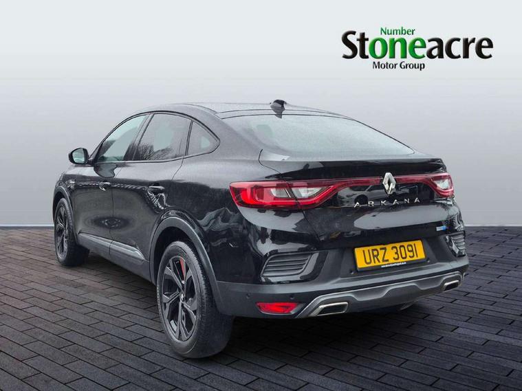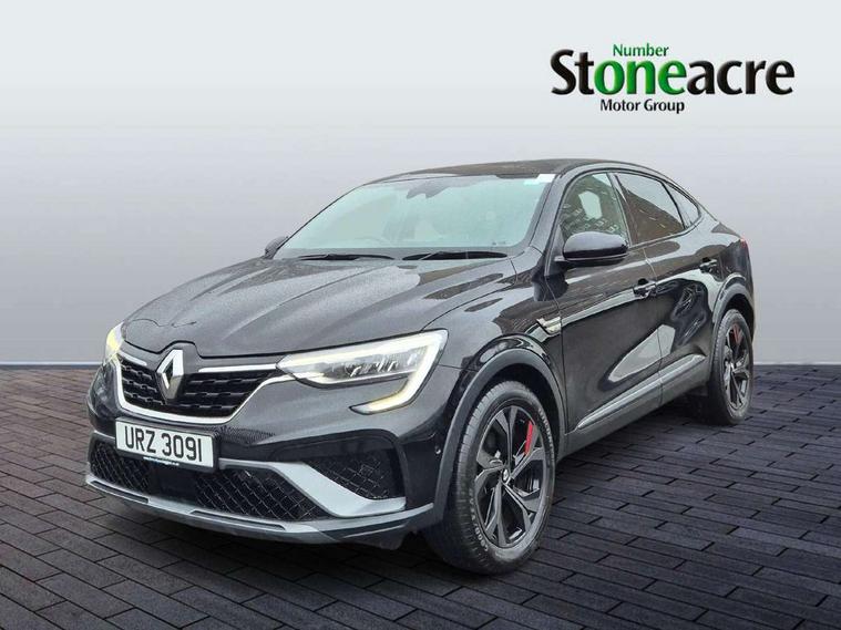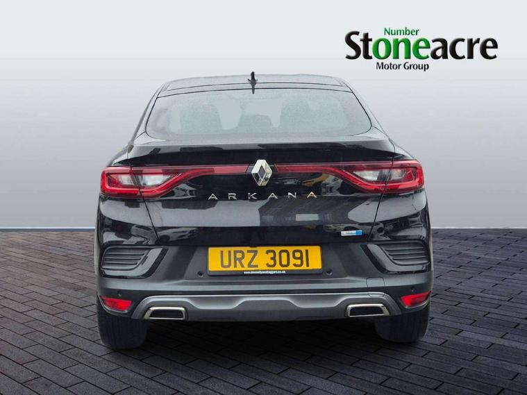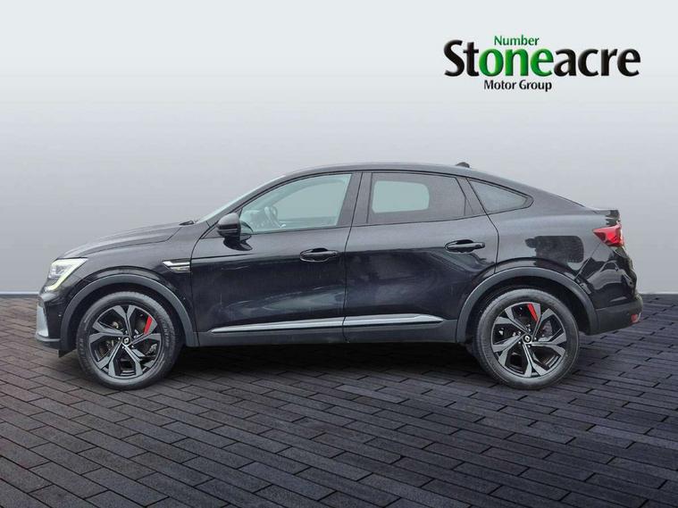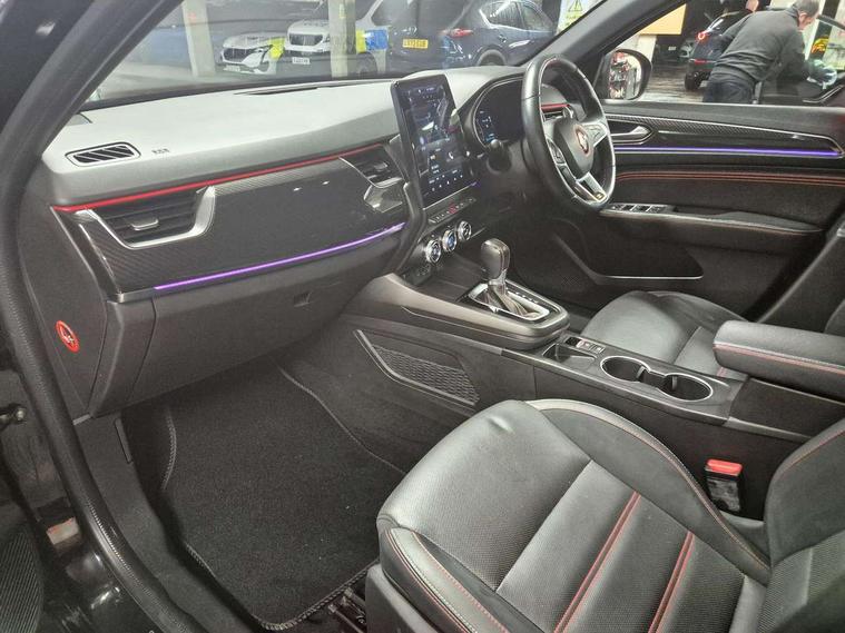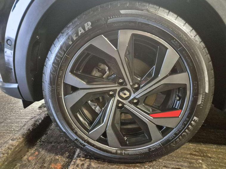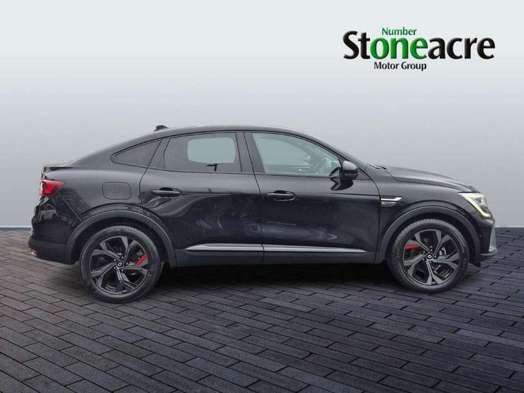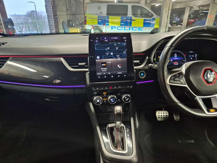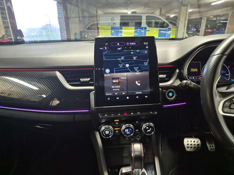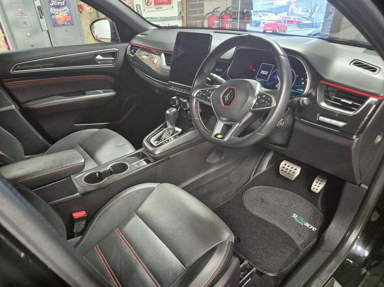7" TFT Driver information display, Blind spot warning, Bluetooth system, EASY LINK 9.3" portrait touchscreen with navigation, Google search and traffic information, eCall emergency call system, Eco mode, EV button to activate pure mode, Front and rear parking sensors, Gear change indicator, Lane departure warning, Lane keep assist, Multi-sense - 3 driving modes and 8 ambient lighting, Rear cross traffic alert, Rear view camera, Renault automatic emergency assist, Smartphone integration compatible with Apple CarPlay and Android Auto, Traffic sign recognition with over speed prevention, Trip computer, Variable assistance electric power steering, Wireless phone charger, DAB radio, USB port, 3rd brake light, Auto dimming rear view mirror, Automatic headlights, Automatic high / low beam, Automatic windscreen wipers with rain sensor, Black side door protection with gun metal insert, Body coloured bumpers, C-shaped LED front signature lighting, Chrome decopart on wing (fender molding) with R.S. Line badge, Double chromed exhaust tailpipes elements, Extra tinted rear windows and tailgate, Frameless rear view mirror, Front and rear electric windows, Front bumper with F1 blade and honeycomb front grille, Front driver window with one touch facility and anti-pinch function, Front grille with chrome on upper part, Full LED headlights, Glossy black door mirror and lower window lining, Gun Metal front and rear skid plates, Heated rear window, R.S. Line badges on front wing and hatch door, Rain sensor, Rear windscreen wiper, Shiny black shark fin antenna, Side mirrors adjustable electrically, electrically foldable, with defrosting and temperature sensor, automatically foldable at vehicle closure, 3 seat bench in 2nd row, 60:40 split and fixed base rear seats, Aluminium pedals, Automatic climate control with combined filter, humidity sensor and AQS, Black interior roof lining, Carbon style dashboard, Central console with storage, Driver's seat height adjustment, Electrically adjustable front seats, Front and rear head restraints, Height and reach adjustable steering wheel, ISOFIX child seat fixing points on rear outermost seats, LED front and rear roof lights, Passenger seat height adjuster, R.S. line black suede-leather upholstery with red/grey stiching, R.S. Line perforated leather steering wheel with red/black harmony and R.S. Line badge, Rear air vents, Red inserts on air vents, Single front passenger seat, Parking Pack - Hands-free parking & flank protection - Arkana, Winter pack - Arkana, 3x3 point rear seat belts, ABS+EBA, Active emergency braking system, B Brake Mode - One pedal driving with increased regenerative braking, Distance warning alert, Driver airbag, Driver and passenger front and side airbag deactivation, Driver and passenger side airbags, Driver height adjustable seat belt, Electronic parking brake with auto hold, ESC (Electronic Stability Control), Front and rear no seatbelt warning sound, Front curtain airbags, Front head airbags, Hill start assist, Passenger airbag, Tyre pressure warning light, Anti drill door locks and locking fuel cap, Central door locking, Deadlocking system, Hands free keycard with Keyless access and start, RAID (Renault Anti-Intruder Device) automatic door locking, Rear side wing door and window child locking function (front driver door control panel), Superlocking, Thatcham alarm, 18" Silverstone diamond alloy wheels with red inserts,