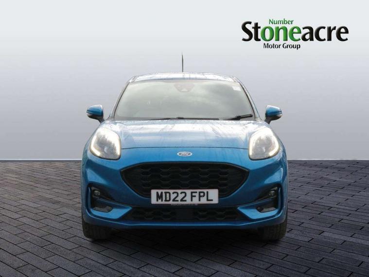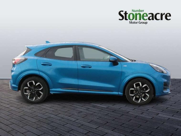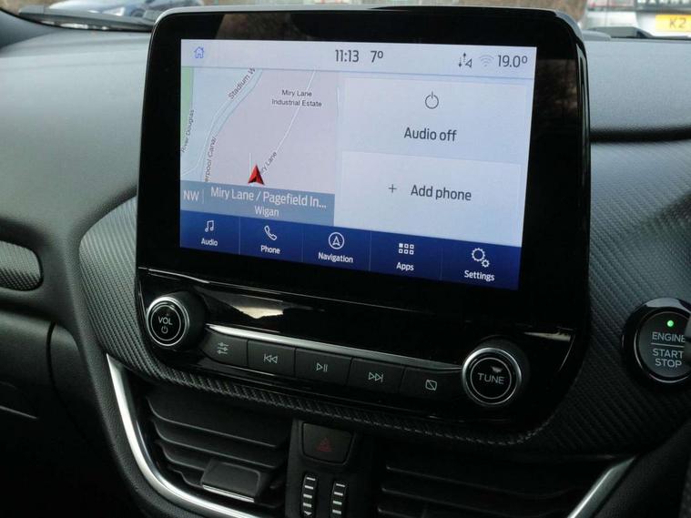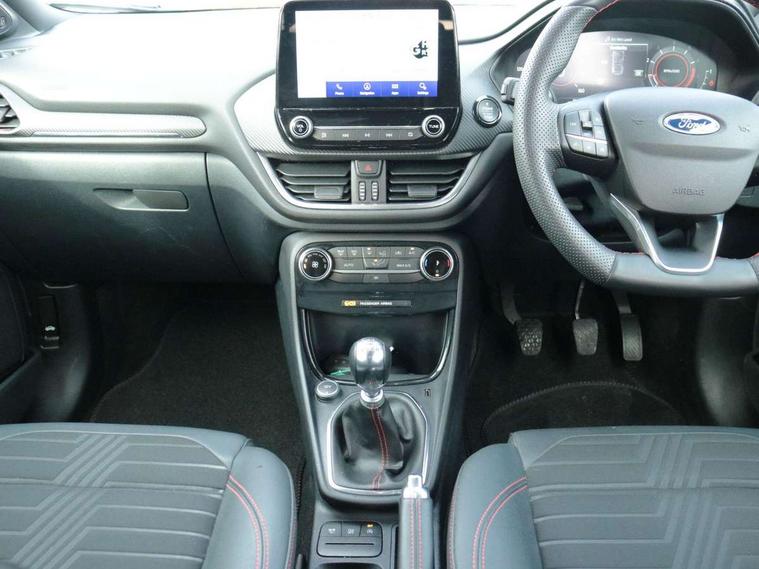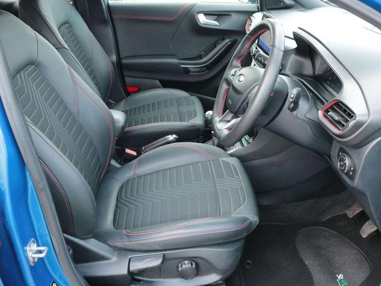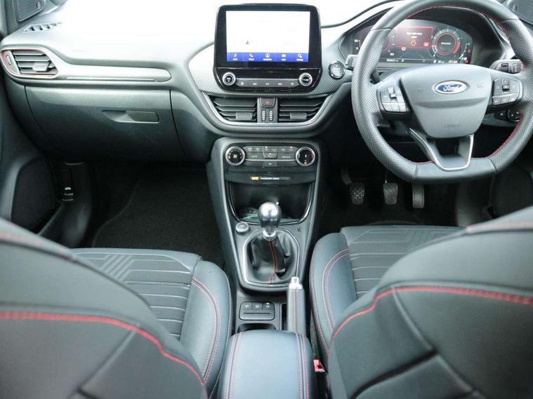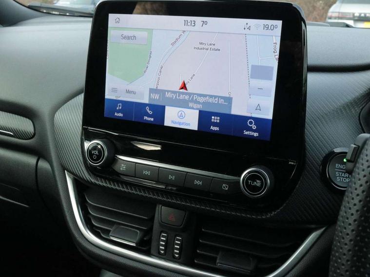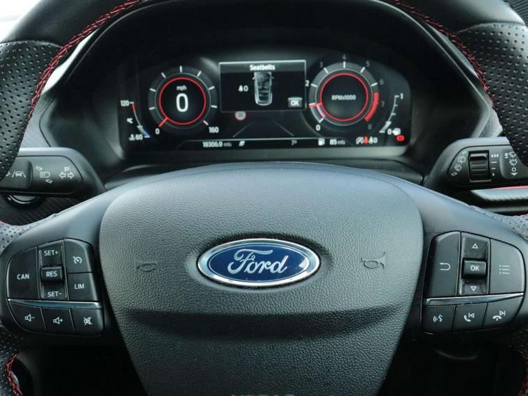 Driver impairment monitor, Emergency call service, Ford easy fuel, Full digital 12.3" instrument cluster, Lane keeping aid with lane departure warning, Power assist steering, Power start button, Rear parking sensor, Selectable drive modes(Normal, Eco, Sport, Slippery and Trail), Speed sign recognition, Sport suspension, Automatic headlights with auto high beam, Automatic rain sensing wipers, Front fog lamps, LED daytime running lights, LED rear lamps, Power foldable heated door mirrors with puddle lamps, Privacy glass to side rear windows and tailgate glass, Quickclear heated windscreen, Rear side wing doors, Rear wiper, ST-Line body styling kit with unique grille and large body colour rear spoiler, Third brake light, 3 seat bench in 2nd row, Centre console with armrest and stowage, Ford megabox extended bootspace, Front and rear head restraints, Front floor mats, Manual 4 way driver seat adjust with lumbar adjustment, Manual 4 way passenger seat with lumbar seat adjustment, Sensico partial premium upholstery, Single front passenger seat, ST-Line flat bottomed sensico leather steering wheel with leather handbrake and aluminium gear knob, Wireless charging pad with electronic air temperature control (EATC), B&O Premium Audio system + Ford SYNC 3 navigation pack - Puma, Driver assistance pack with Lane departure warning - Puma, 3 rear seatbelts, Child safety lock, Electronic stability control (ESC) and hill start assist, Pedestrian/cyclist detection & post-collision braking, Pre collision assist with autonomous emergency braking, Tyre pressure monitoring system (TPMS), Thatcham alarm, Carbon look interior deco spears,