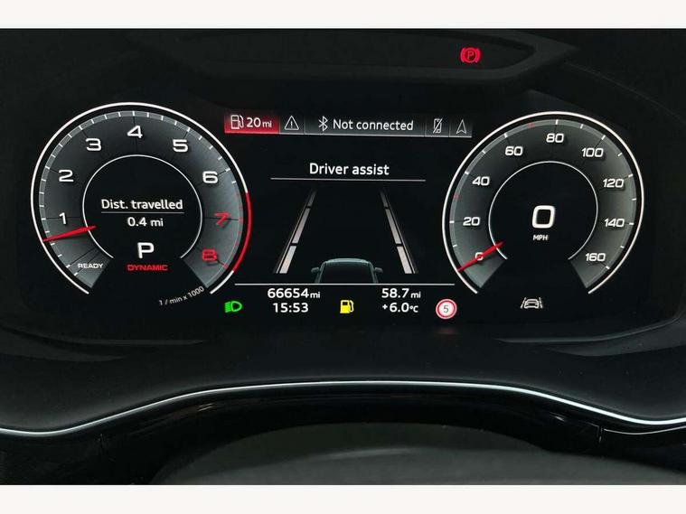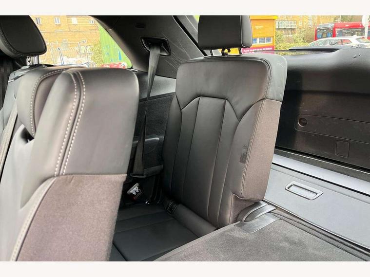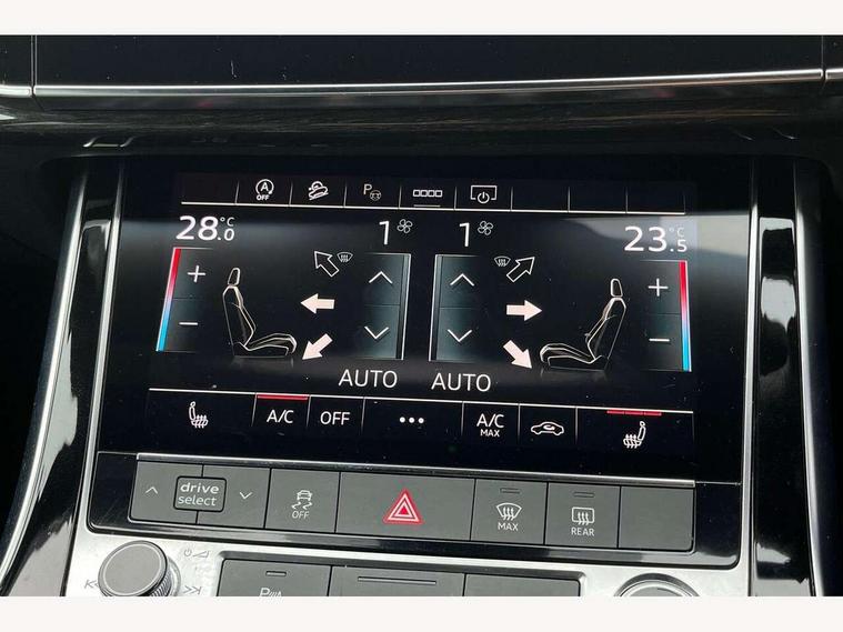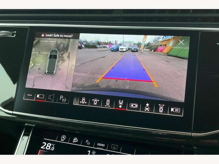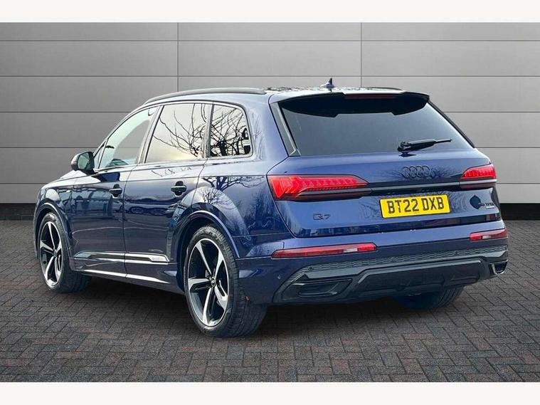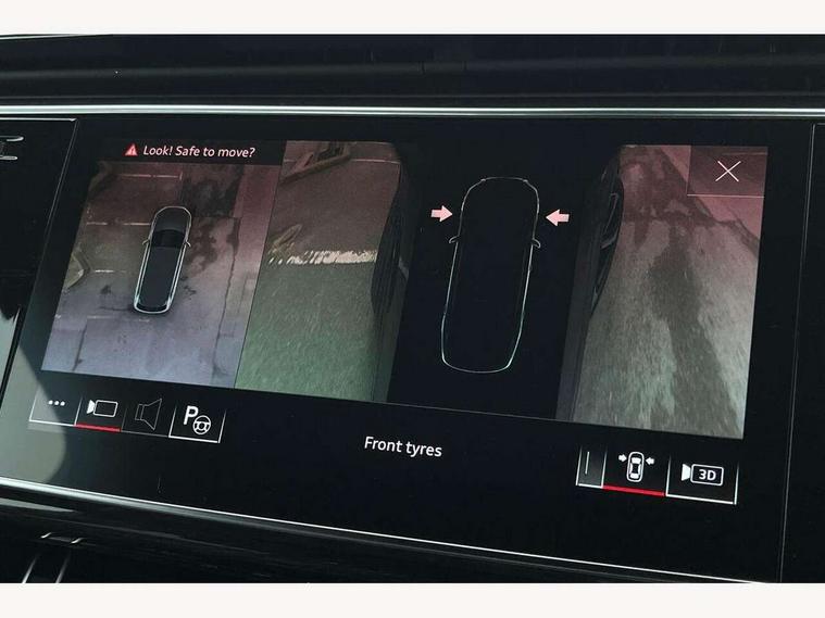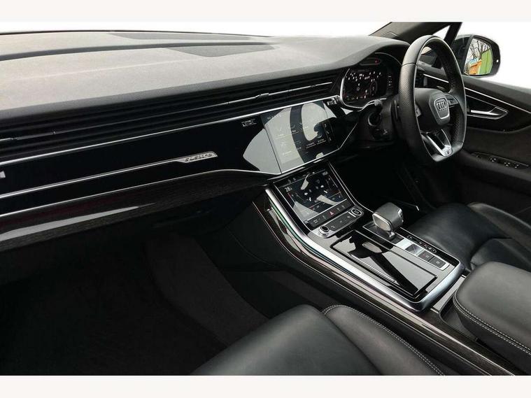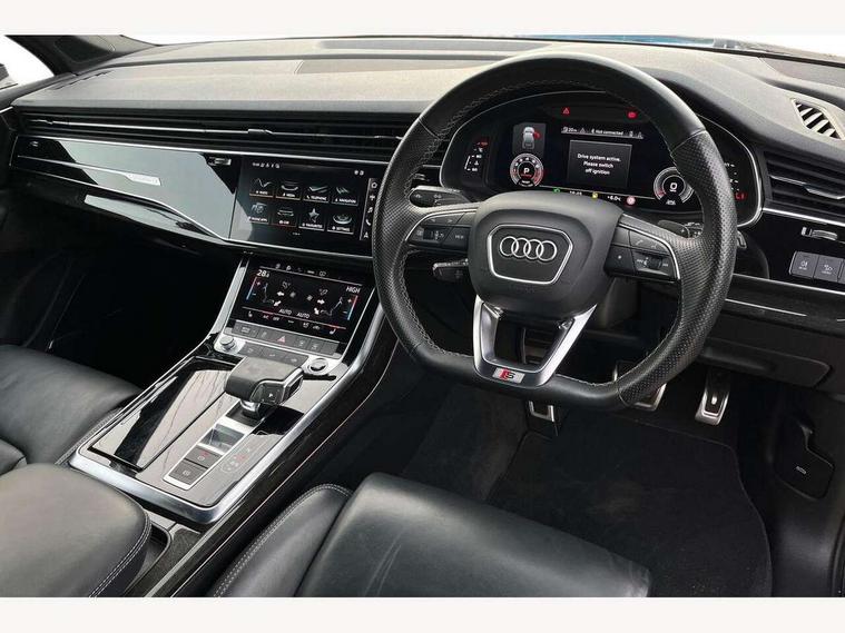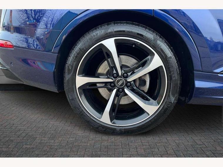 Audi connect safety and service (e-call), Audi connect with Amazon Alexa Integration, Audi drive select (Auto, Comfort, Dynamic, Efficiency, Individual, Off-road and All road), Bluetooth interface, Camera based traffic sign recognition, Electromechanical steering, MMI navigation plus with MMI touch screens includes 10.1" and 8.6" screens with haptic feedback, Natural voice recognition, Parking system plus with 360 degree display (front, rear and side sensors) - acoustic and visual park assist system, Power operated tailgate, Rear view camera, Smartphone interface includes wireless Apple carplay/Android Auto, Start/stop system, 48V Mild hybrid technology, 85 litre fuel tank, Adaptive air sports suspension, Quattro all wheel drive with self locking centre differential, Audi music interface - front 2 USB-C ports with charger and data functions, Audi sound system with 6 channel amplifier, 180 watt amplifying capacity and 10 loudspeakers including subwoofer, DAB digital radio module, 3rd brake light, Audi matrix LED headlights with dynamic front and rear indicators, Auto dimming frameless rear view mirror, Black roof rails, Bumpers in contrast paint scandium grey finish includes door trim and wheel arch trim strips, inlays in door strip contain quattro embossing, Electrically adj heated/folding + automatically dimming exterior mirrors with memory + automatic kerb side function for passenger side exterior mirror, Heat insulating glass in windshield, Integrated LED indications in door mirrors, LED daytime running lights, LED rear tail lights, Privacy glass - dark tinted rear and rear side windows from B-pillar backwards, Rear side wing doors, Rear wiper, 2 seat bench in 3rd row, 3 seat bench in 2nd row, 4 zone deluxe automatic climate control, 7 seat layout with ISOFIX points for the front passenger seat and rear passenger seat, Black cloth headlining, Comfort front centre armrest, Electric adjustable front seat with 4 way lumbar support, driver memory functionality, Folding rear seats, Front head restraints, Front/rear floor mats, Heated front seats, Illuminated door sill trims with S logo, LED interior ambient lighting, Luggage compartment cover, Luggage compartment sill protection in stainless steel, Rear head restraints, Single front passenger seat, Stainless steel pedals, Sunvisors with illuminated vanity mirrors, Titanium black styling pack - Q7/SQ7, 3 point seatbelts on all rear seats, Audi pre sense front, Child locks on rear doors, Driver and front passenger, front side and curtain airbags, Electromechanical parking brake, Electronic Stabilisation Control (ESC) including ABS, ASR and EDL, Extended pedestrian protection measures, Hill hold assist, Seatbelt monitoring, Tyre pressure loss indicator, Warning triangle and first aid kit, Anti theft alarm, Anti-theft wheel bolts and wheel loosening detection, Keyless Go, Remote central locking, Polished oak trim with grey finish inlay, Tool kit, Tyre repair kit,